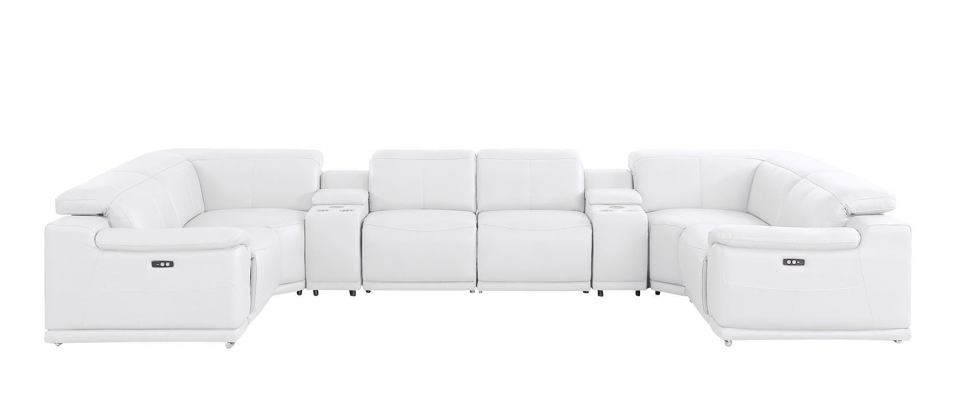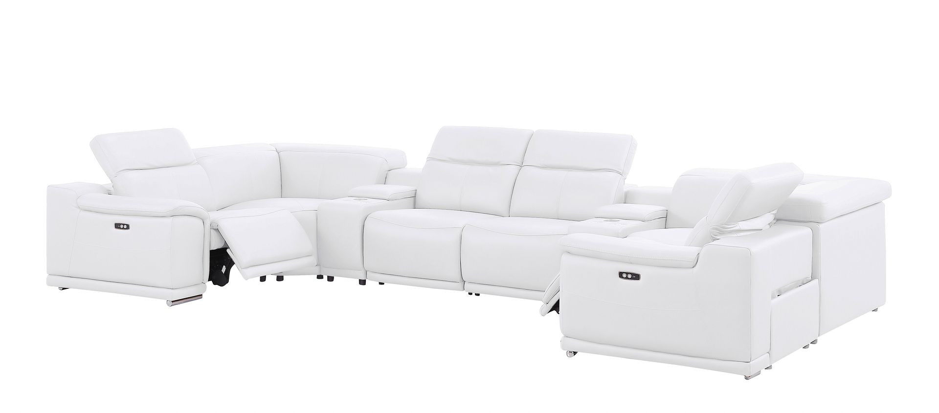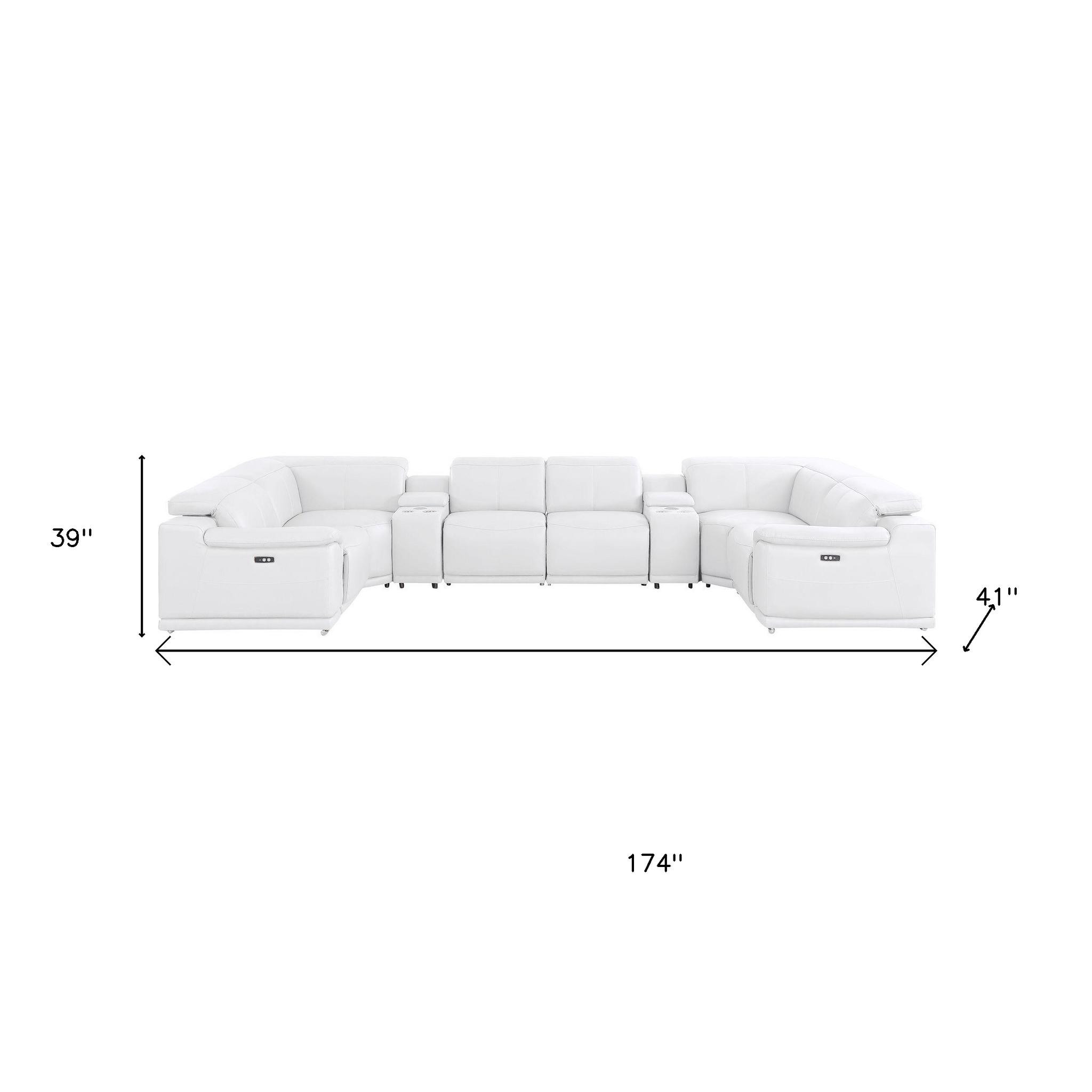 Made of the highest quality, supple leather, this white leather modular u shaped eight piece corner sectional with console will be the star of your space. The high-grade premium leather used makes your lounging luxuriously comfortable and adds an elegant appeal to your space. Pillow top arms offer a comfy place to rest. Power - push button recline allows you to truly rest, lounge and even sleep comfortably. Silver metal legs effortlessly elevate the room and add a touch of contemporary design. A great showpiece for your room, this sectional is a must have. 39.00-inch h x 174.00-inch w x 41.00-inch d.