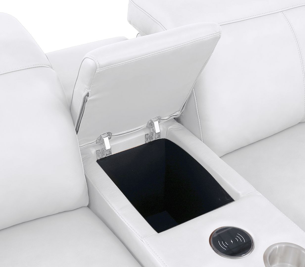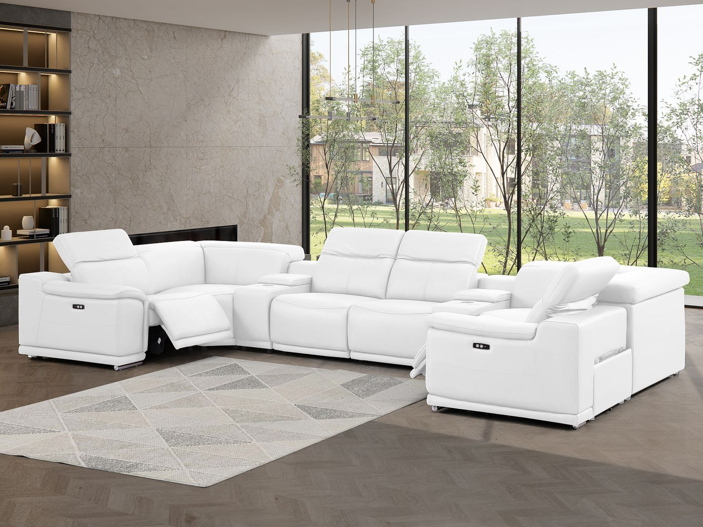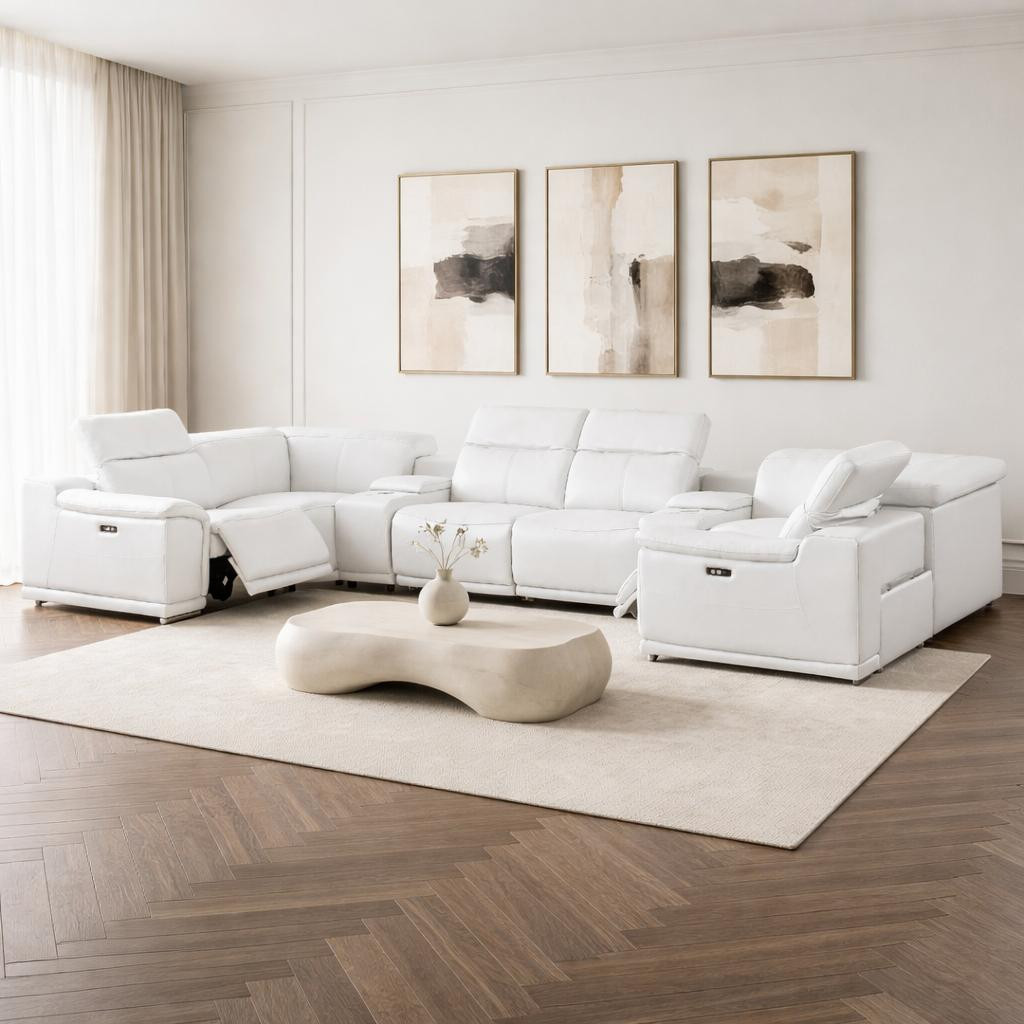 Made of the highest quality, supple leather, this white leather modular u shaped eight piece corner sectional with console will be the star of your space. The high-grade premium leather used makes your lounging luxuriously comfortable and adds an elegant appeal to your space. Pillow top arms offer a comfy place to rest. Power - push button recline allows you to truly rest, lounge and even sleep comfortably. Silver metal legs effortlessly elevate the room and add a touch of contemporary design. A great showpiece for your room, this sectional is a must have. 39.00-inch h x 174.00-inch w x 41.00-inch d.