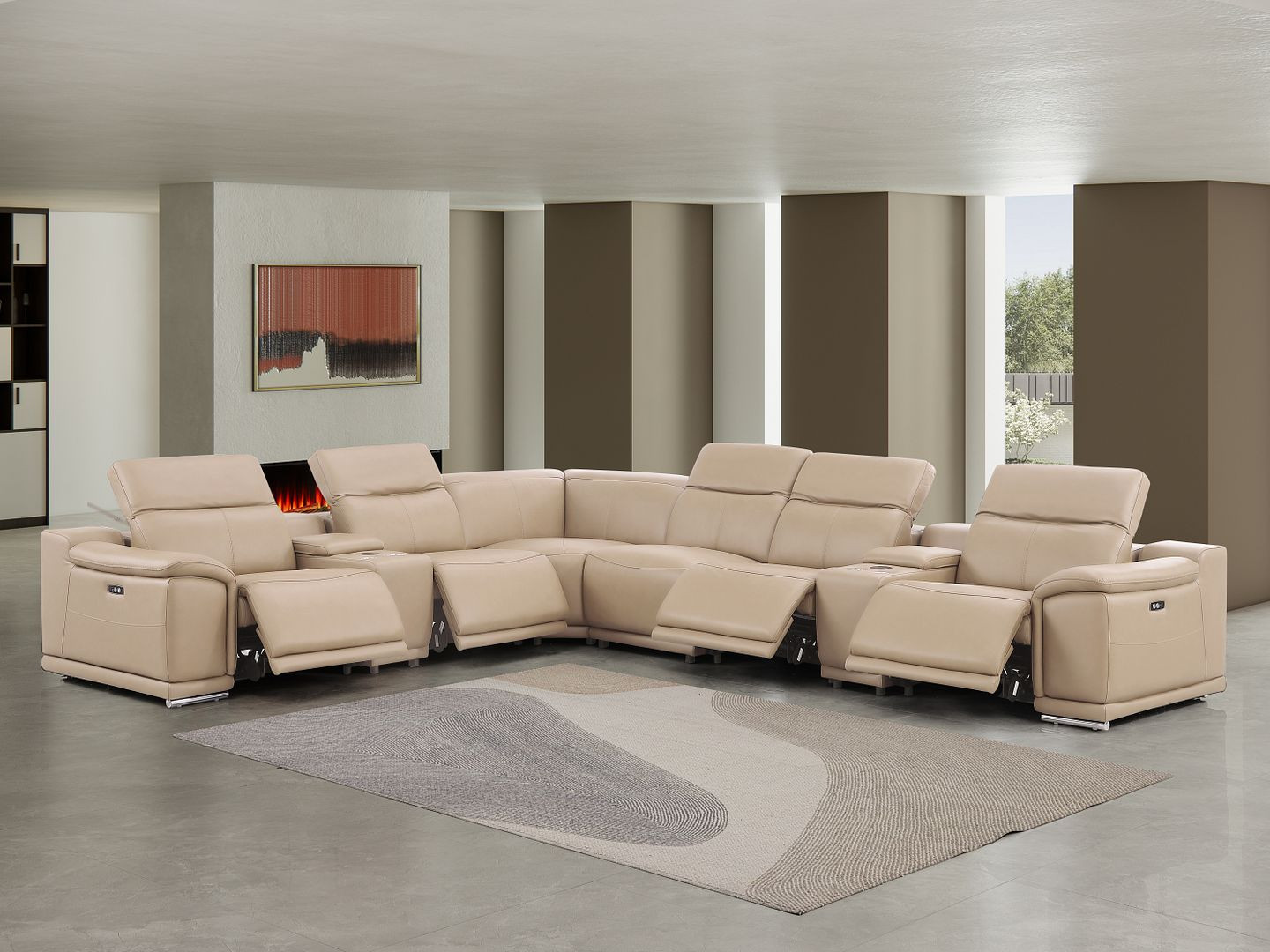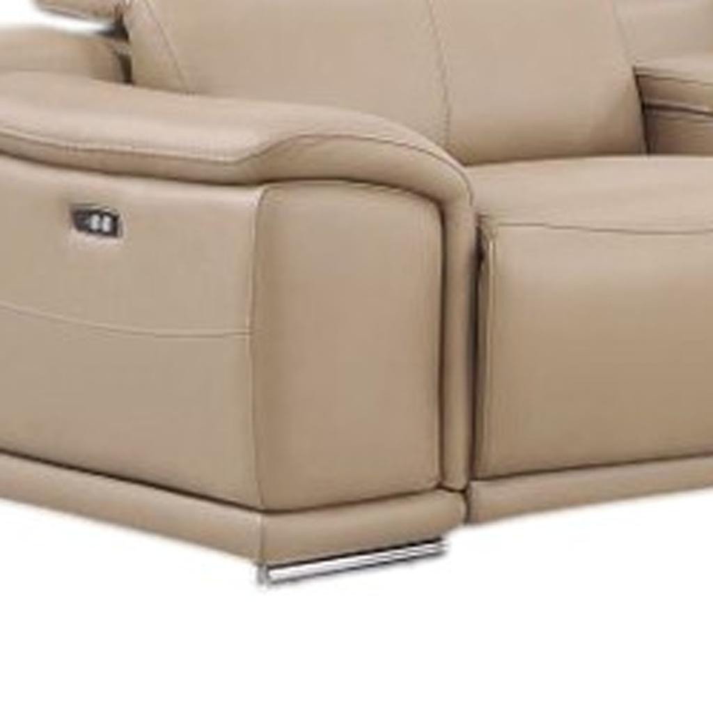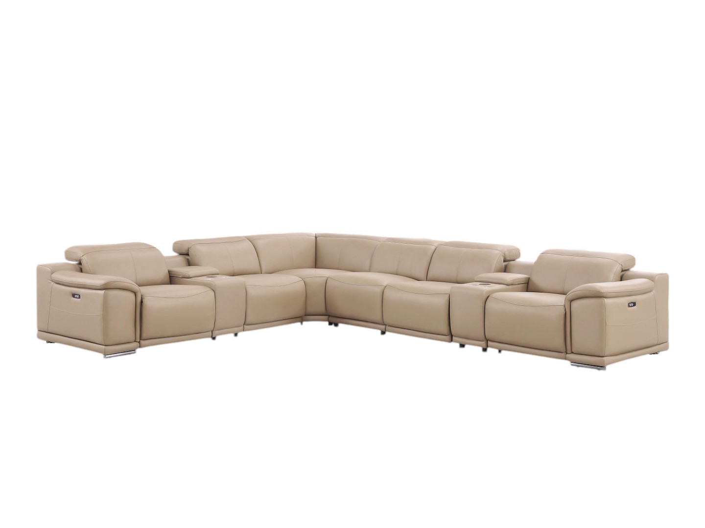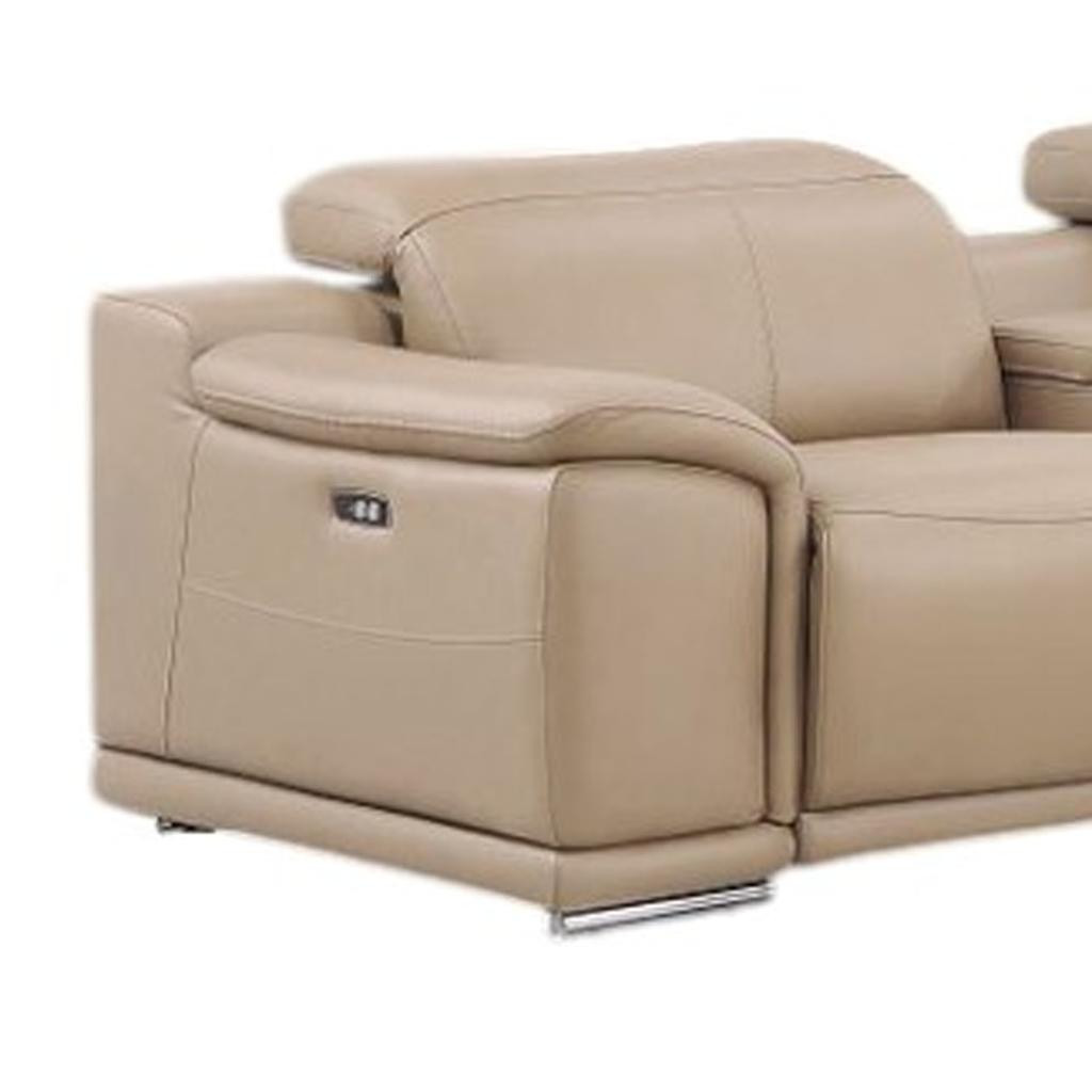 Made of the highest quality, supple leather, this beige leather modular l shaped eight piece corner sectional with console will be the star of your space. The high-grade premium leather used makes your lounging luxuriously comfortable and adds an elegant appeal to your space. Pillow top arms offer a comfy place to rest. For the ultimate in relaxation, this sectional includes power - push button recline that turns it into a comfy lounge for sleeping or resting. Silver metal legs effortlessly elevate the room and add a touch of contemporary design. A great showpiece for your room, this sectional is a must have. 39.00-inch h x 153.00-inch w x 41.00-inch d.