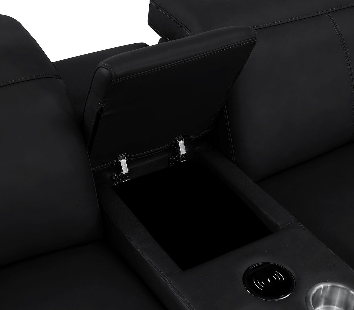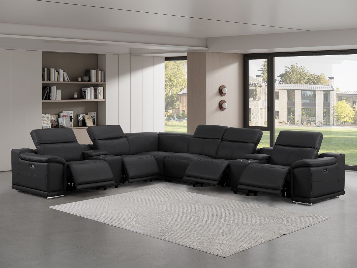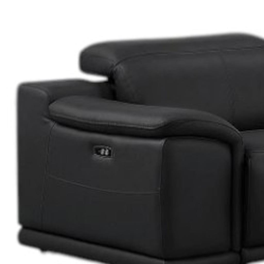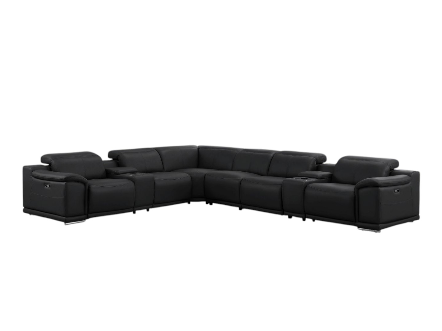 Take your relaxation to the next level with this super soft and comfortable black leather modular l shaped eight piece corner sectional with console. The high-end premium leather used makes your lounging luxuriously comfortable and adds an elegant appeal to your space. Pillow top arms offer a comfy place to rest. For the ultimate in relaxation, this sectional includes power - push button recline that turns it into a comfy lounge for sleeping or resting. Silver metal legs effortlessly elevate the room and add a touch of contemporary design. Great for everyday lounging and for entertaining, sectionals are an ideal way to seat multiple people. 39.00-inch h x 153.00-inch w x 41.00-inch d.