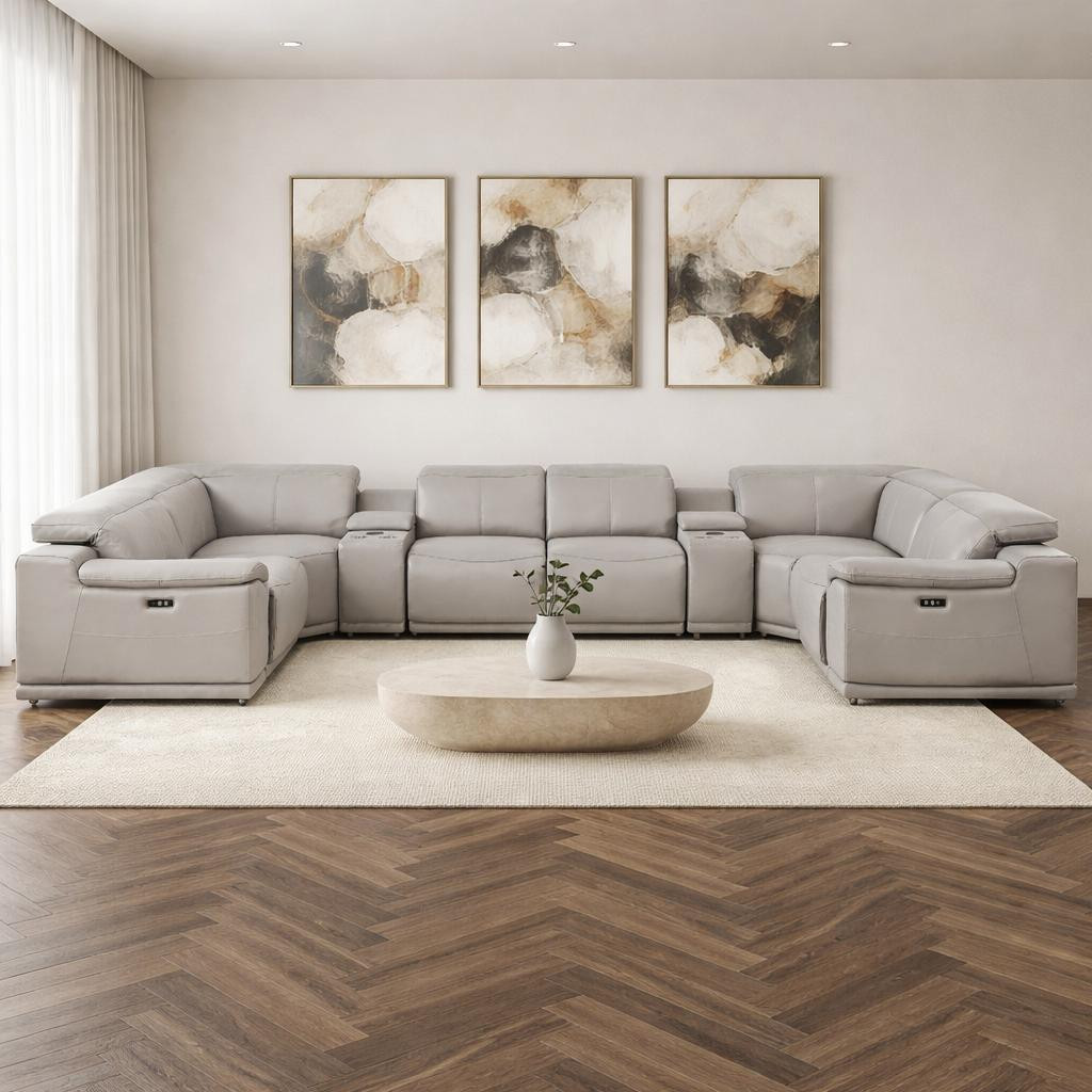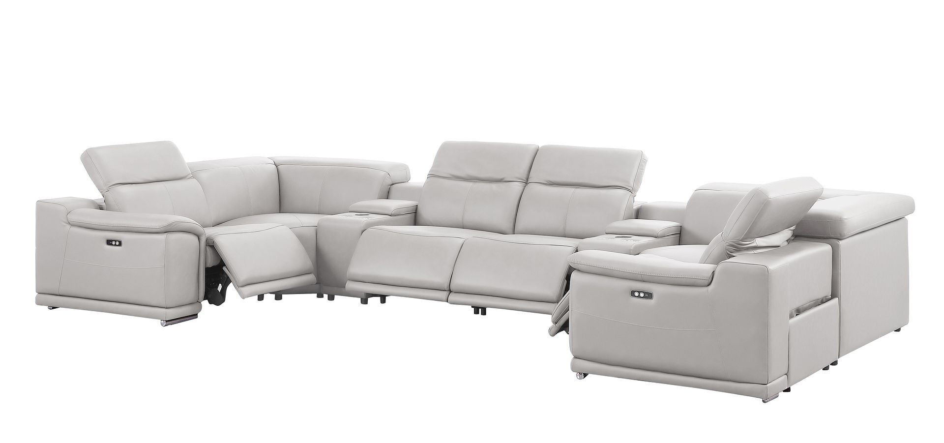 The ash gray leather power reclining u shaped eight piece corner sectional with console is spacious design meticulously crafted with extraordinary cushion comfort and ultimate durability so everyone in your home can have the best seat in the house. The high-end premium leather used makes your lounging luxuriously comfortable and adds an elegant appeal to your space. Solid colors give you lots of decorative options and are easy to work into your decor scheme. Pillow top arms offer a comfy place to rest. For the ultimate in relaxation, this sectional includes power - push button recline that turns it into a comfy lounge for sleeping or resting. Silver metal legs effortlessly elevate the room and add a touch of contemporary design. Great for everyday lounging and for entertaining, sectionals are an ideal way to seat multiple people. 39.00-inch h x 148.00-inch w x 41.00-inch d.