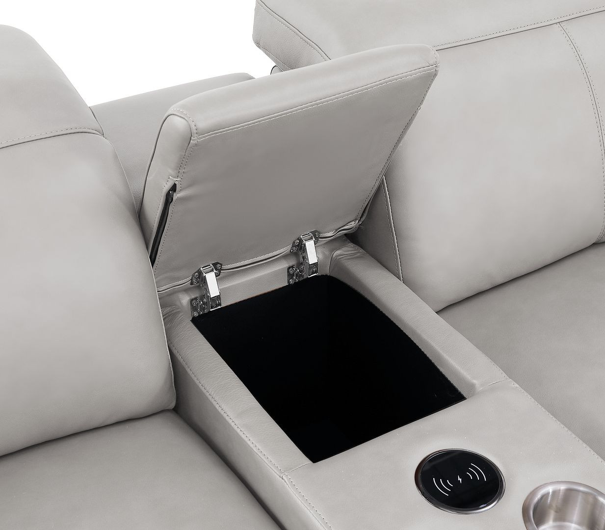 gray leather power reclining shaped, leather power reclining shaped piece, shaped piece corner sectional console, ash gray leather power reclining, reclining shaped piece corner sectional |