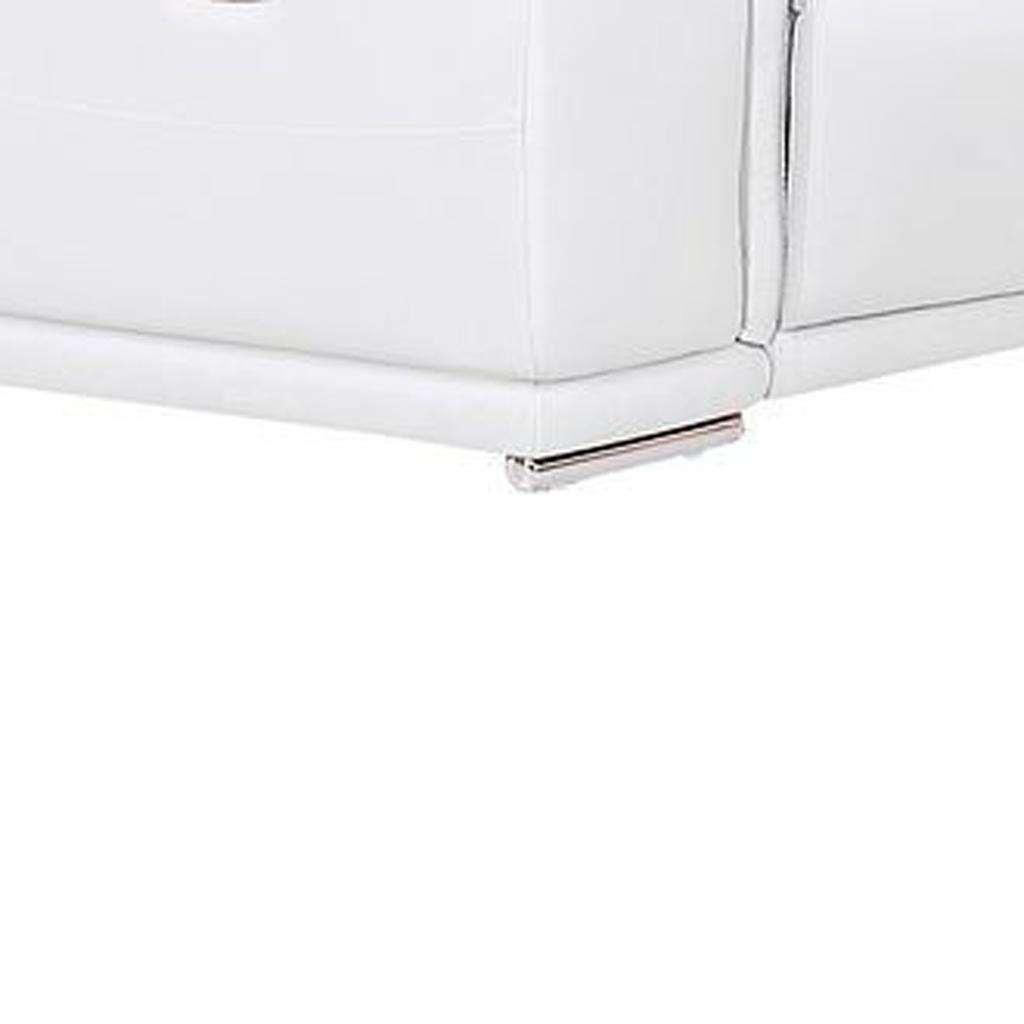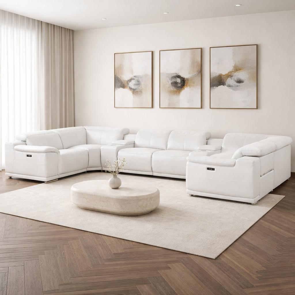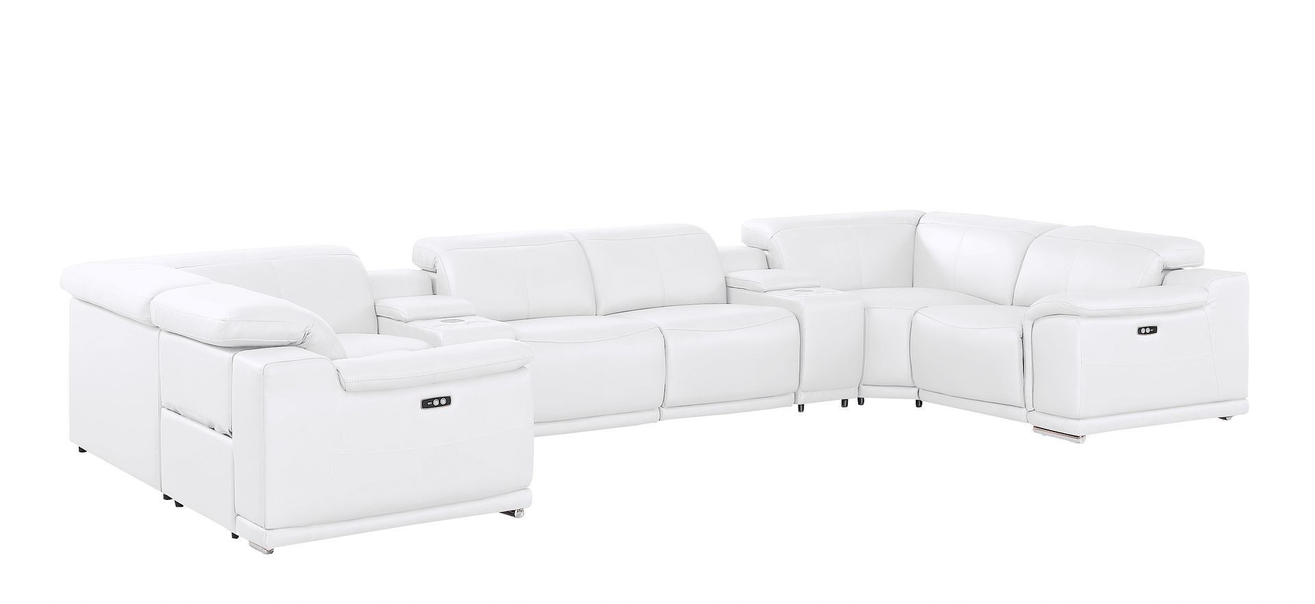 The white leather power reclining u shaped eight piece corner sectional with console is spacious design meticulously crafted with extraordinary cushion comfort and ultimate durability so everyone in your home can have the best seat in the house. The high-end premium leather used makes your lounging luxuriously comfortable and adds an elegant appeal to your space. Solid colors give you lots of decorative options and are easy to work into your decor scheme. Pillow top arms offer a comfy place to rest. Power - push button recline allows you to truly rest, lounge and even sleep comfortably. Silver metal legs effortlessly elevate the room and add a touch of contemporary design. A great showpiece for your room, this sectional is a must have. 39.00-inch h x 148.00-inch w x 41.00-inch d.