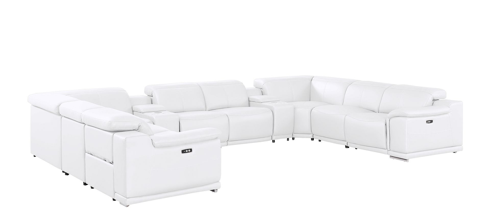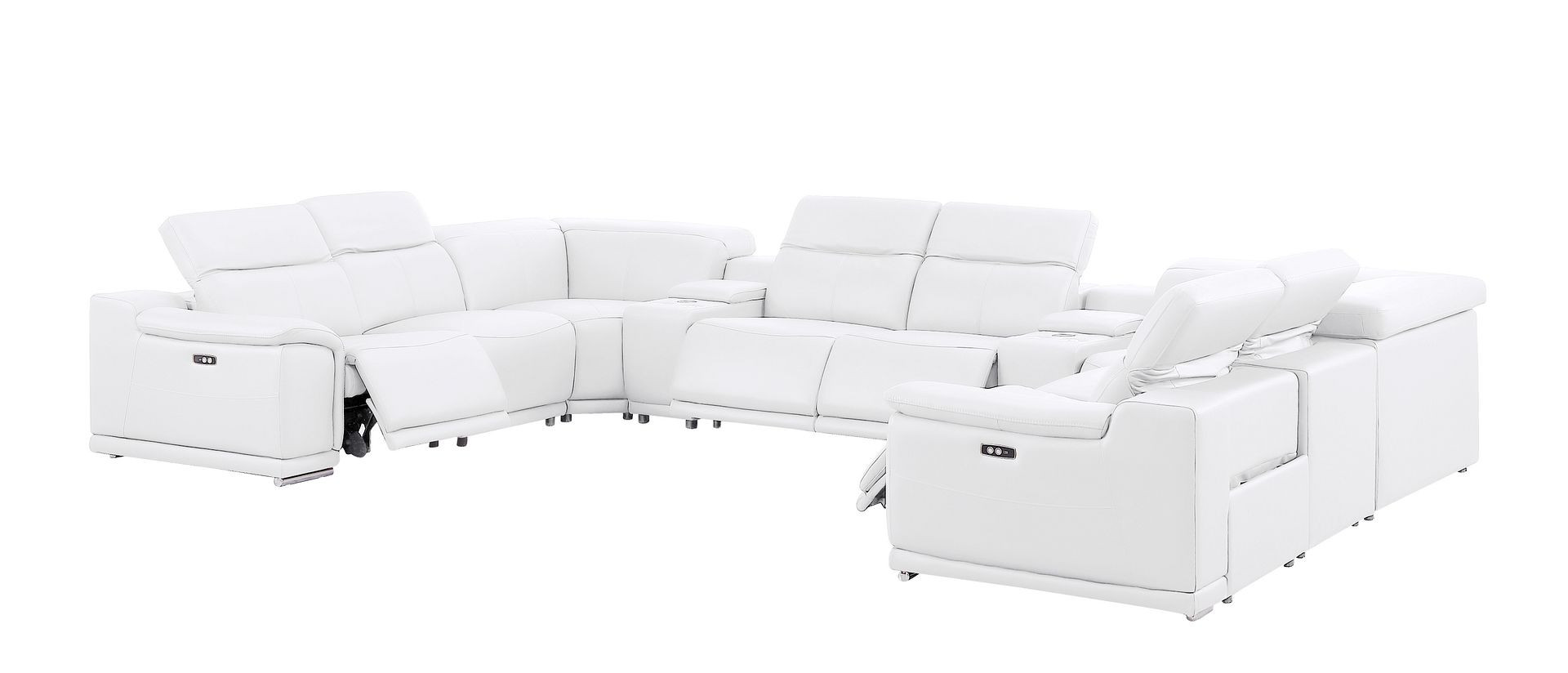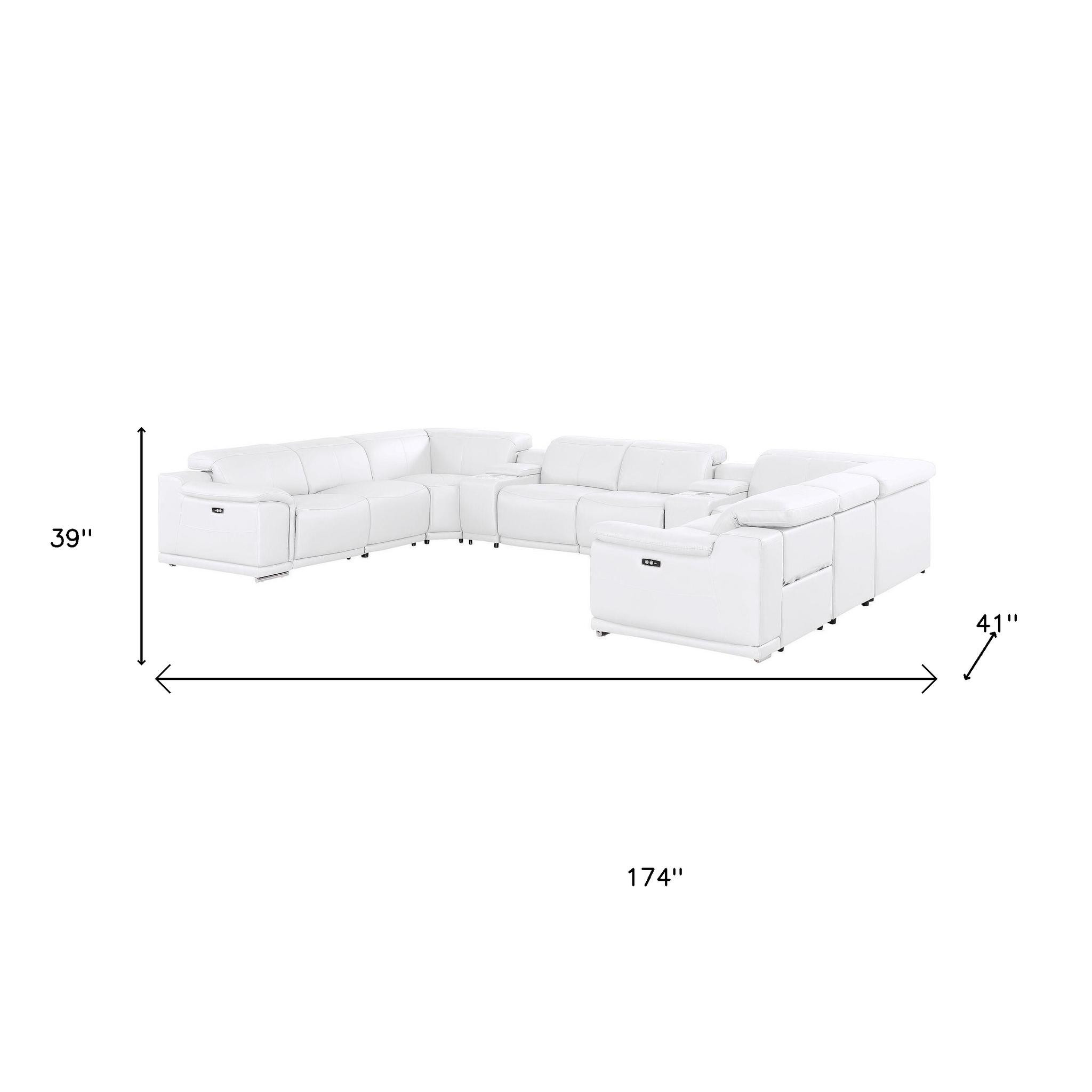 The white leather modular u shaped ten piece corner sectional with console is spacious design meticulously crafted with extraordinary cushion comfort and ultimate durability so everyone in your home can have the best seat in the house. The high-end premium leather used makes your lounging luxuriously comfortable and adds an elegant appeal to your space. Pillow top arms offer a comfy place to rest. Power - push button recline allows you to truly rest, lounge and even sleep comfortably. Silver metal legs effortlessly elevate the room and add a touch of contemporary design. A great showpiece for your room, this sectional is a must have. 39.00-inch h x 174.00-inch w x 41.00-inch d.