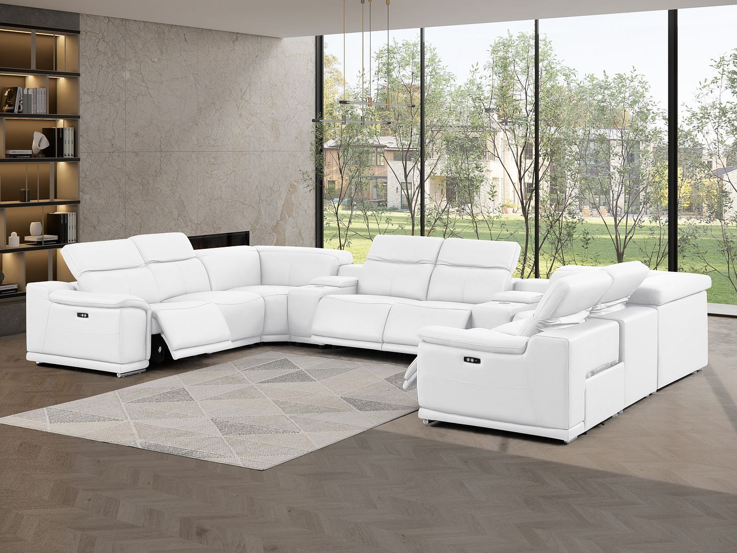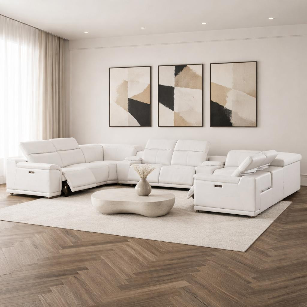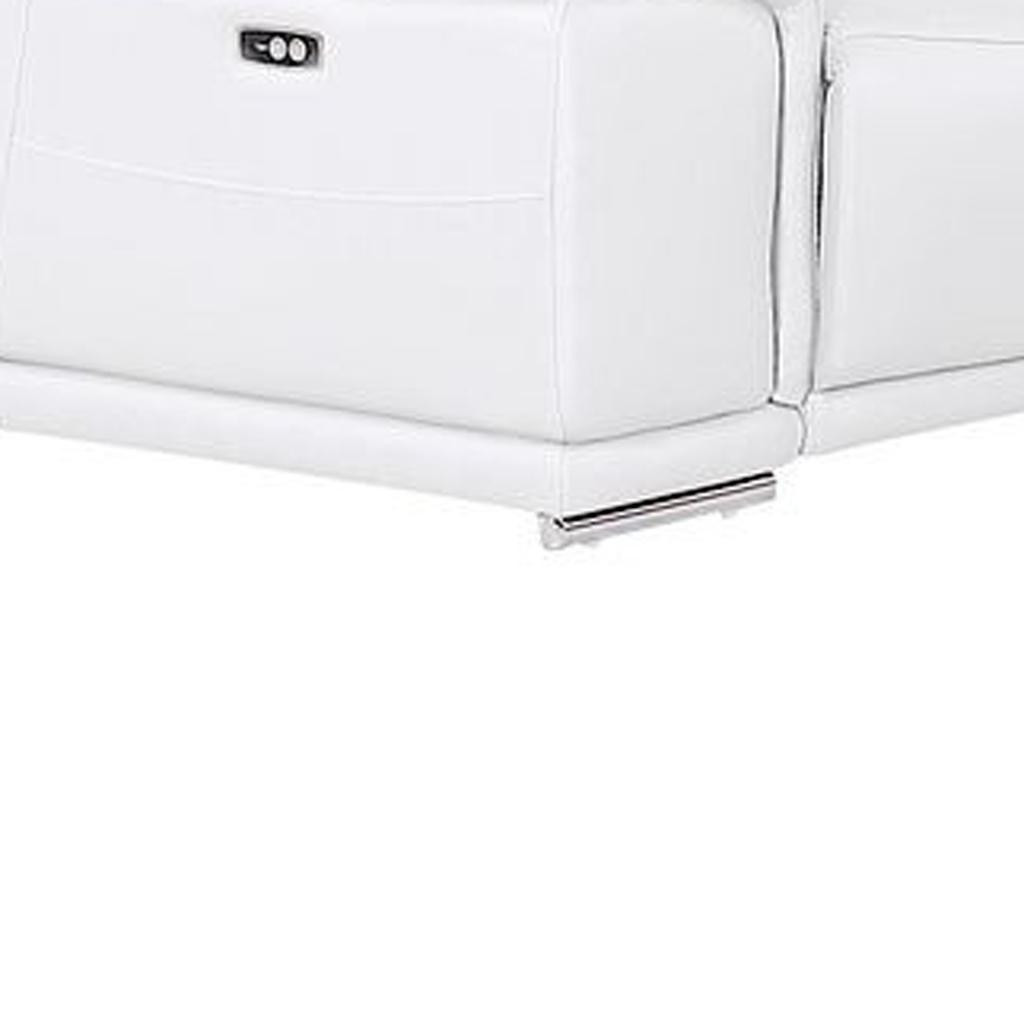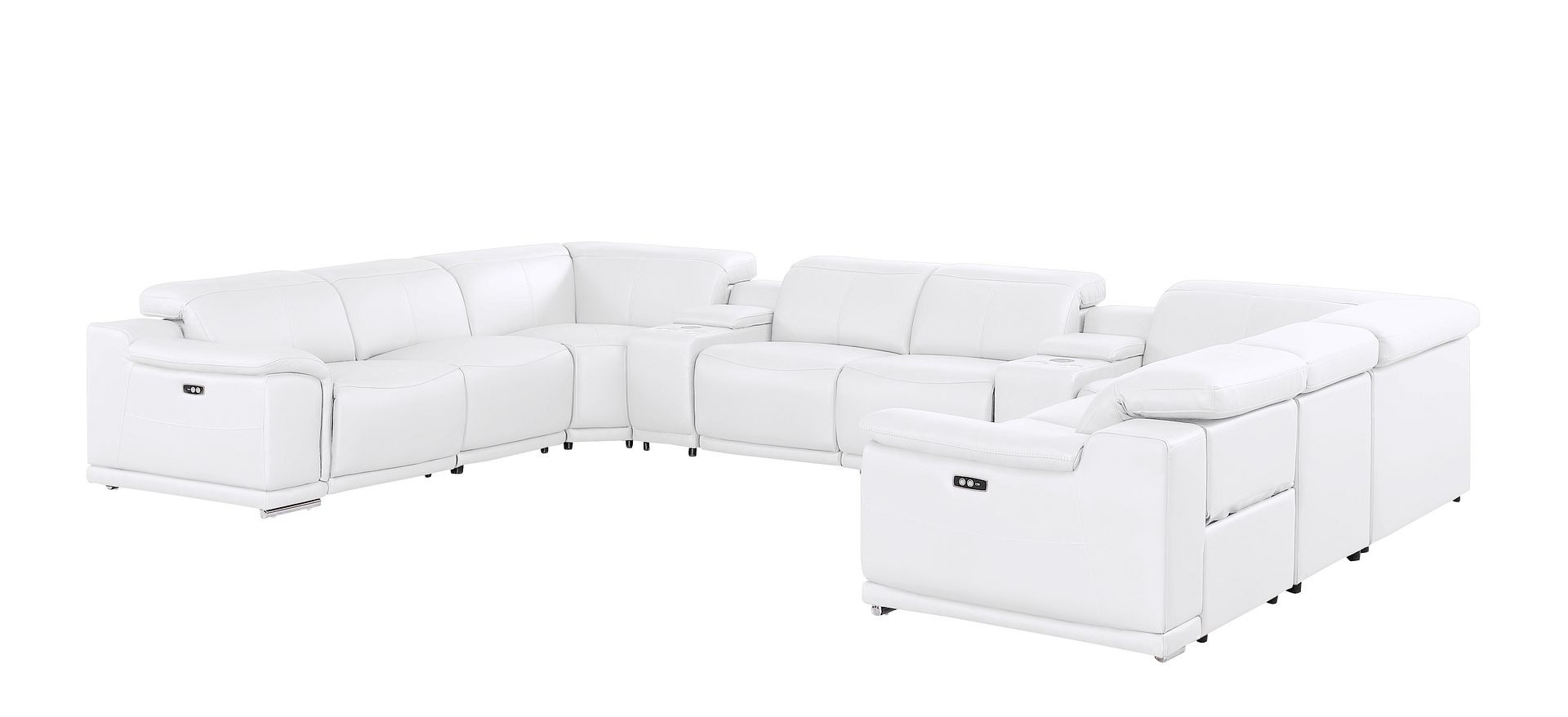 The white leather modular u shaped ten piece corner sectional with console is spacious design meticulously crafted with extraordinary cushion comfort and ultimate durability so everyone in your home can have the best seat in the house. The high-end premium leather used makes your lounging luxuriously comfortable and adds an elegant appeal to your space. Pillow top arms offer a comfy place to rest. Power - push button recline allows you to truly rest, lounge and even sleep comfortably. Silver metal legs effortlessly elevate the room and add a touch of contemporary design. A great showpiece for your room, this sectional is a must have. 39.00-inch h x 174.00-inch w x 41.00-inch d.