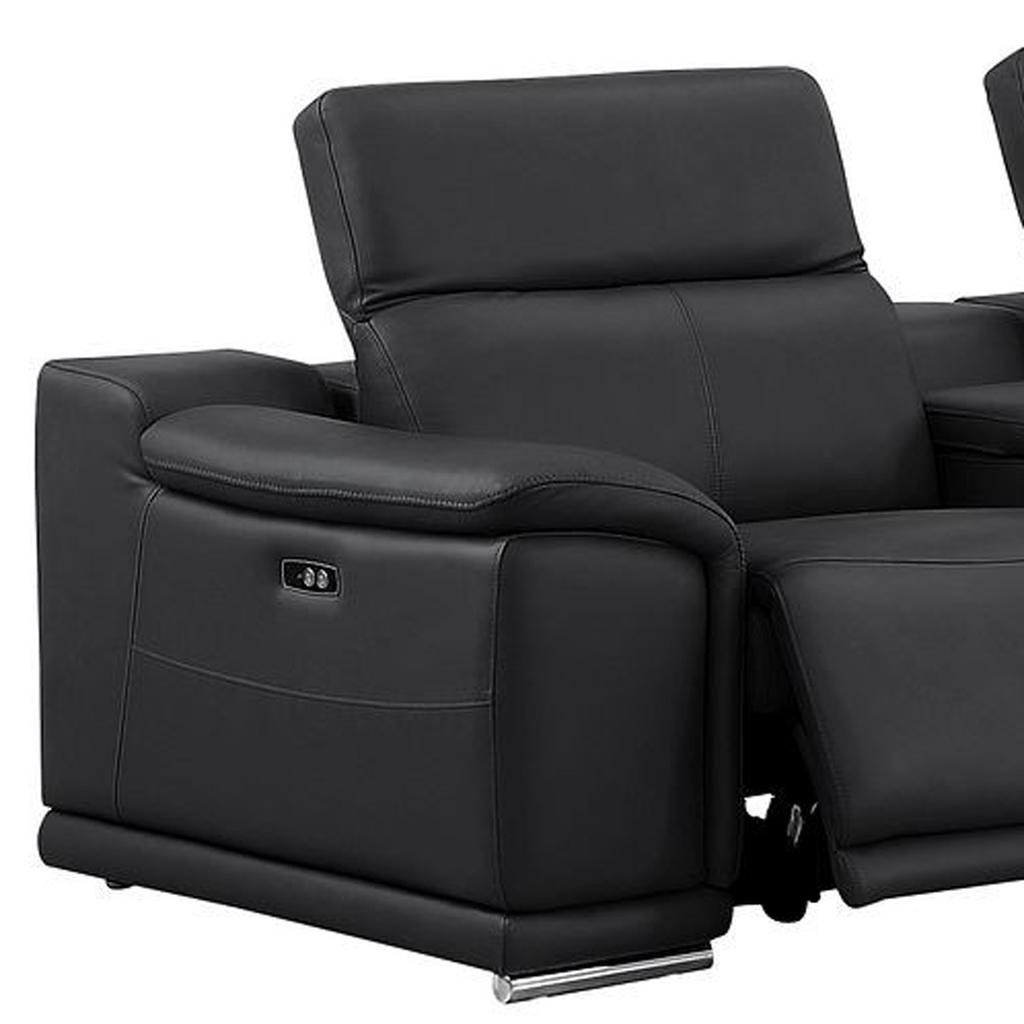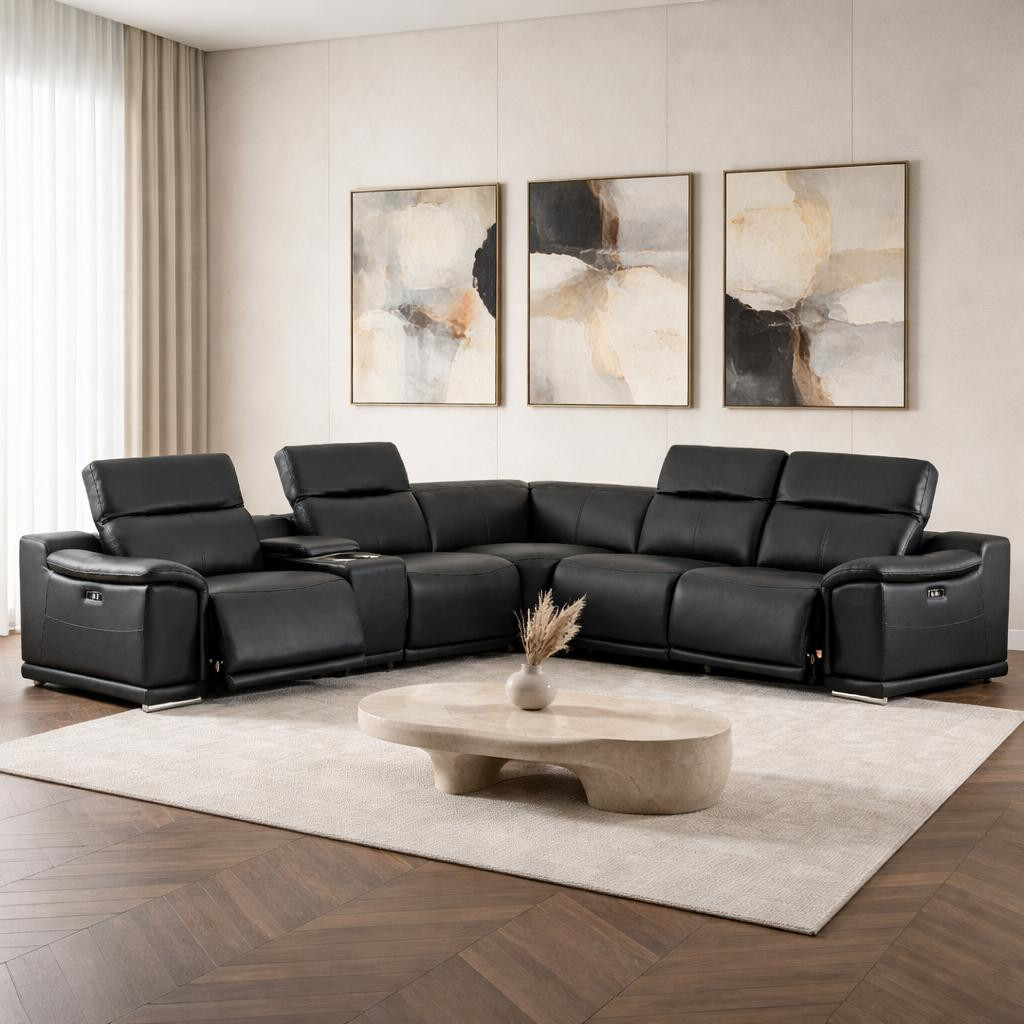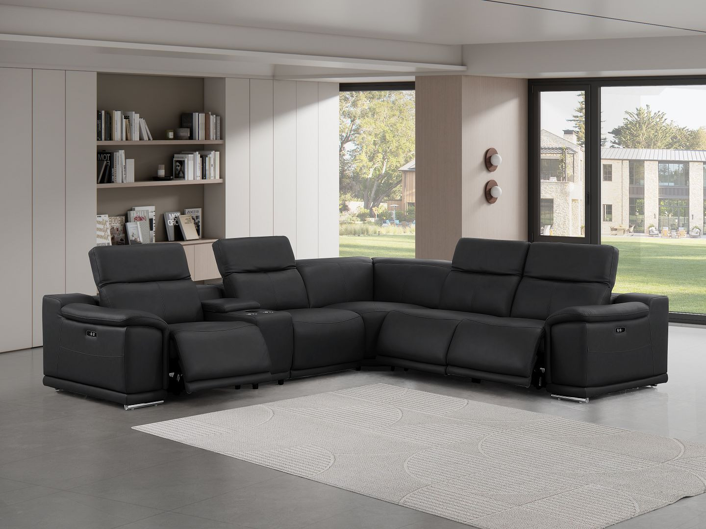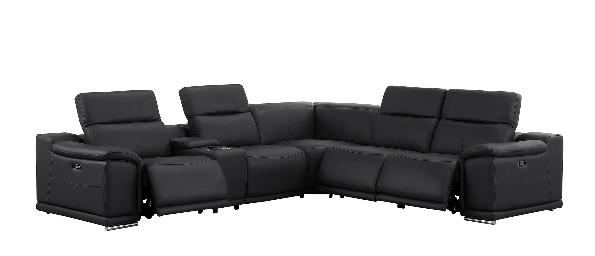 Take your relaxation to the next level with this super soft and comfortable black leather power reclining l shaped six piece corner sectional with console. The high-end premium leather used makes your lounging luxuriously comfortable and adds an elegant appeal to your space. Solid colors give you lots of decorative options and are easy to work into your decor scheme. Pillow top arms offer a comfy place to rest. Power - push button recline allows you to truly rest, lounge and even sleep comfortably. Silver metal legs effortlessly elevate the room and add a touch of contemporary design. A great showpiece for your room, this sectional is a must have. 39.00-inch h x 110.00-inch w x 41.00-inch d.