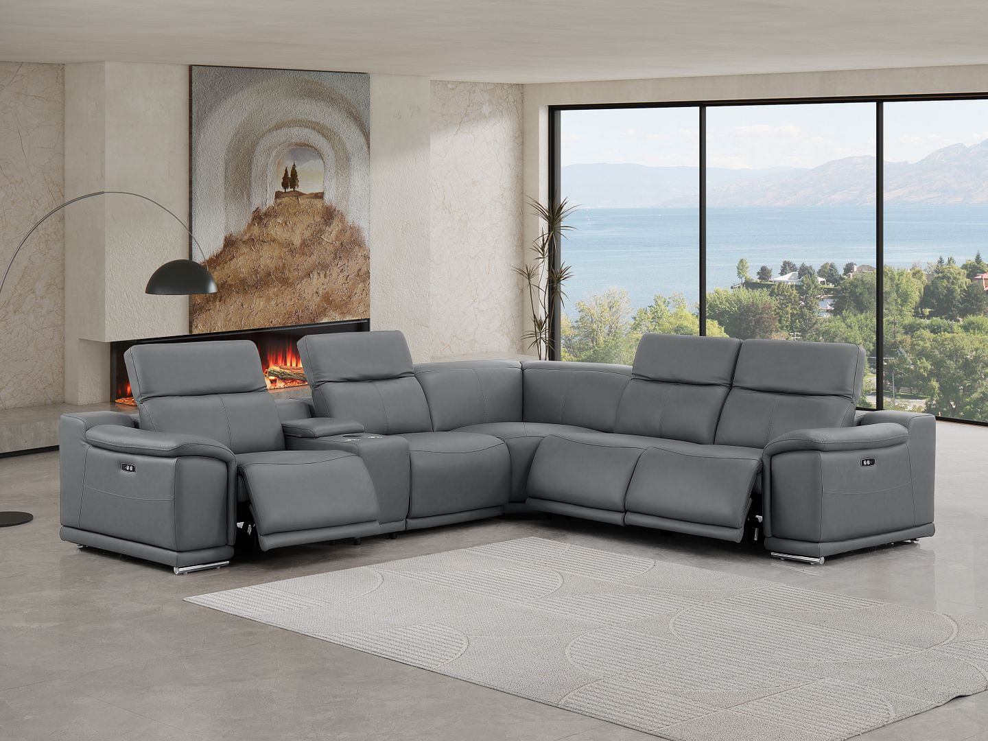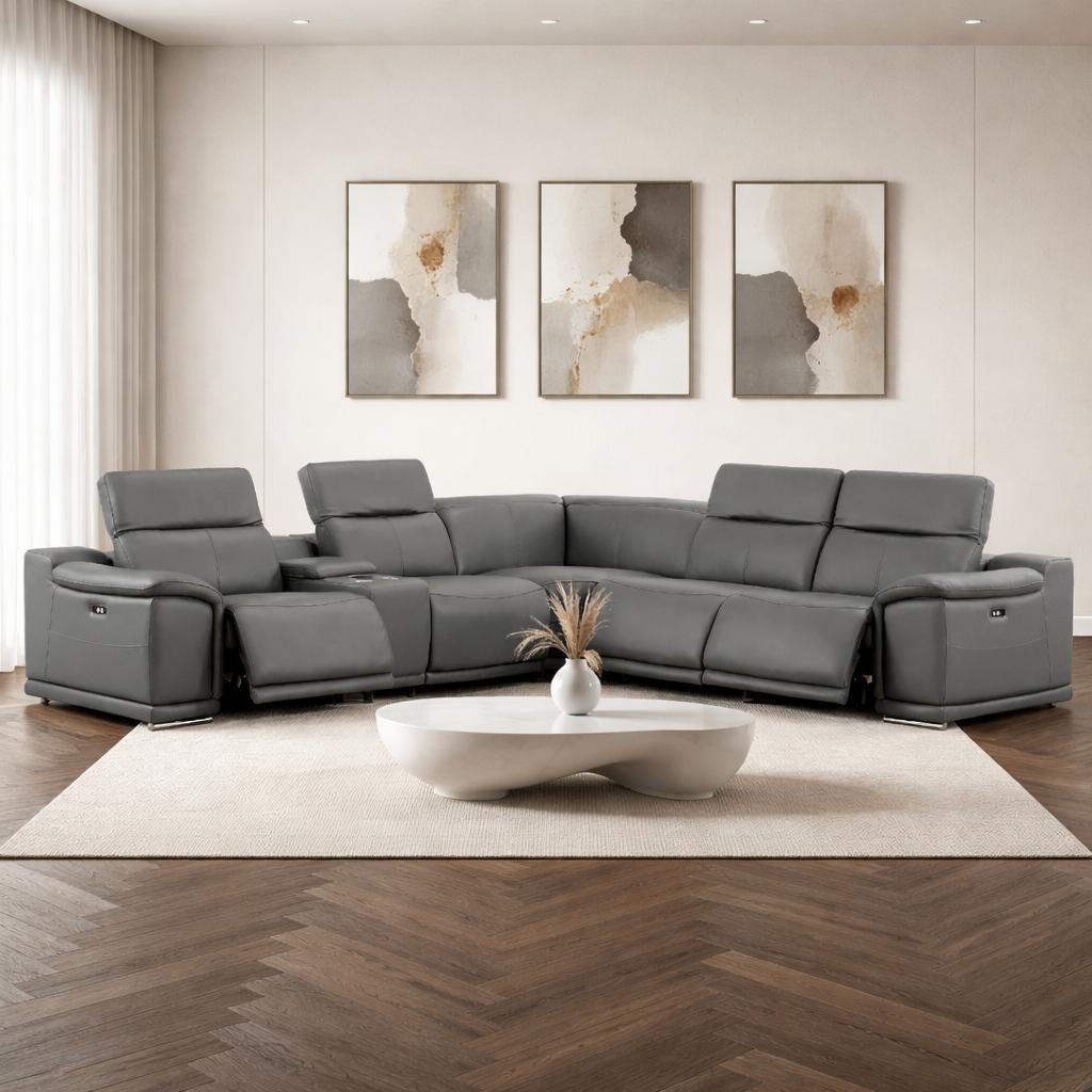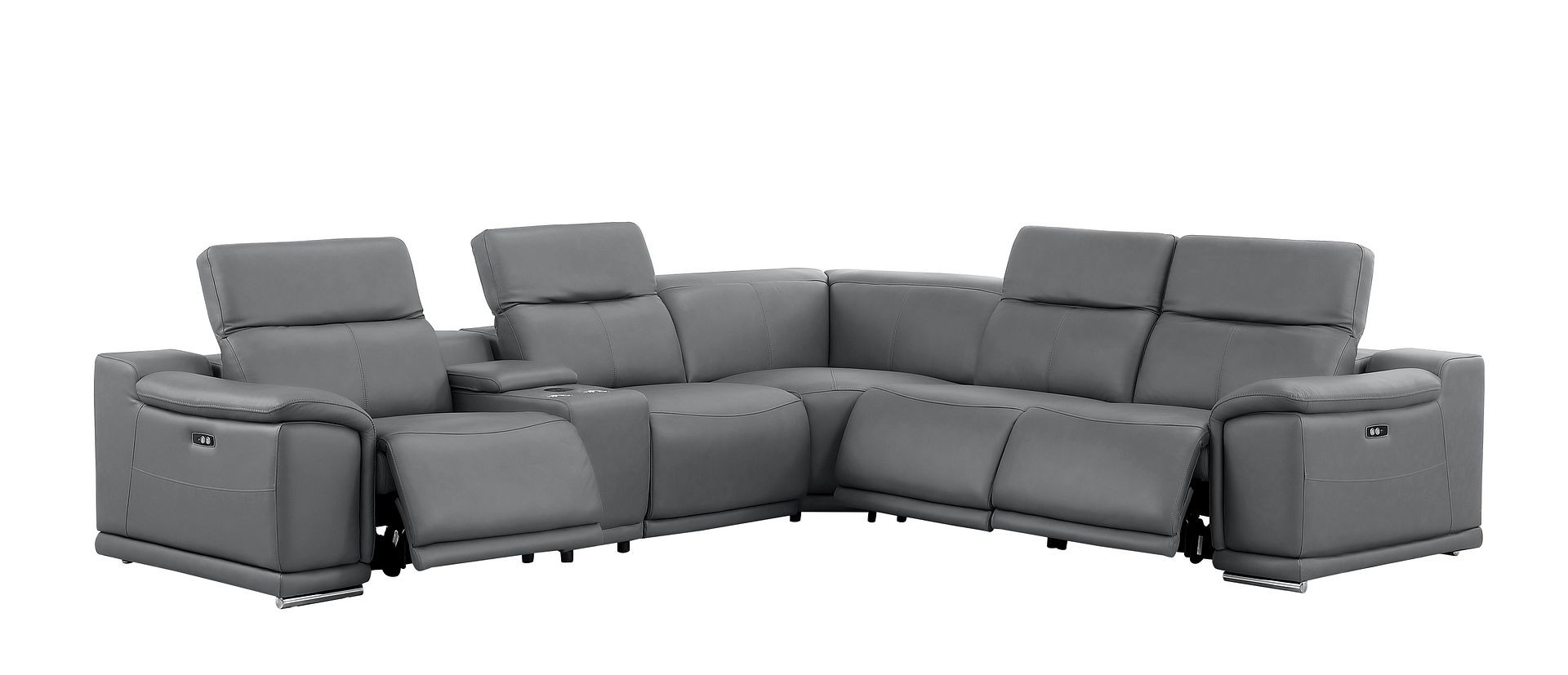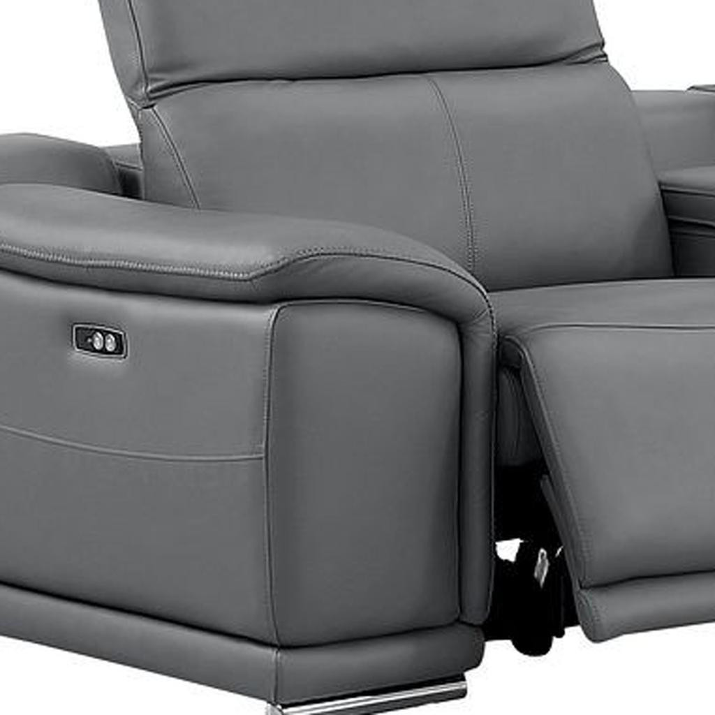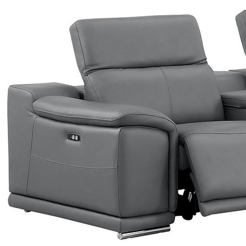 An interior designer's dream, this buttery soft high-grade leather battleship gray leather power reclining l shaped six piece corner sectional with console will bring just the right touch to your space. The premium leather used makes your lounging luxuriously comfortable and adds an elegant appeal to your space. Solid colors give you lots of decorative options and are easy to work into your decor scheme. Pillow top arms offer a comfy place to rest. Power - push button recline allows you to truly rest, lounge and even sleep comfortably. Silver metal legs effortlessly elevate the room and add a touch of contemporary design. A great showpiece for your room, this sectional is a must have. 39.00-inch h x 110.00-inch w x 41.00-inch d.