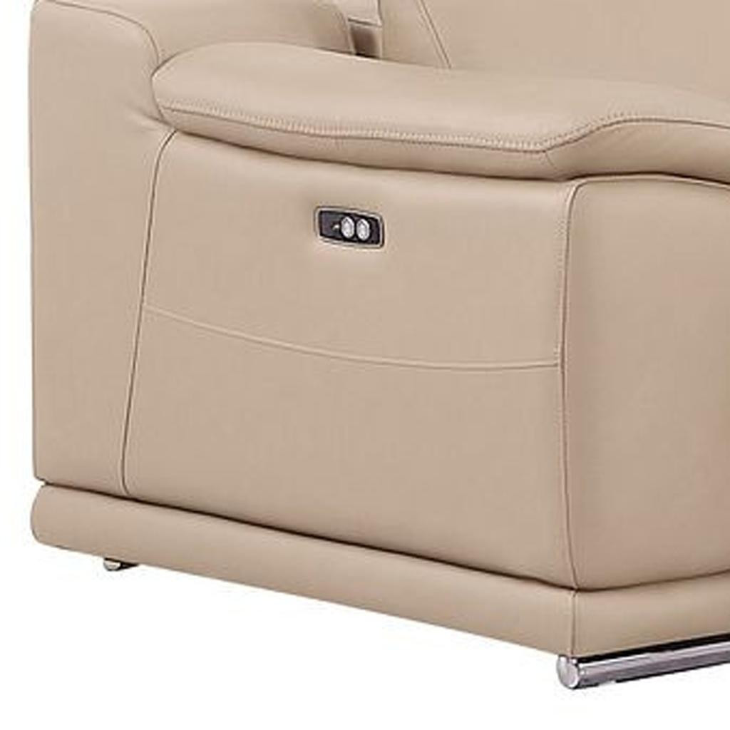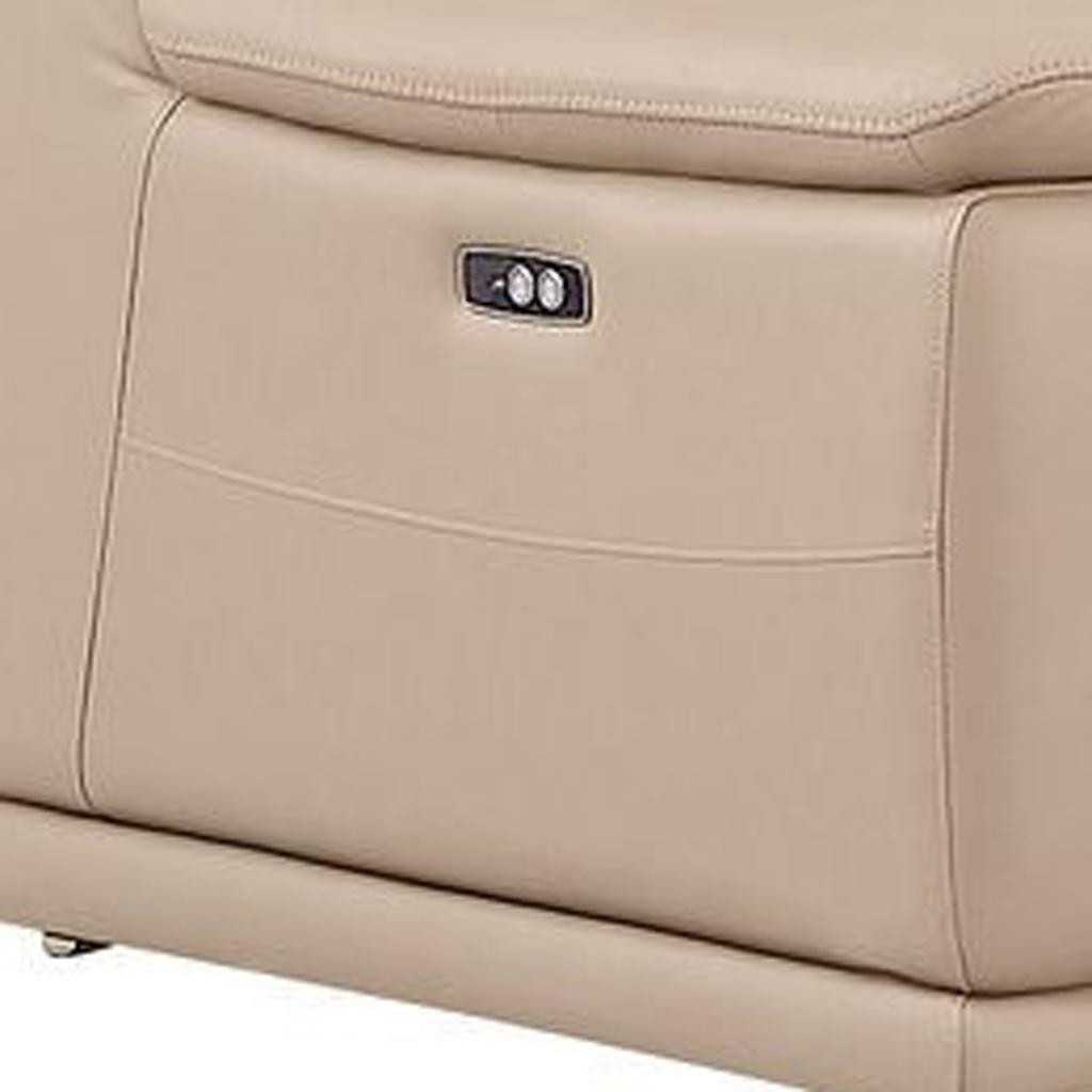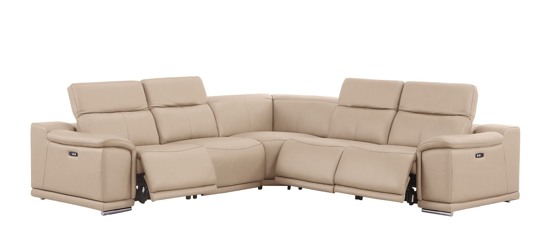 Superior construction from fabulously soft and high-grade leather gives this beige leather power reclining l shaped five piece corner sectional a leg up on the competition. The premium leather used makes your lounging luxuriously comfortable and adds an elegant appeal to your space. Solid colors give you lots of decorative options and are easy to work into your decor scheme. Pillow top arms offer a comfy place to rest. For the ultimate in relaxation, this sectional includes power - push button recline that turns it into a comfy lounge for sleeping or resting. Silver metal legs effortlessly elevate the room and add a touch of contemporary design. A great showpiece for your room, this sectional is a must have. 39.00-inch h x 113.00-inch w x 41.00-inch d.