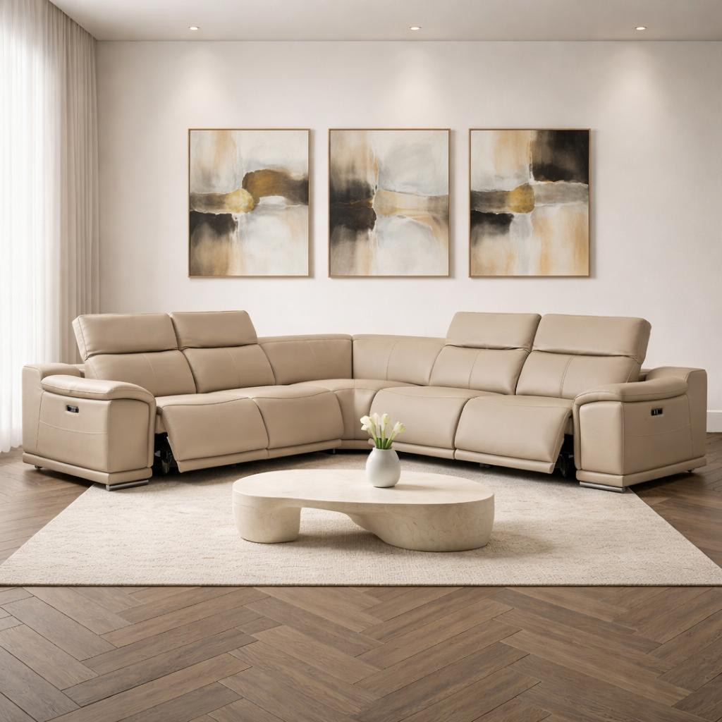 beige leather power reclining shaped, beige leather power reclining, reclining shaped piece corner sectional, leather power reclining shaped piece, leather power reclining shaped |