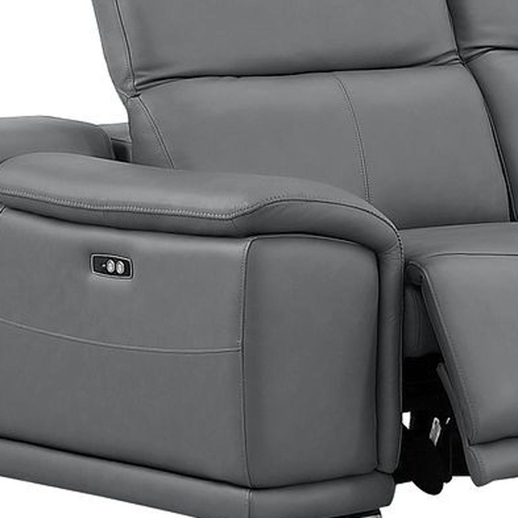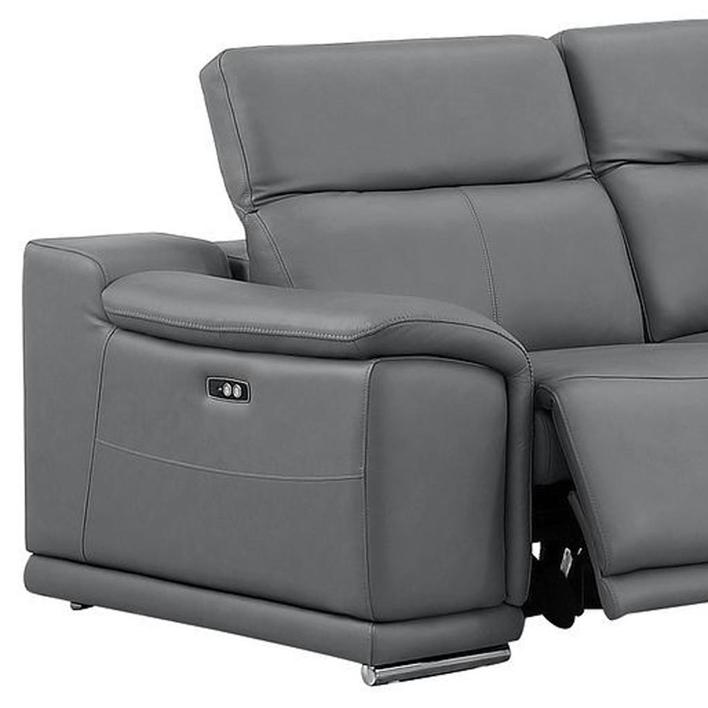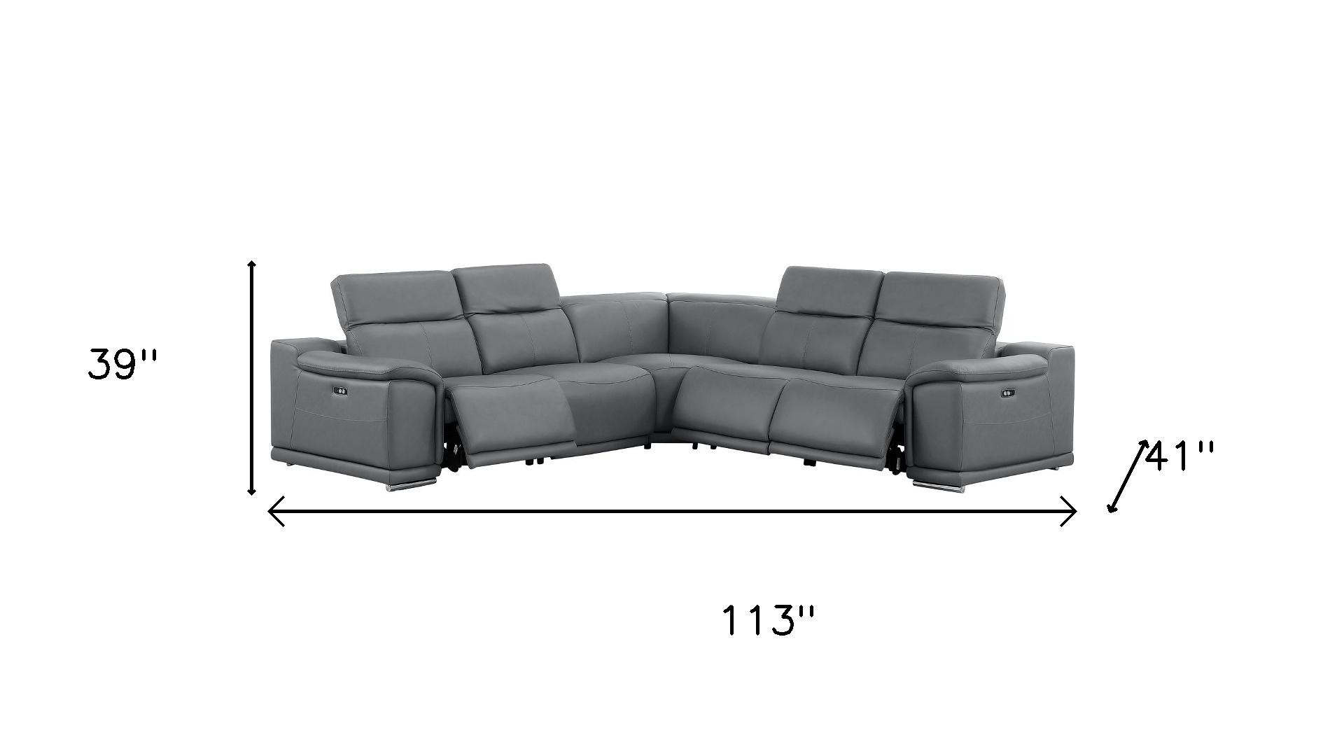 The battleship gray leather power reclining l shaped five piece corner sectional is spacious design meticulously crafted with extraordinary cushion comfort and ultimate durability so everyone in your home can have the best seat in the house. The high-end premium leather used makes your lounging luxuriously comfortable and adds an elegant appeal to your space. Solid colors give you lots of decorative options and are easy to work into your decor scheme. Pillow top arms offer a comfy place to rest. Power - push button recline allows you to truly rest, lounge and even sleep comfortably. Silver metal legs effortlessly elevate the room and add a touch of contemporary design. Great for everyday lounging and for entertaining, sectionals are an ideal way to seat multiple people. 39.00-inch h x 113.00-inch w x 41.00-inch d.