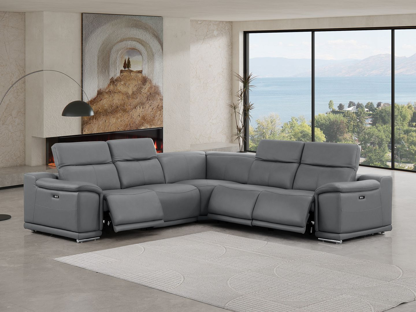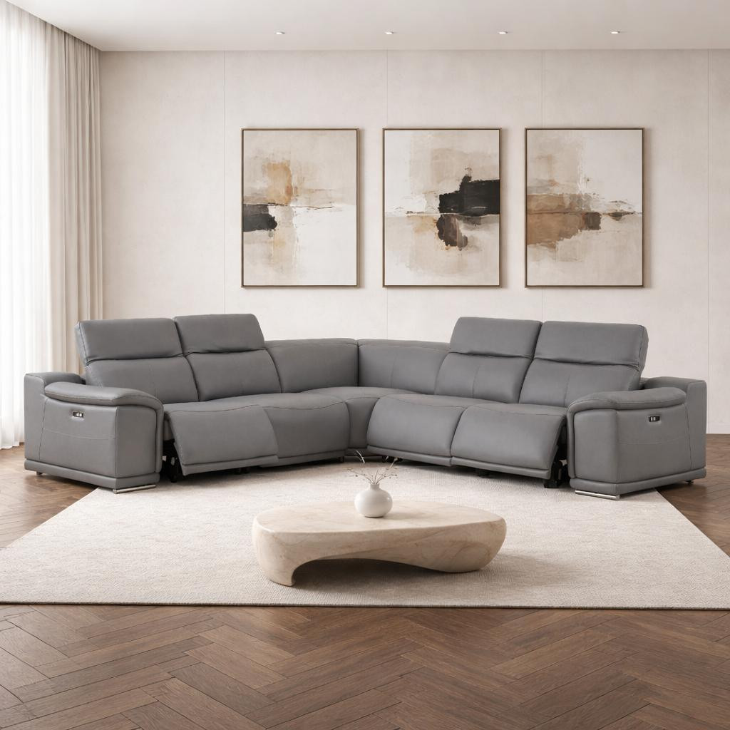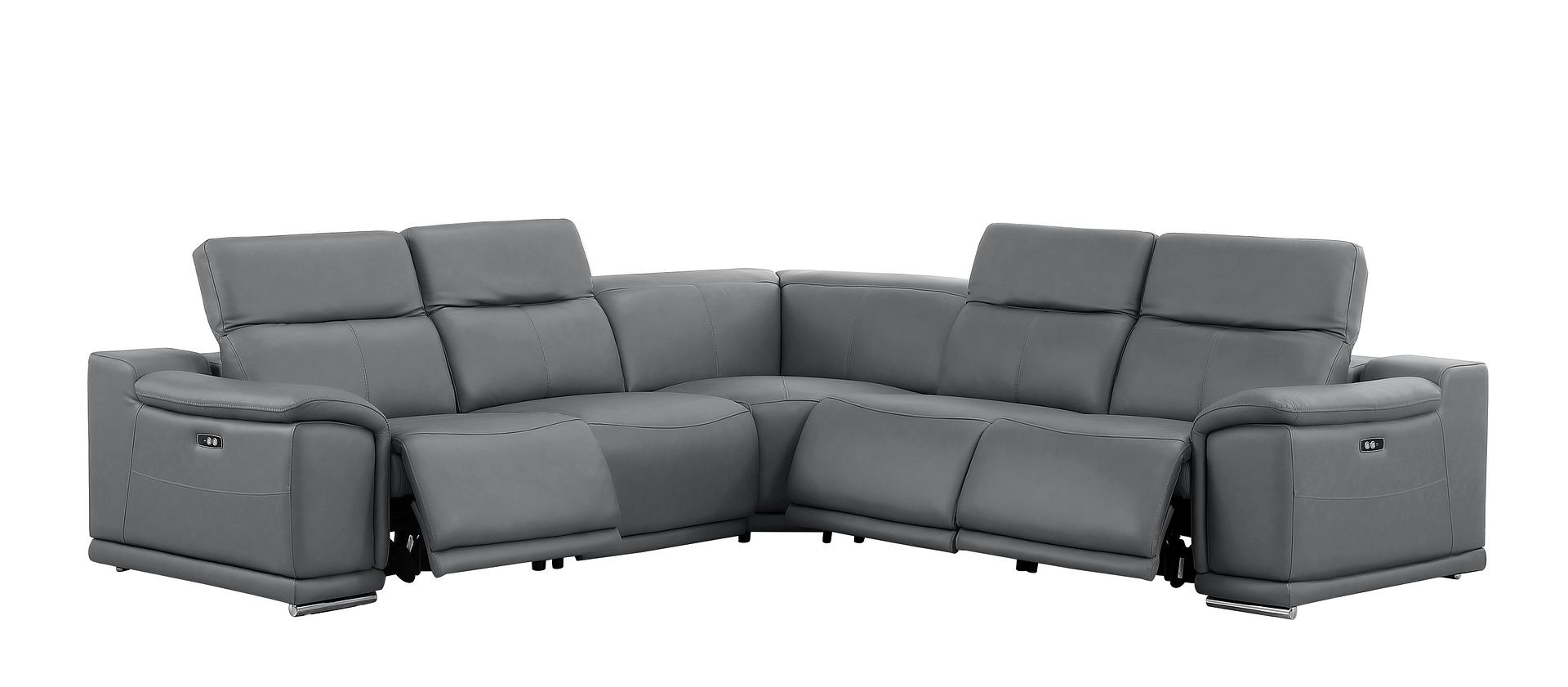 The battleship gray leather power reclining l shaped five piece corner sectional is spacious design meticulously crafted with extraordinary cushion comfort and ultimate durability so everyone in your home can have the best seat in the house. The high-end premium leather used makes your lounging luxuriously comfortable and adds an elegant appeal to your space. Solid colors give you lots of decorative options and are easy to work into your decor scheme. Pillow top arms offer a comfy place to rest. Power - push button recline allows you to truly rest, lounge and even sleep comfortably. Silver metal legs effortlessly elevate the room and add a touch of contemporary design. Great for everyday lounging and for entertaining, sectionals are an ideal way to seat multiple people. 39.00-inch h x 113.00-inch w x 41.00-inch d.