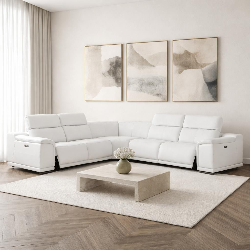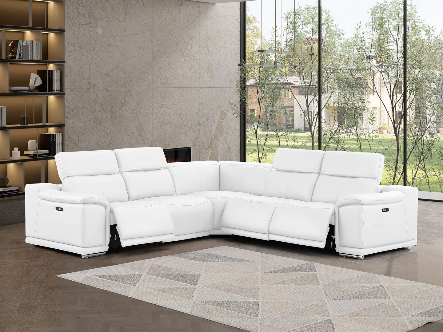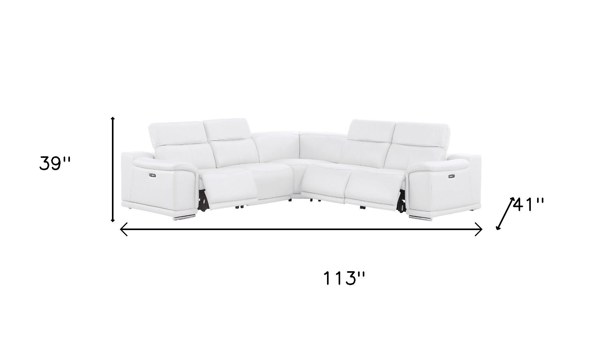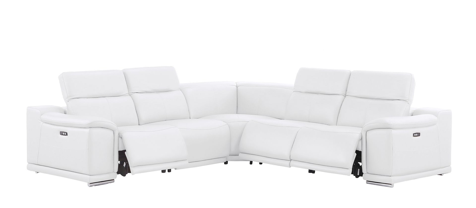 Made of the highest quality, supple leather, this white leather power reclining l shaped five piece corner sectional will be the star of your space. The high-grade premium leather used makes your lounging luxuriously comfortable and adds an elegant appeal to your space. Solid colors give you lots of decorative options and are easy to work into your decor scheme. Pillow top arms offer a comfy place to rest. Power - push button recline allows you to truly rest, lounge and even sleep comfortably. Silver metal legs effortlessly elevate the room and add a touch of contemporary design. A great showpiece for your room, this sectional is a must have. 39.00-inch h x 113.00-inch w x 41.00-inch d.