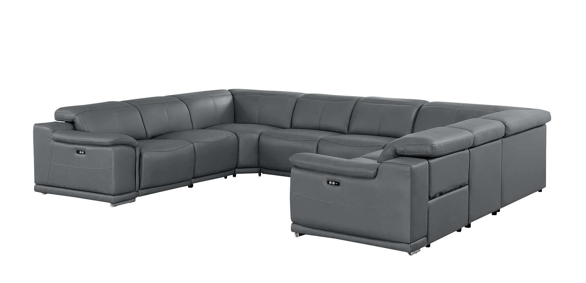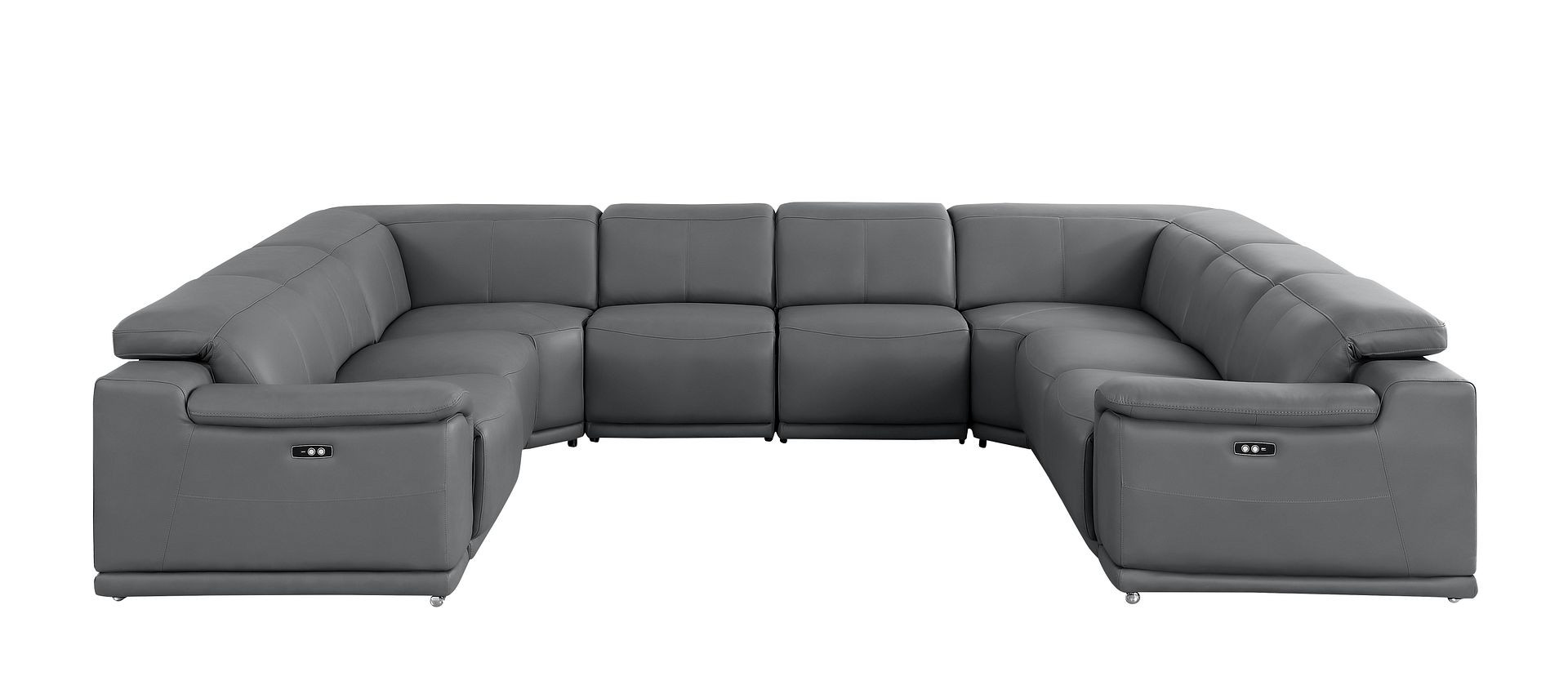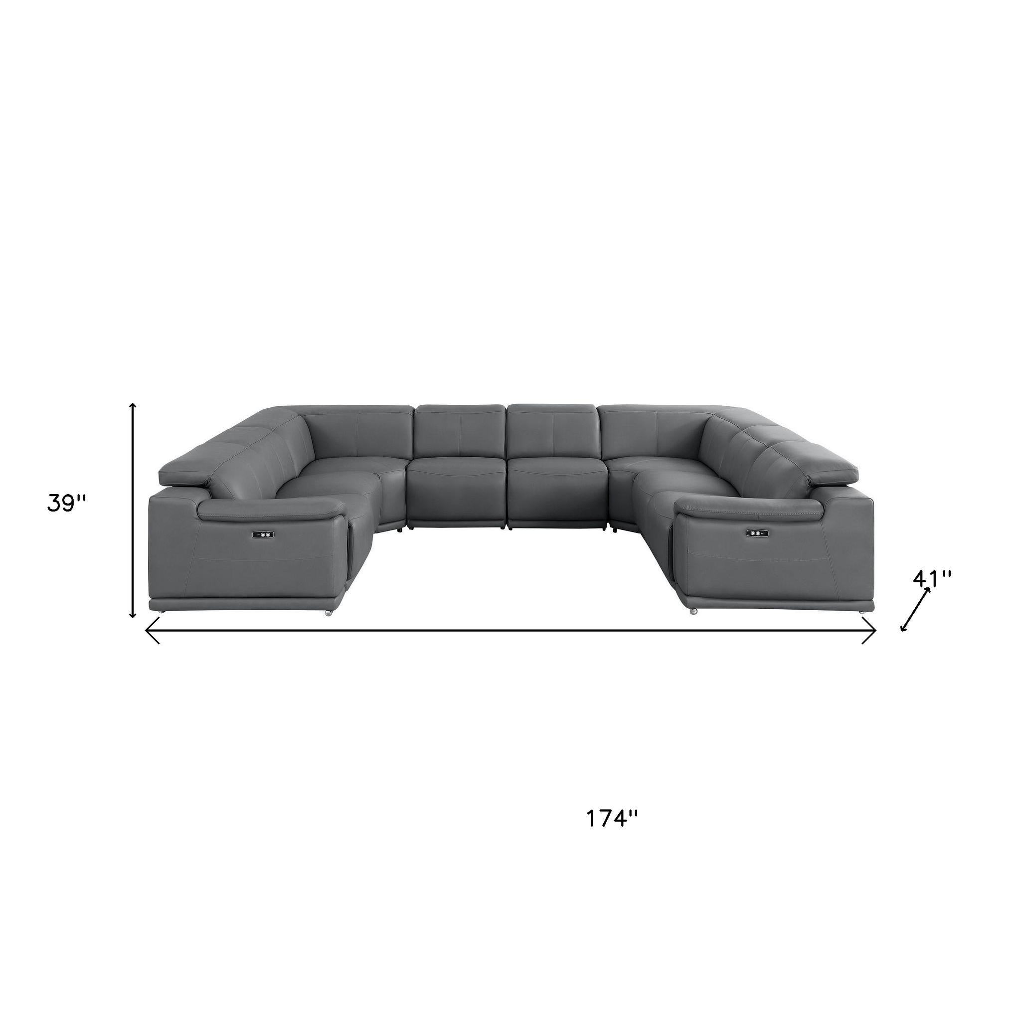 Made of the highest quality, supple leather, this battleship gray leather power reclining u shaped eight piece corner sectional will be the star of your space. The high-grade premium leather used makes your lounging luxuriously comfortable and adds an elegant appeal to your space. Solid colors give you lots of decorative options and are easy to work into your decor scheme. Pillow top arms offer a comfy place to rest. Power - push button recline allows you to truly rest, lounge and even sleep comfortably. Silver metal legs effortlessly elevate the room and add a touch of contemporary design. Great for everyday lounging and for entertaining, sectionals are an ideal way to seat multiple people. 39.00-inch h x 174.00-inch w x 41.00-inch d.