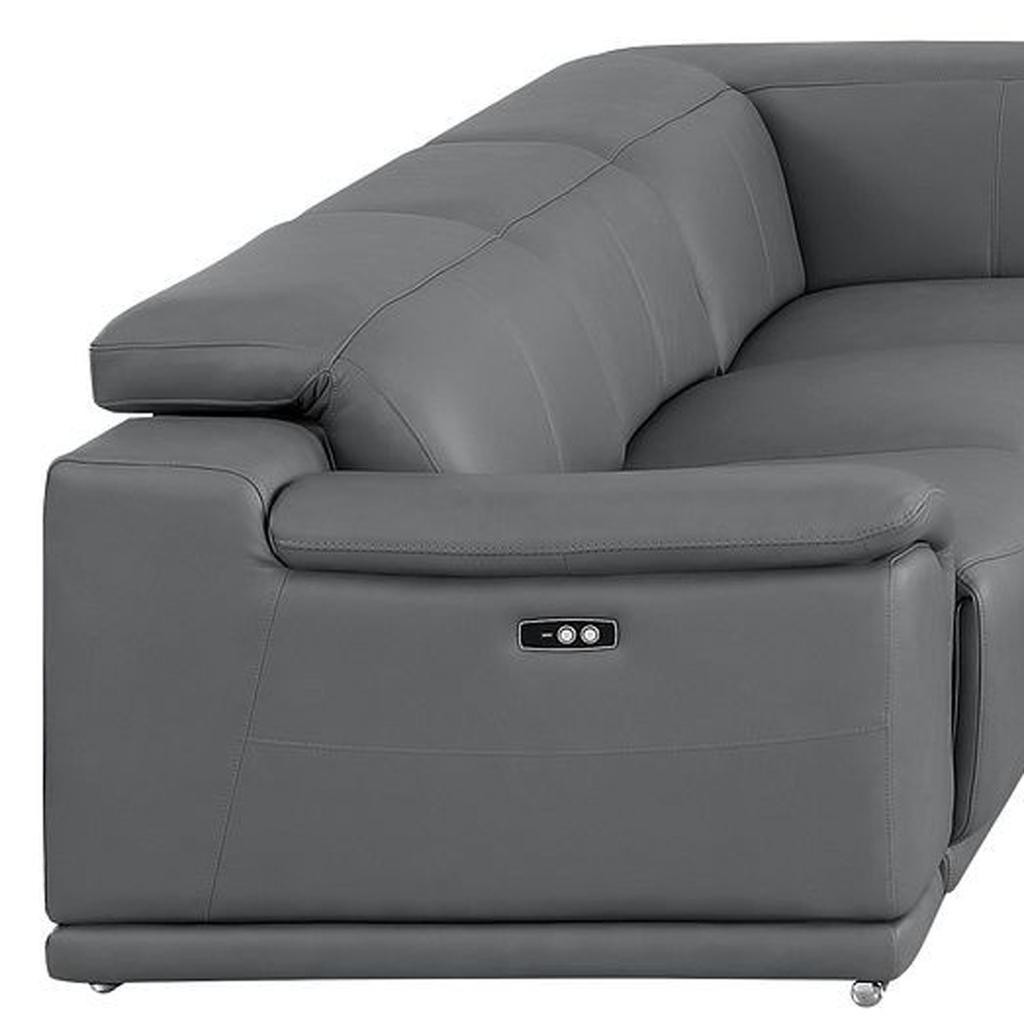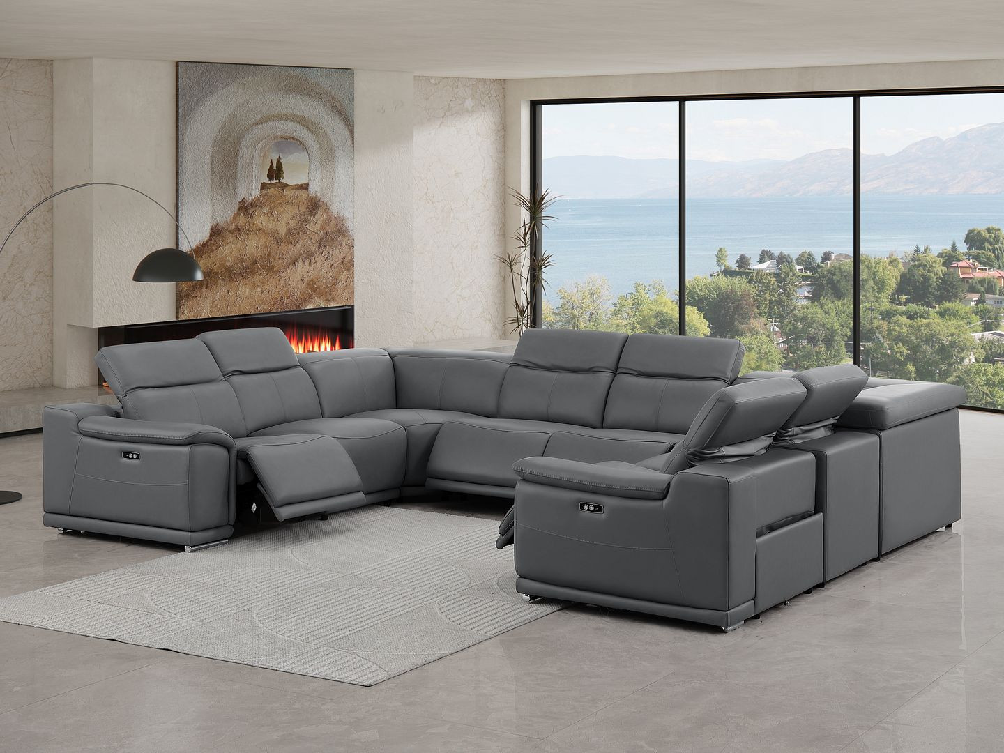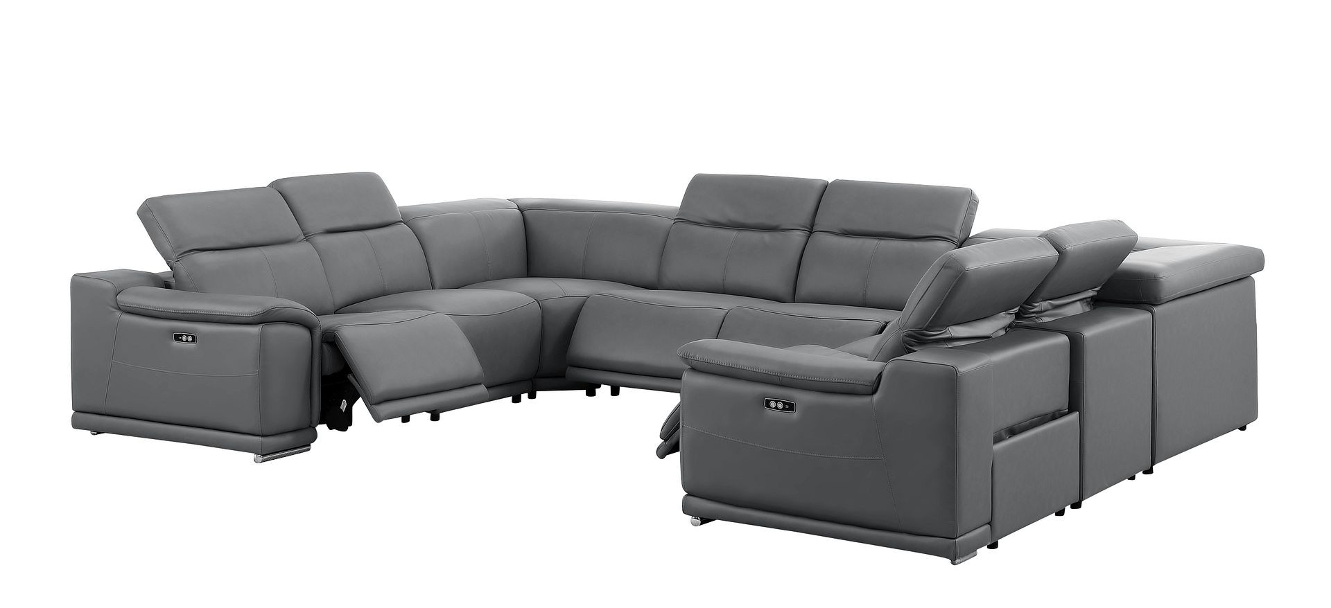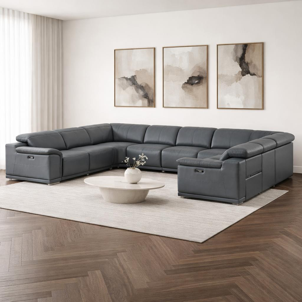 Made of the highest quality, supple leather, this battleship gray leather power reclining u shaped eight piece corner sectional will be the star of your space. The high-grade premium leather used makes your lounging luxuriously comfortable and adds an elegant appeal to your space. Solid colors give you lots of decorative options and are easy to work into your decor scheme. Pillow top arms offer a comfy place to rest. Power - push button recline allows you to truly rest, lounge and even sleep comfortably. Silver metal legs effortlessly elevate the room and add a touch of contemporary design. Great for everyday lounging and for entertaining, sectionals are an ideal way to seat multiple people. 39.00-inch h x 174.00-inch w x 41.00-inch d.