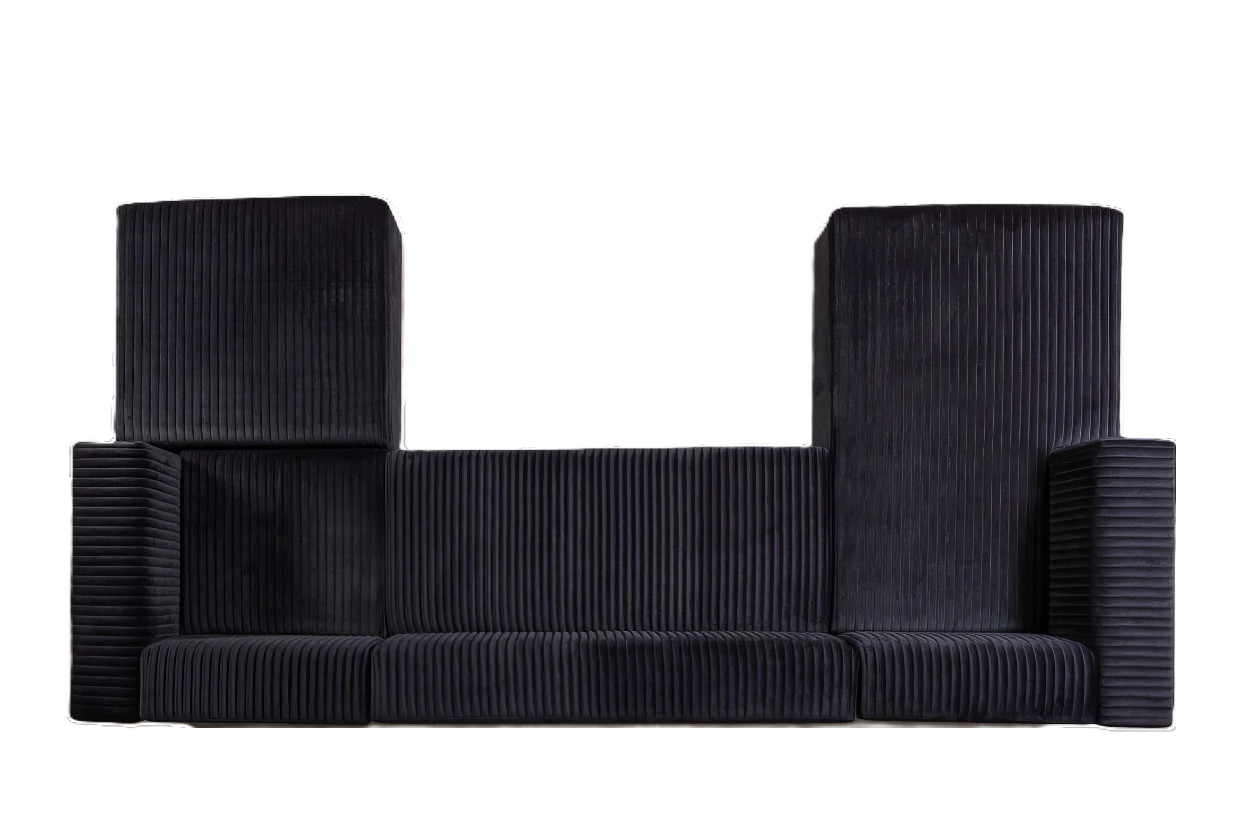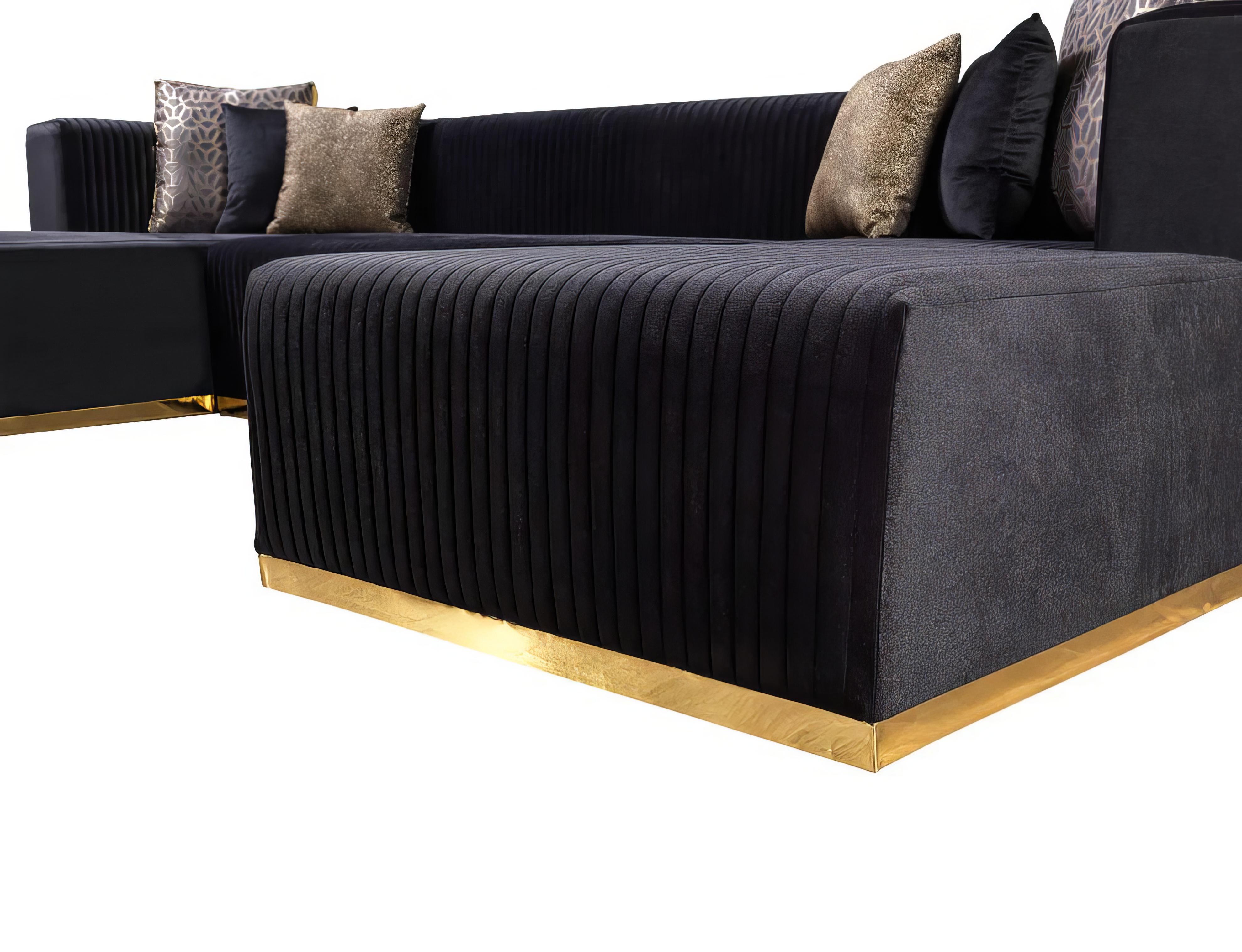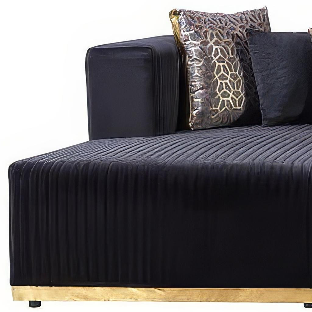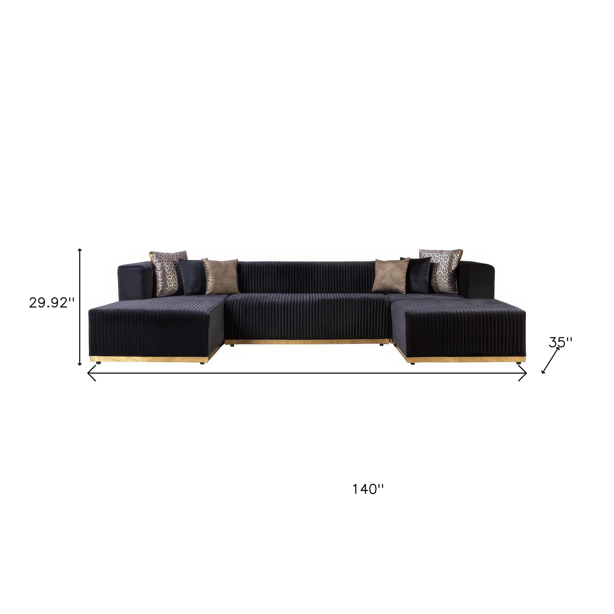 Designed for comfort and good looks, this black velvet modular u shaped four piece sofa and chaise sectional with toss pillows is a great option to anchor your space. Solid colors give you lots of decorative options and are easy to work into your decor scheme. Great for everyday lounging and for entertaining, sectionals are an ideal way to seat multiple people. This modern style features all over vertical tufted stitching and gold accents that will work for home or commercial settings. 29.92-inch h x 140.00-inch w x 35.00-inch d.