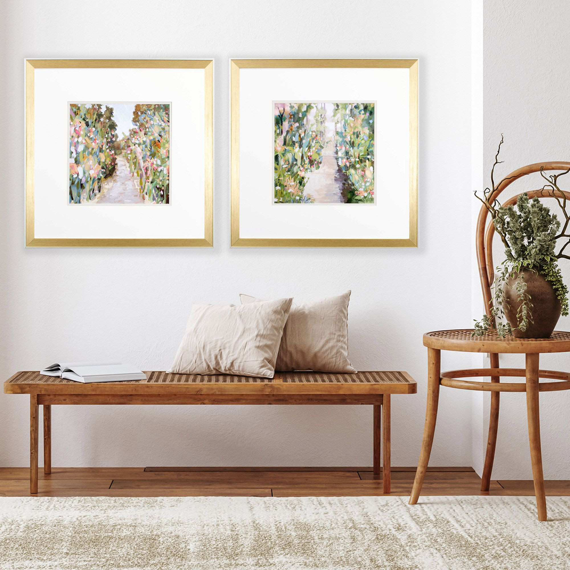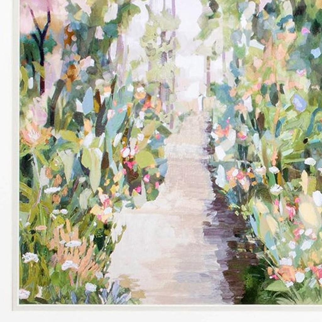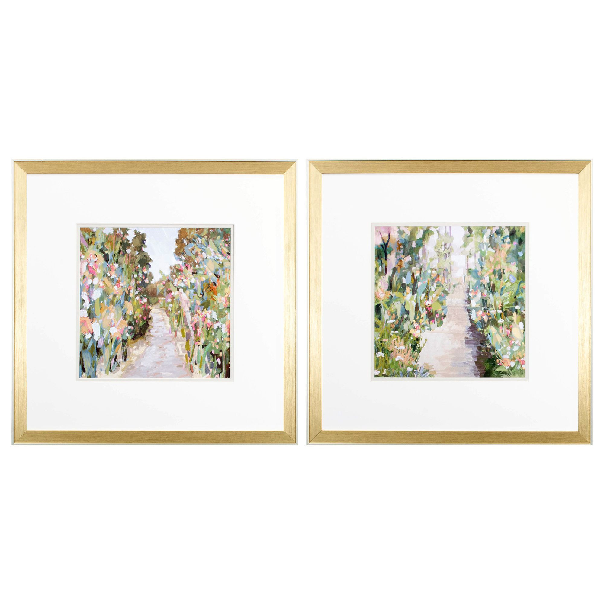 Add an air of fashion to your room and rejuvenate the space with this set of two flower garden path gold framed wall art. Reproduced for you on paper, this hanging decorative accent will be a trendy and fashionable way to dress your walls. Adding this hanging wall art to your space to make your room feel more finished and attractive. Utilize this opportunity to create a focal point in the room with this fabulous wall decor option. 22.00-inch h x 22.00-inch w x 2.00-inch d.
