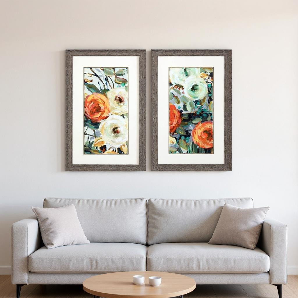Bring some sizzle to your space with this eye-catching set of two floral warmth brown framed wall art. Reproduced for you on paper, this hanging decorative accent will be a trendy and fashionable way to dress your walls. Hang on your wall to add some up to date fashion and decoration. Utilize this opportunity to create a focal point in the room with this fabulous wall decor option. 33.00-inch h x 21.00-inch w x 1.00-inch d.