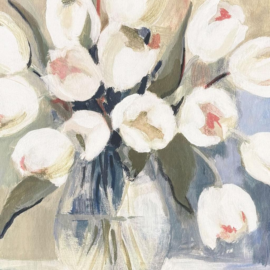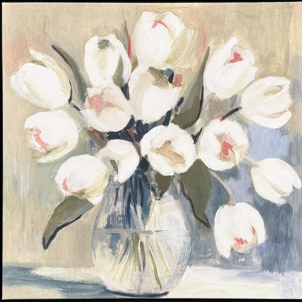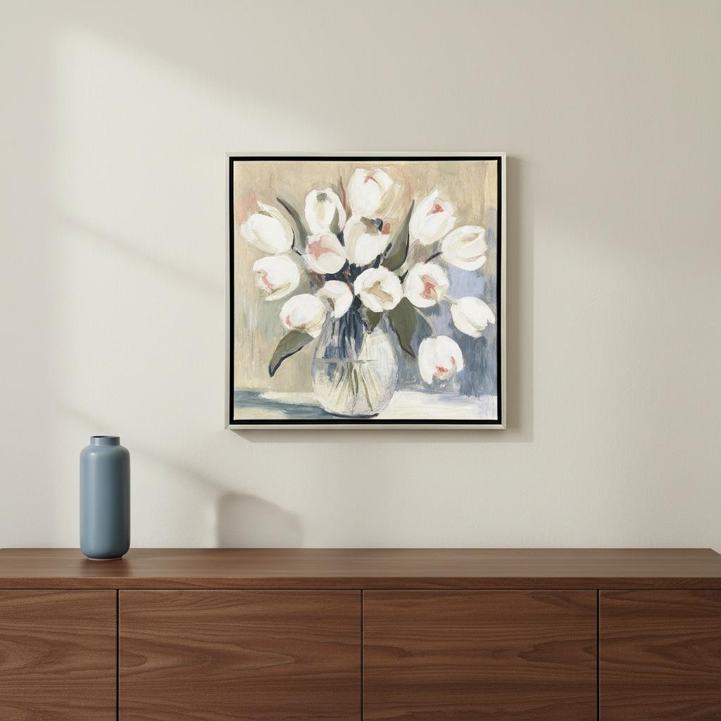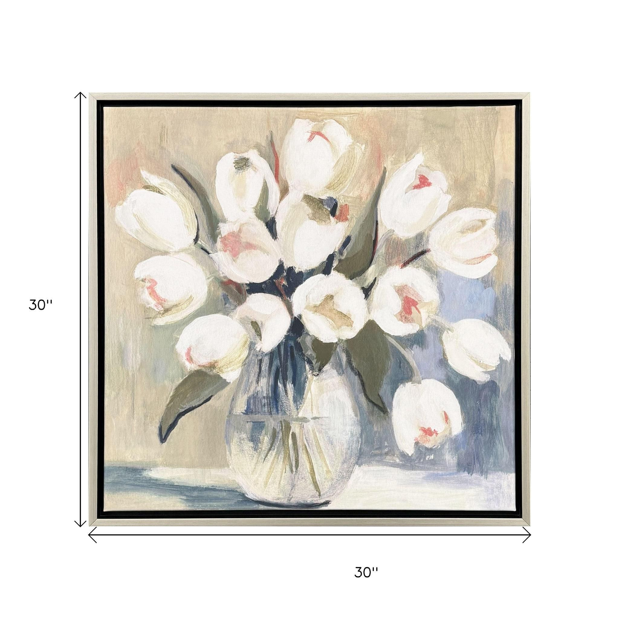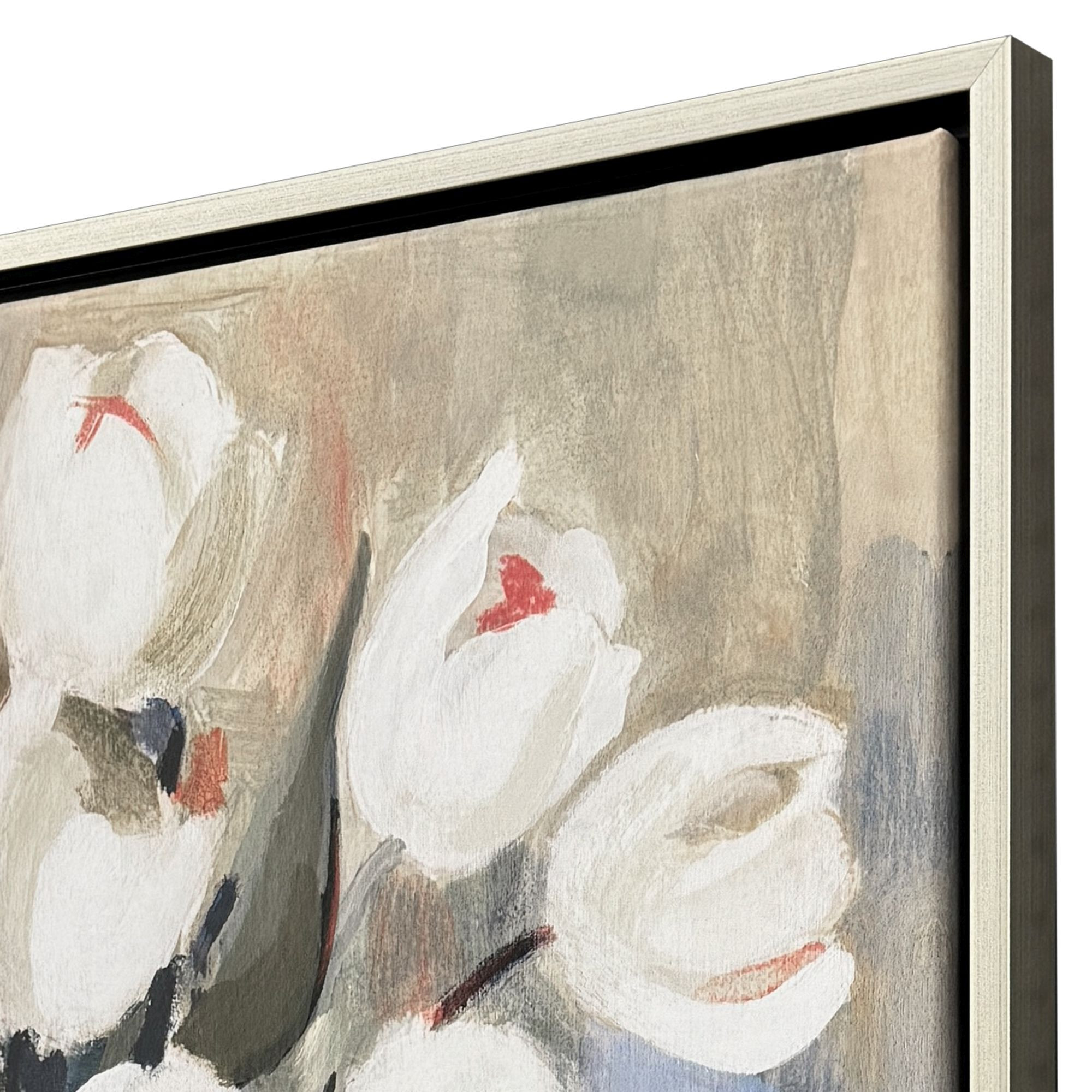 Unique and decorative, this white tulips silver floater frame wall art will leave a lasting impression. Reproduced for you on canvas, this hanging decorative accent will be a trendy and fashionable way to dress your walls. Hang on your wall to add some up to date fashion and decoration. Instantly liven up your space with this art that brings color and dimension to your walls. 30.00-inch h x 30.00-inch w x 2.00-inch d.