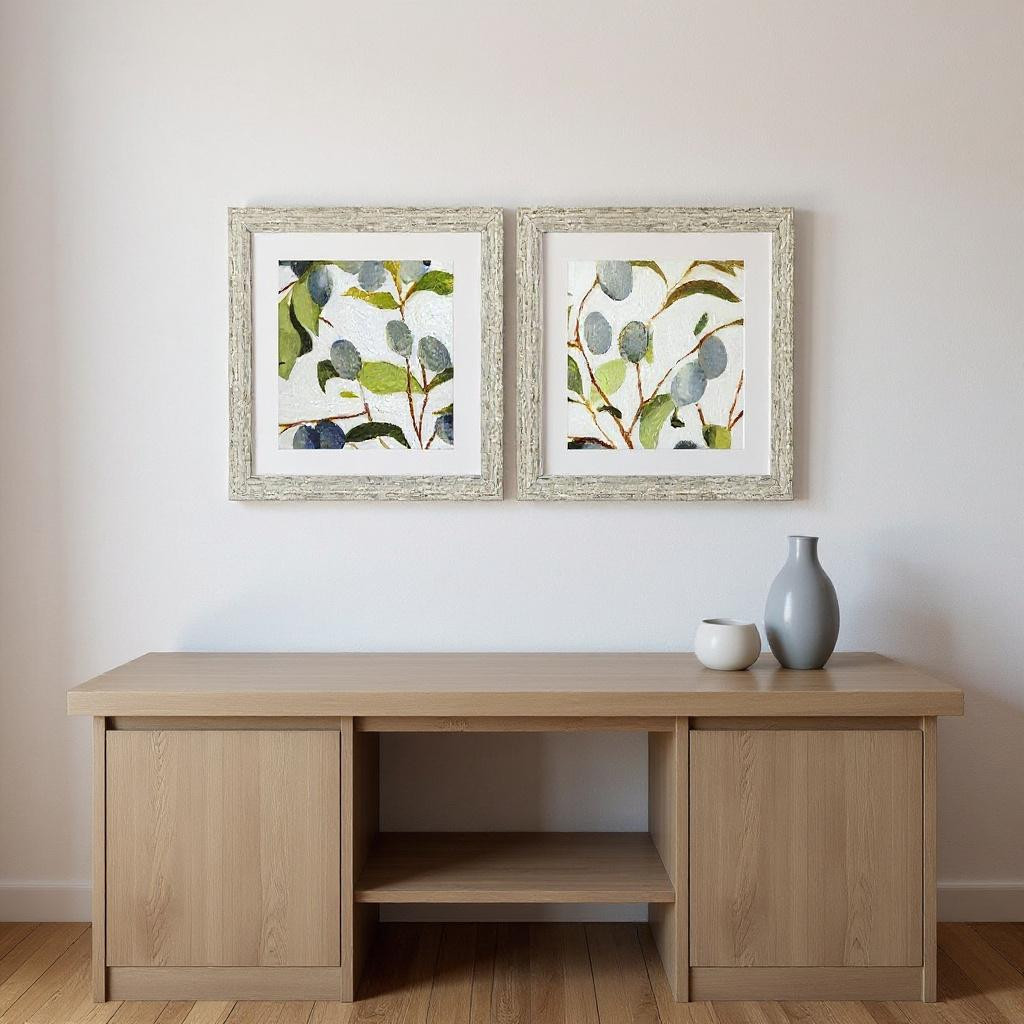Add an air of fashion to your room and rejuvenate the space with this set of two olive branches i distressed white framed wall art. Reproduced for you on paper, this hanging decorative accent will be a trendy and fashionable way to dress your walls. Hang on your wall to add some up to date fashion and decoration. Utilize this opportunity to create a focal point in the room with this fabulous wall decor option. 28.00-inch h x 28.00-inch w x 2.00-inch d.