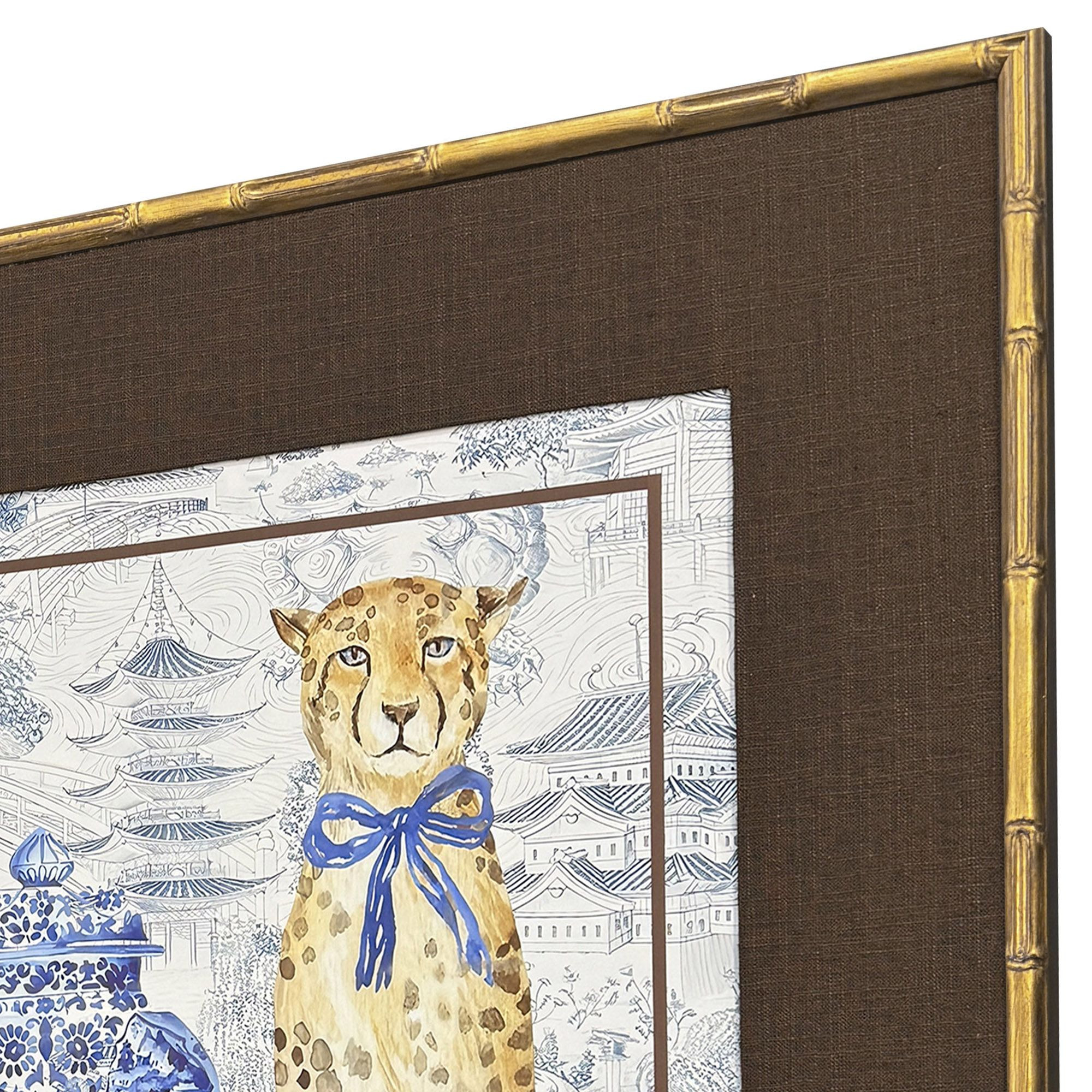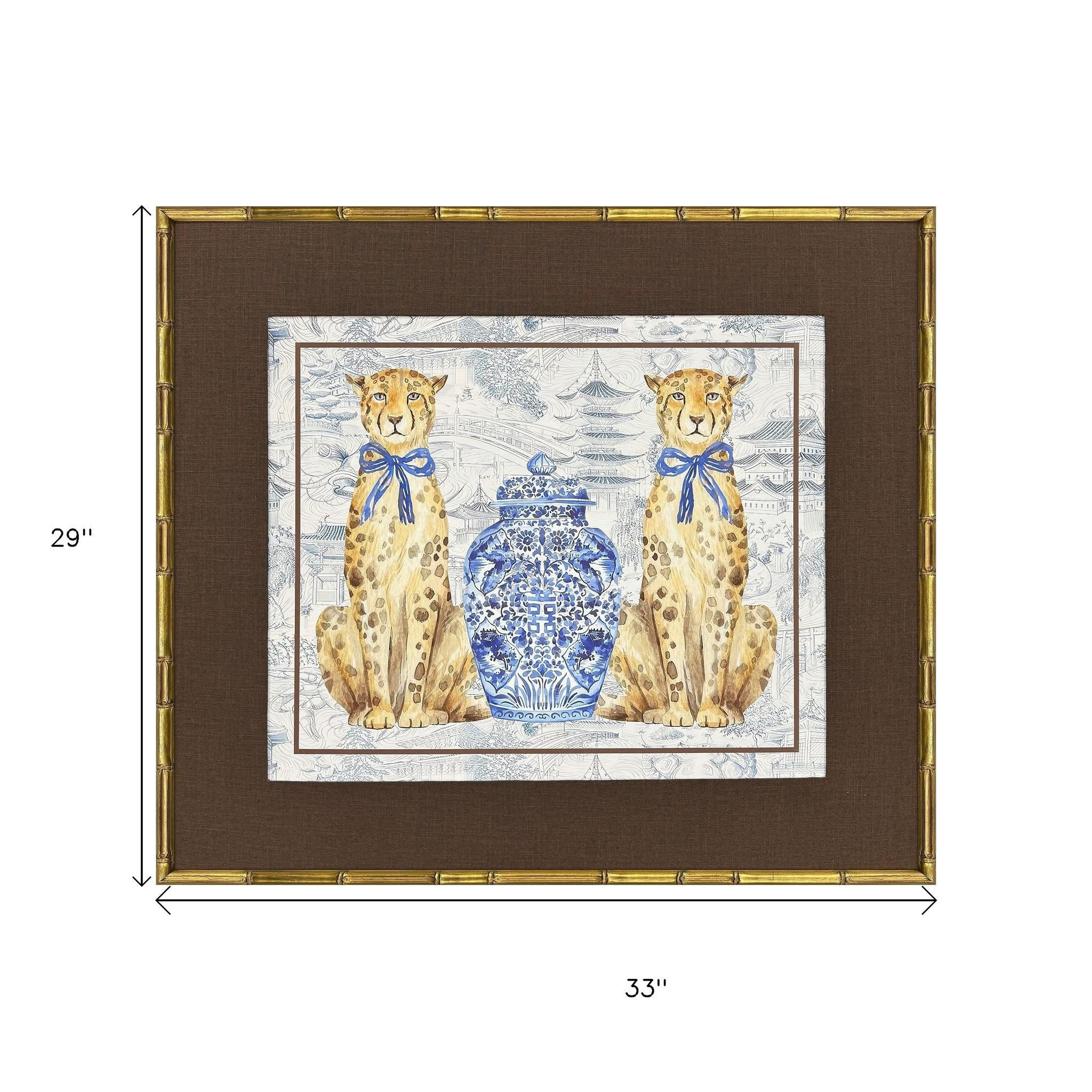 This oriental leopards gold framed wall art will add a beautiful decorative accent to your decor. Bring a little bit of the exotic jungle indoors with this good looking leopard wall art. Reproduced for you on paper, this hanging decorative accent will be a trendy and fashionable way to dress your walls. Adding this hanging wall art to your space to make your room feel more finished and attractive. Utilize this opportunity to create a focal point in the room with this fabulous wall decor option. 29.00-inch h x 33.00-inch w x 2.00-inch d.