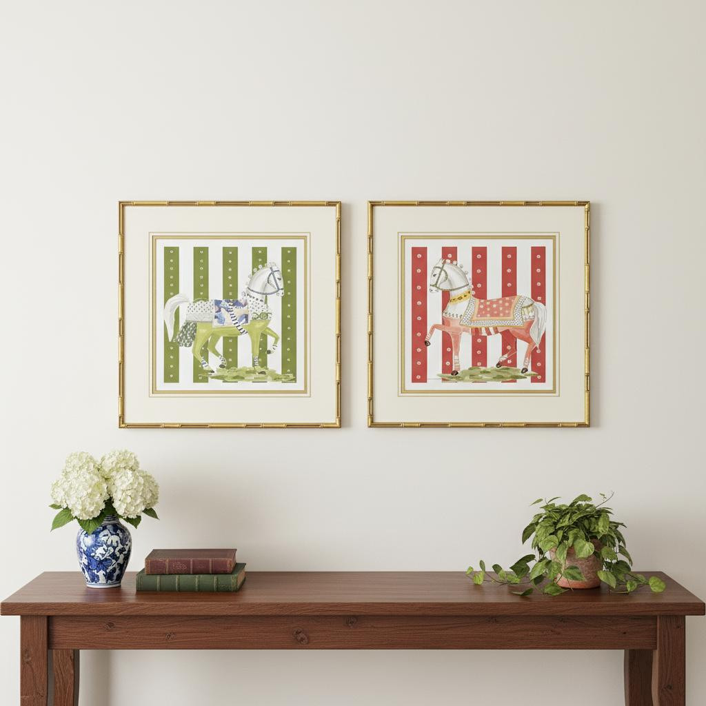 This set of two high stepping gold framed wall art will add a beautiful decorative accent to your decor. Bring a little bit of the farm indoors when you hang this horse artwork. Reproduced for you on paper, this hanging decorative accent will be a trendy and fashionable way to dress your walls. Adding this hanging wall art to your space to make your room feel more finished and attractive. Instantly liven up your space with this art that brings color and dimension to your walls. 25.00-inch h x 25.00-inch w x 2.00-inch d.
