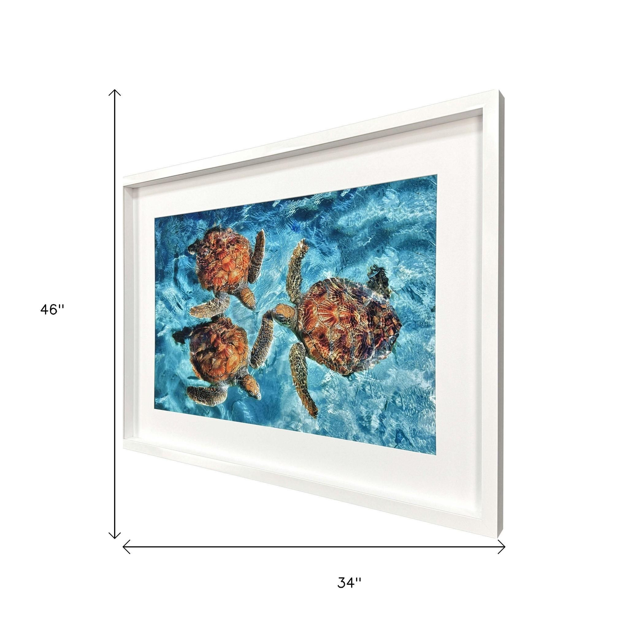 Bring some sizzle to your space with this eye-catching ocean turtles white framed wall art. Bring a little bit of tropical sea life indoors with this good looking turtle art. Reproduced for you on paper, this hanging decorative accent will be a trendy and fashionable way to dress your walls. Hang on your wall to add some up to date fashion and decoration. Instantly liven up your space with this art that brings color and dimension to your walls. 34.00-inch h x 46.00-inch w x 3.00-inch d.
