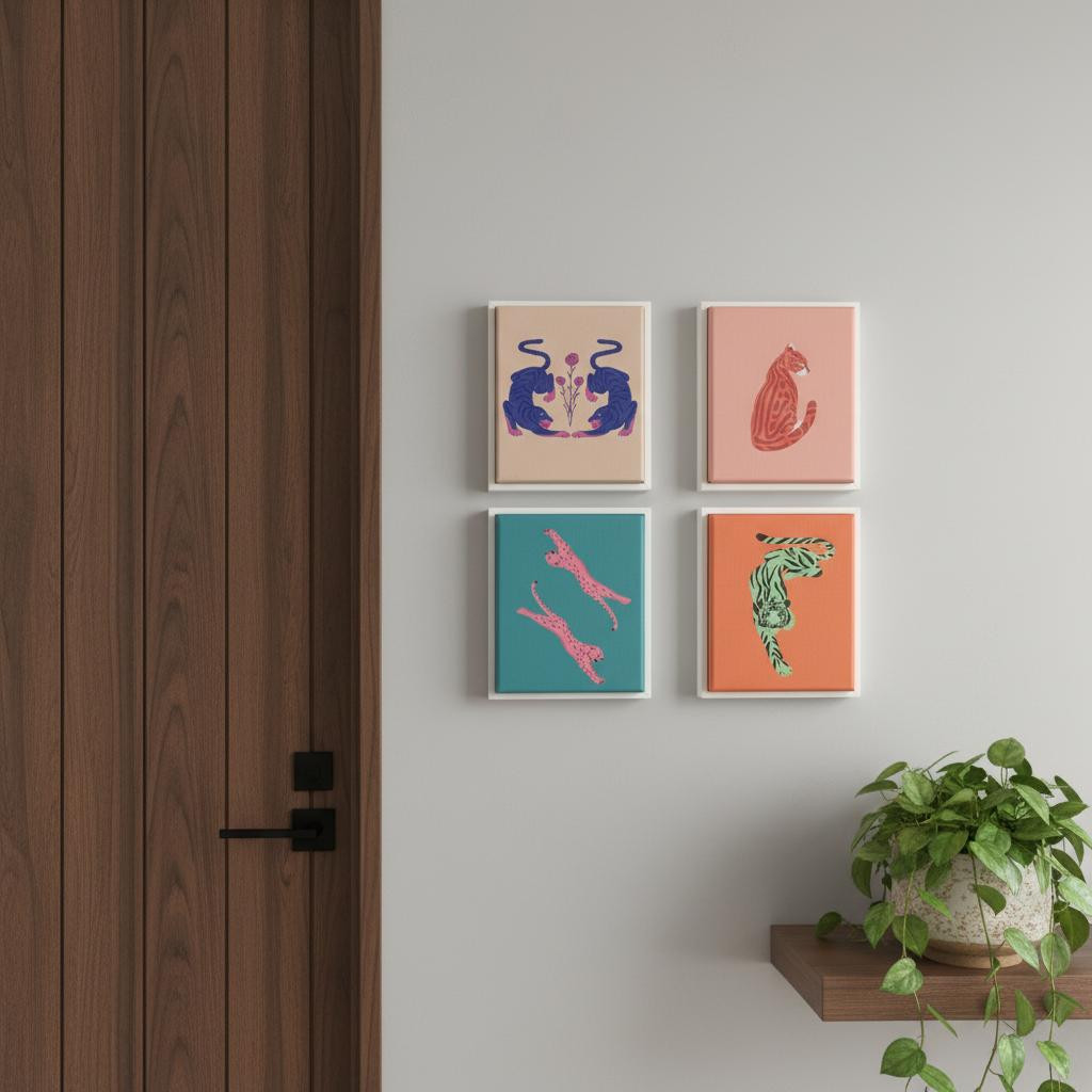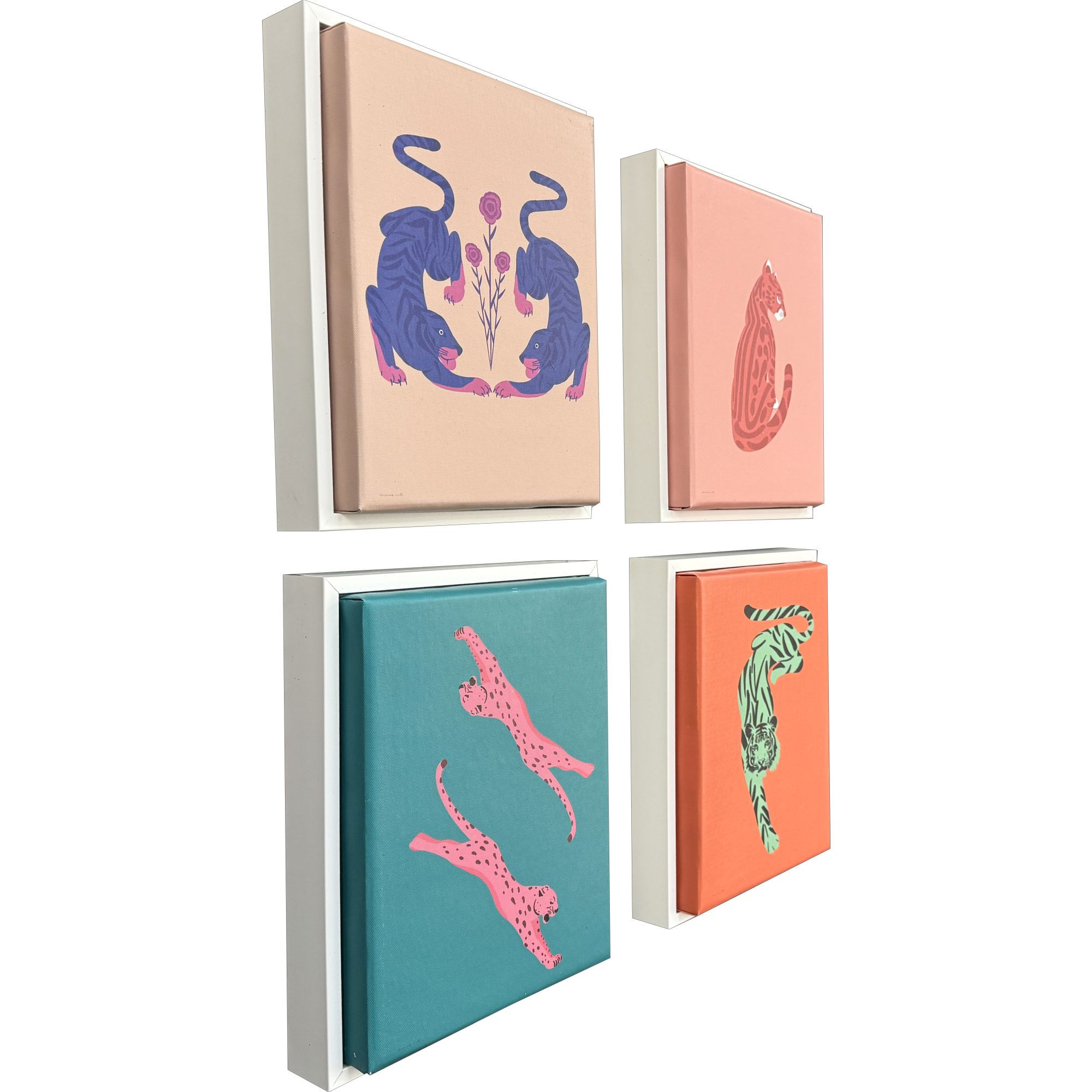 Add an air of fashion to your room and rejuvenate the space with this set of four big cat white framed wall art. Update your walls with this wild jungle animal decor. Reproduced for you on canvas, this hanging decorative accent will be a trendy and fashionable way to dress your walls. Hang on your wall to add some up to date fashion and decoration. Instantly liven up your space with this art that brings color and dimension to your walls. 11.00-inch h x 9.00-inch w x 3.00-inch d.