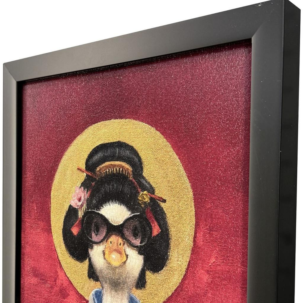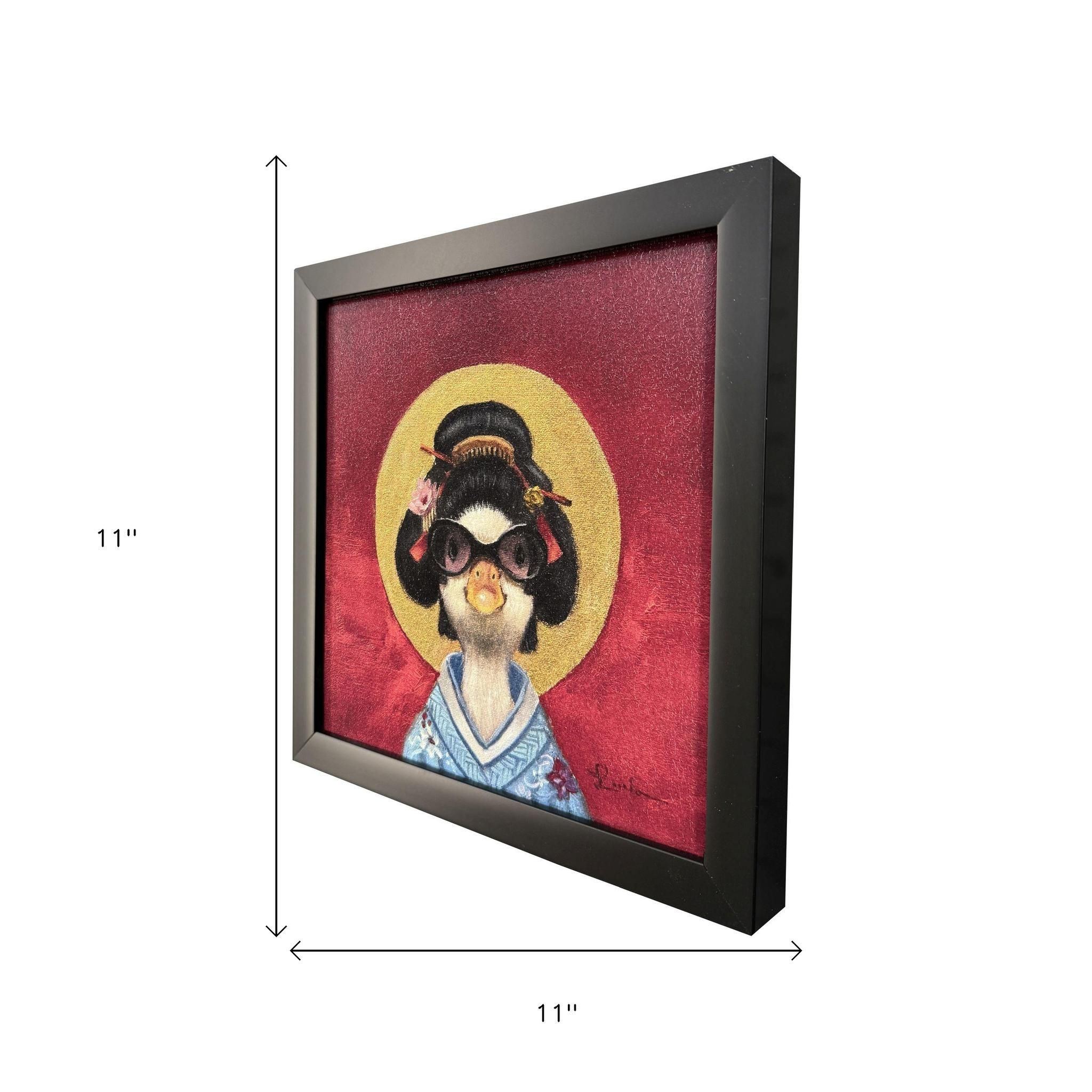Unique and decorative, this geisha duck black framed wall art will leave a lasting impression. This bird inspired art will be a great addition to your space. Reproduced for you on paper, this hanging decorative accent will be a trendy and fashionable way to dress your walls. Hang on your wall to add some up to date fashion and decoration. Utilize this opportunity to create a focal point in the room with this fabulous wall decor option. 11.00-inch h x 11.00-inch w x 2.00-inch d.