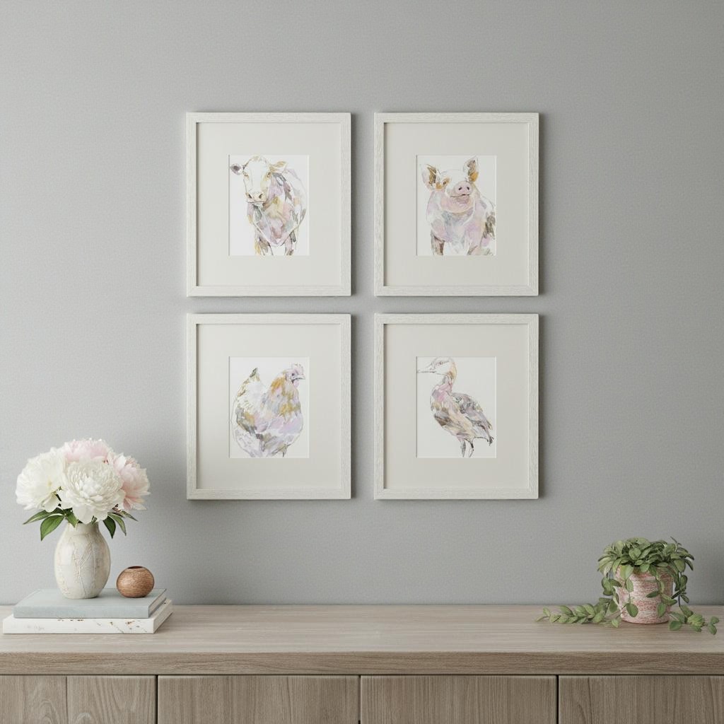 Bring some sizzle to your space with this eye-catching set of four barnyard buds distressed white framed wall art. Bring a little bit of the farm indoors when you hang this cow artwork. Reproduced for you on paper, this hanging decorative accent will be a trendy and fashionable way to dress your walls. Adding this hanging wall art to your space to make your room feel more finished and attractive. Utilize this opportunity to create a focal point in the room with this fabulous wall decor option. 17.00-inch h x 15.00-inch w x 1.00-inch d.
