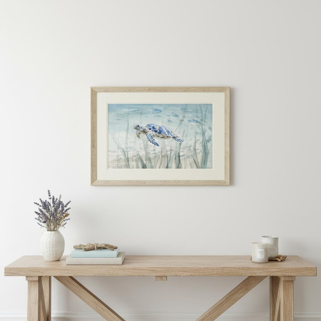 This undersea turtle brown framed wall art will add a beautiful decorative accent to your decor. Bring a little bit of tropical sea life indoors with this good looking turtle art. Reproduced for you on paper, this hanging decorative accent will be a trendy and fashionable way to dress your walls. Adding this hanging wall art to your space to make your room feel more finished and attractive. Utilize this opportunity to create a focal point in the room with this fabulous wall decor option. 27.00-inch h x 36.00-inch w x 1.00-inch d.