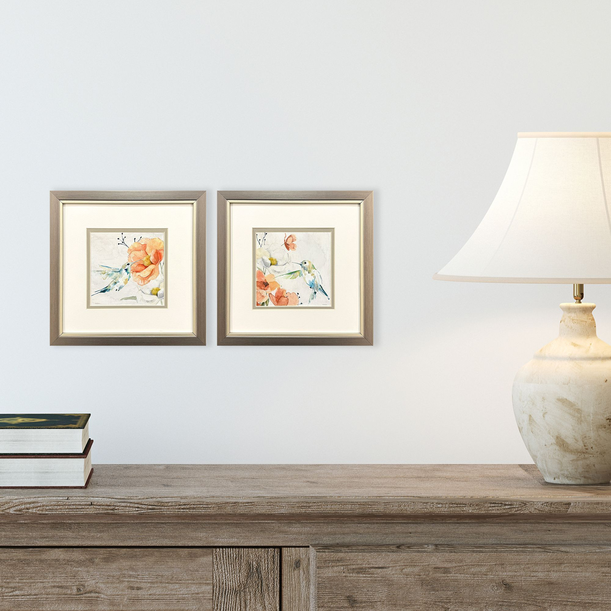 Bring some sizzle to your space with this eye-catching set of two floral hummingbird silver framed wall art. Reproduced for you on paper, this hanging decorative accent will be a trendy and fashionable way to dress your walls. Adding this hanging wall art to your space to make your room feel more finished and attractive. Utilize this opportunity to create a focal point in the room with this fabulous wall decor option. 11.00-inch h x 11.00-inch w x 1.00-inch d.