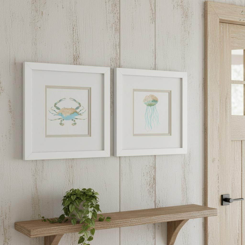 Unique and decorative, this set of two sea creatures ii white framed wall art will leave a lasting impression. Reproduced for you on paper, this hanging decorative accent will be a trendy and fashionable way to dress your walls. Adding this hanging wall art to your space to make your room feel more finished and attractive. Utilize this opportunity to create a focal point in the room with this fabulous wall decor option. 11.00-inch h x 11.00-inch w x 2.00-inch d.