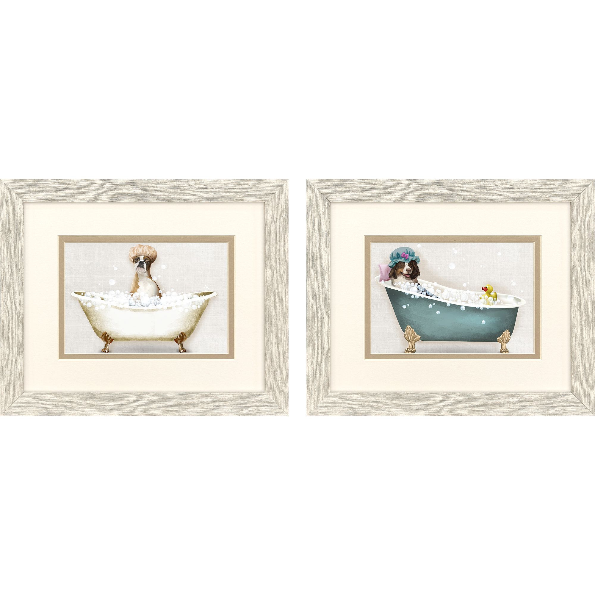 Unique and decorative, this set of two bath dogs i distressed white framed wall art will leave a lasting impression. This dog artwork is a great reminder of man's best friend. Reproduced for you on paper, this hanging decorative accent will be a trendy and fashionable way to dress your walls. Adding this hanging wall art to your space to make your room feel more finished and attractive. Utilize this opportunity to create a focal point in the room with this fabulous wall decor option. 9.00-inch h x 11.00-inch w x 1.00-inch d.