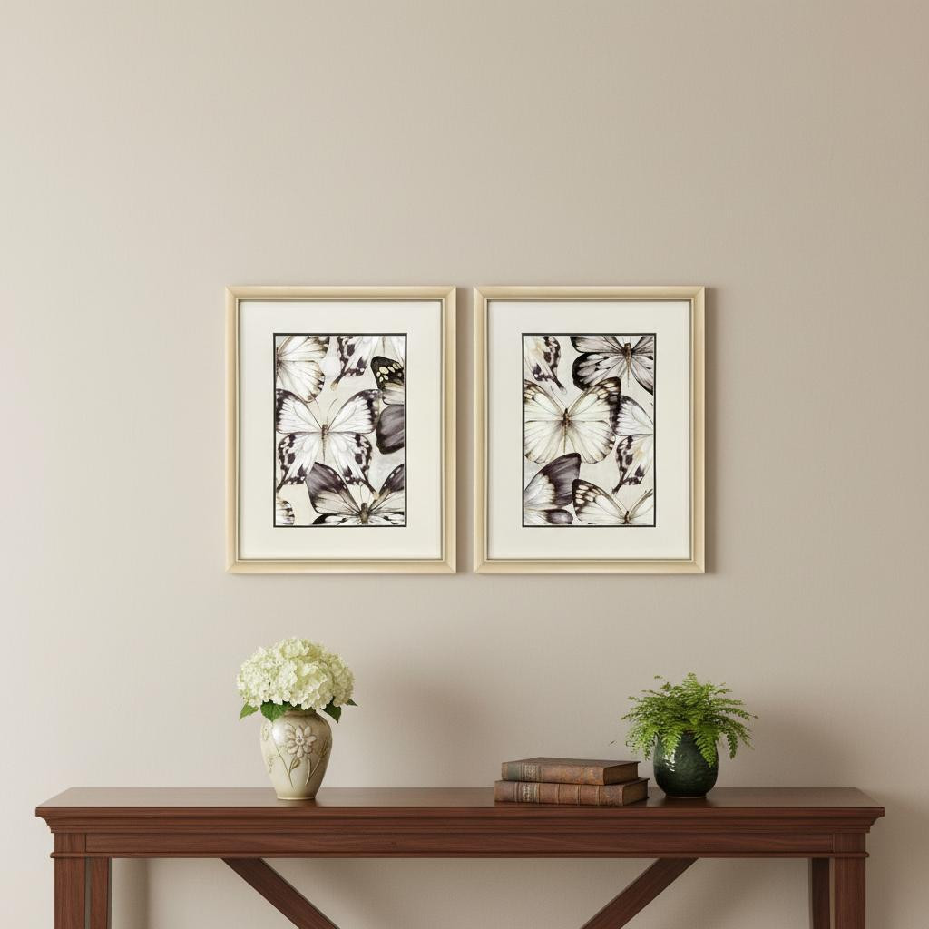 Add an air of fashion to your room and rejuvenate the space with this set of two butterfly cluster gold framed wall art. This butterfly inspired art will be a great addition to your space. Reproduced for you on paper, this hanging decorative accent will be a trendy and fashionable way to dress your walls. Hang on your wall to add some up to date fashion and decoration. Utilize this opportunity to create a focal point in the room with this fabulous wall decor option. 26.00-inch h x 20.00-inch w x 2.00-inch d.