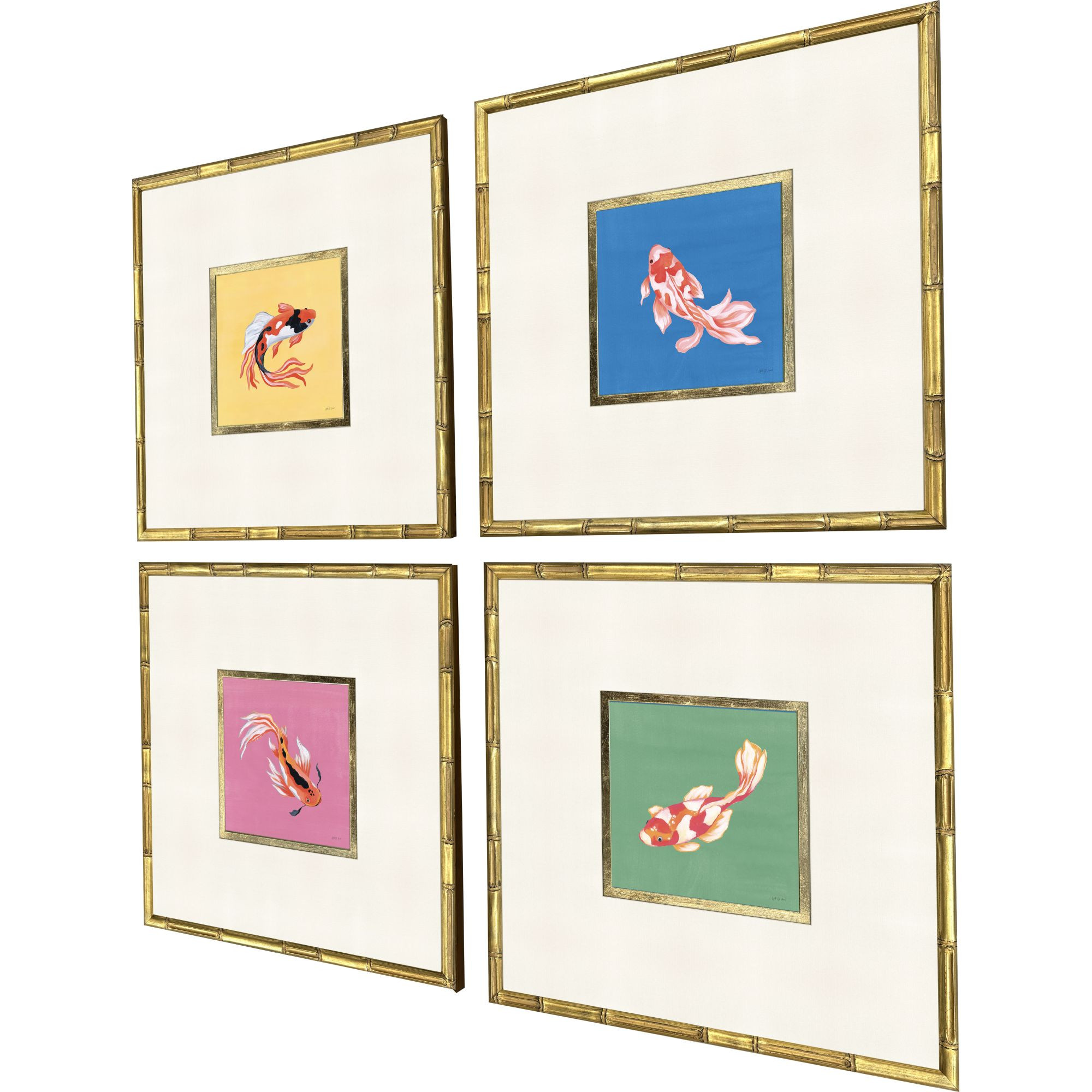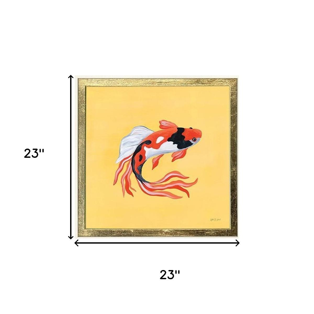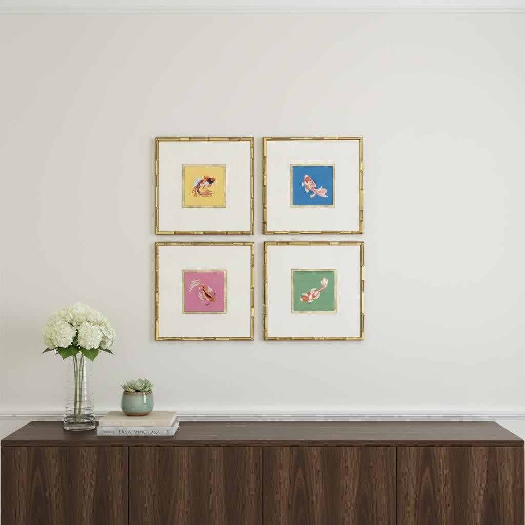 The set of four colorful koi gold framed wall art is the perfect decorative accessory for your home. Bring a little bit of tropical sea life indoors with this good looking fish art. Reproduced for you on paper, this hanging decorative accent will be a trendy and fashionable way to dress your walls. Adding this hanging wall art to your space to make your room feel more finished and attractive. Utilize this opportunity to create a focal point in the room with this fabulous wall decor option. 23.00-inch h x 23.00-inch w x 2.00-inch d.