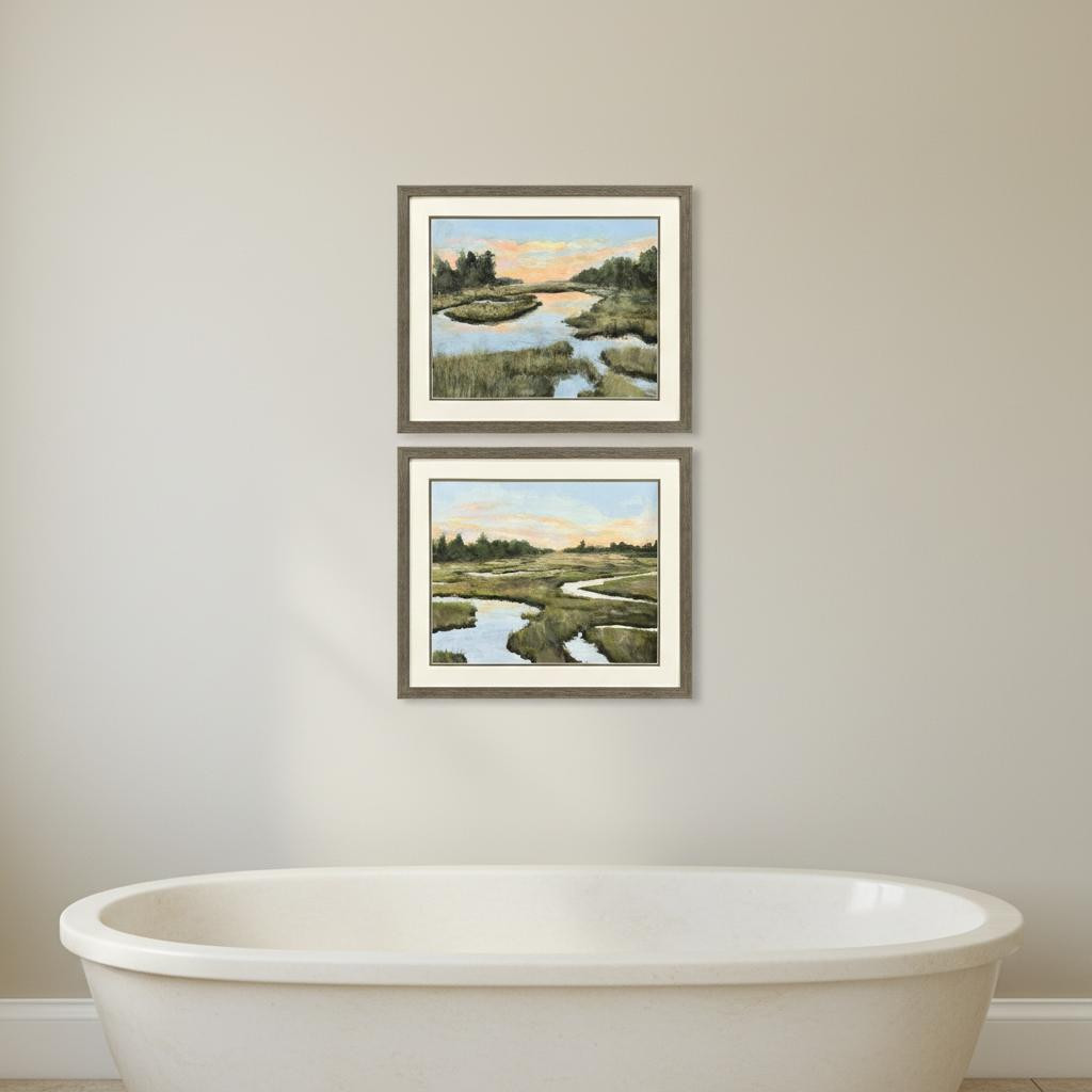 This set of two low county estuary brown framed wall art will add a beautiful decorative accent to your decor. This block print is a way to express your artistic style and add some fashion to your walls. Reproduced for you on paper, this hanging decorative accent will be a trendy and fashionable way to dress your walls. Hang on your wall to add some up to date fashion and decoration. Utilize this opportunity to create a focal point in the room with this fabulous wall decor option. 22.00-inch h x 26.00-inch w x 2.00-inch d.