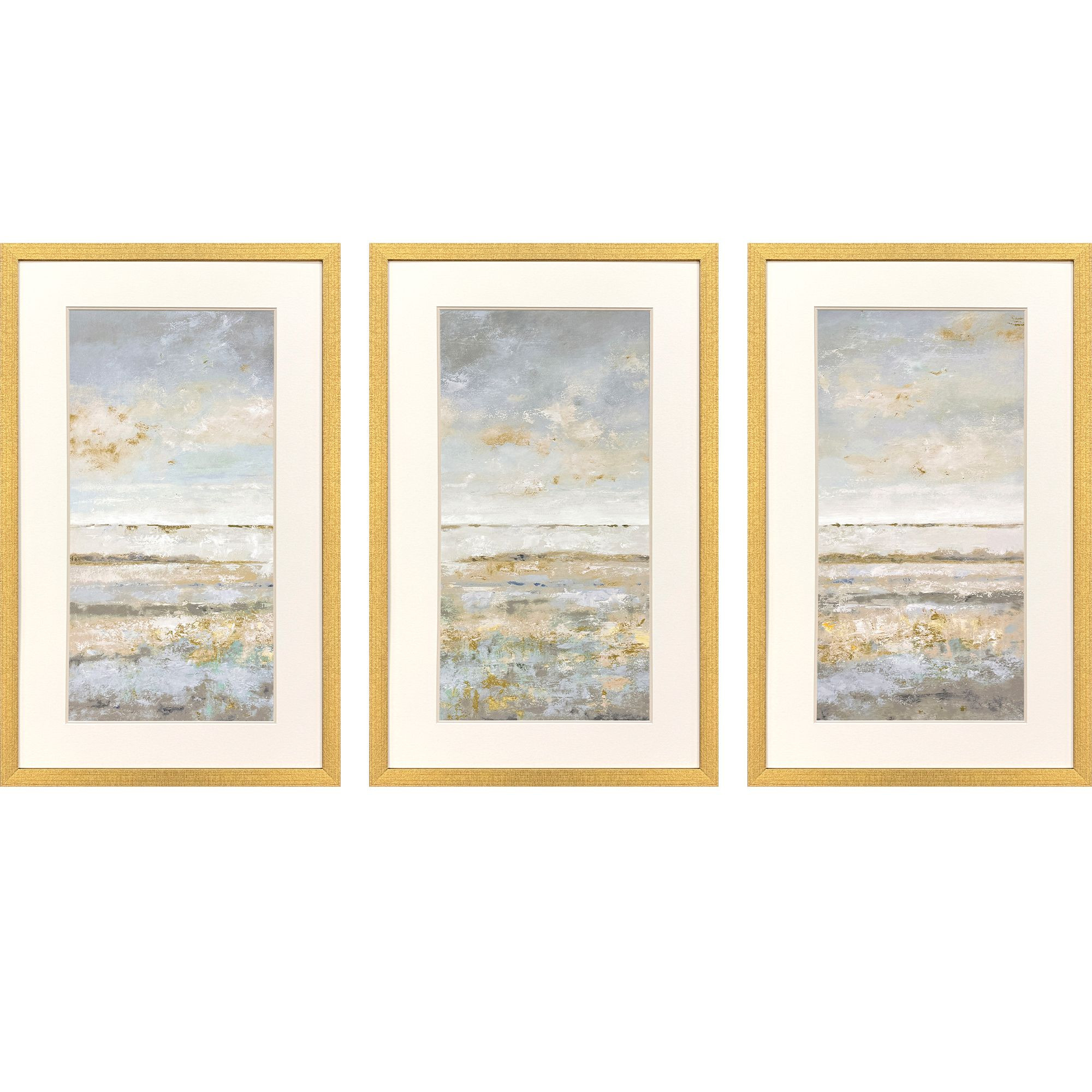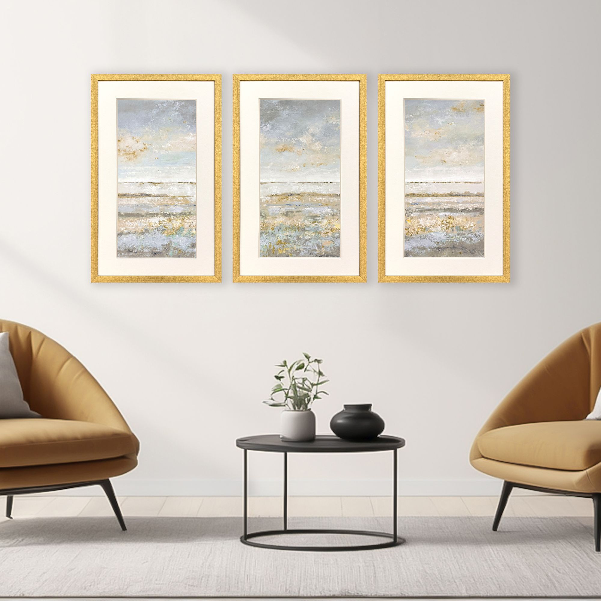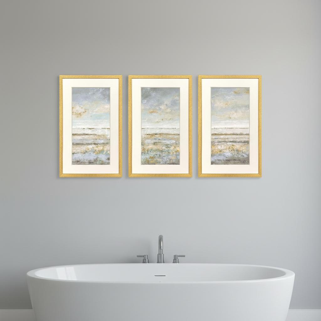 Unique and decorative, this set of three sea horizon distressed gold framed wall art will leave a lasting impression. This block print is a way to express your artistic style and add some fashion to your walls. Reproduced for you on paper, this hanging decorative accent will be a trendy and fashionable way to dress your walls. Adding this hanging wall art to your space to make your room feel more finished and attractive. Utilize this opportunity to create a focal point in the room with this fabulous wall decor option. 32.00-inch h x 20.00-inch w x 2.00-inch d.
