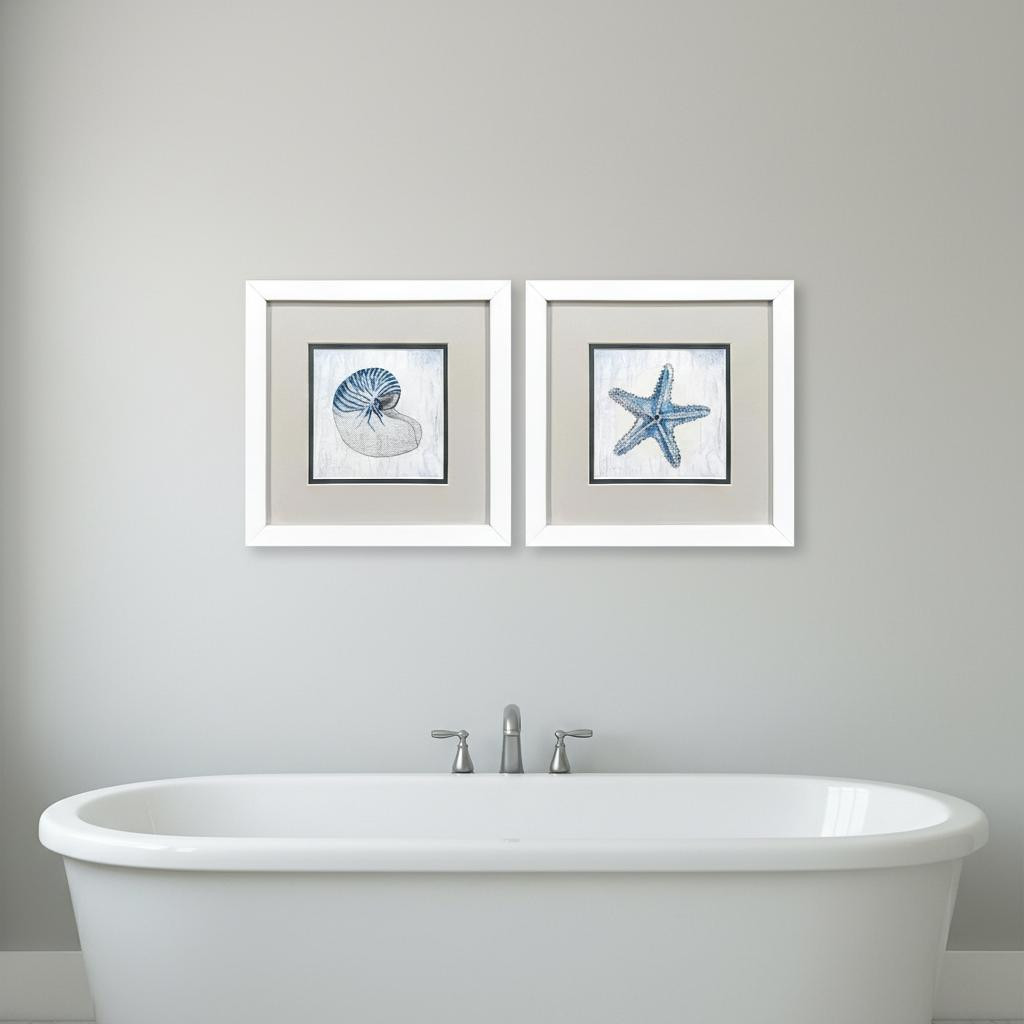 Bring some sizzle to your space with this eye-catching set of two azure shell white framed wall art. This block print is a way to express your artistic style and add some fashion to your walls. Reproduced for you on paper, this hanging decorative accent will be a trendy and fashionable way to dress your walls. Adding this hanging wall art to your space to make your room feel more finished and attractive. Utilize this opportunity to create a focal point in the room with this fabulous wall decor option. 11.00-inch h x 11.00-inch w x 2.00-inch d.