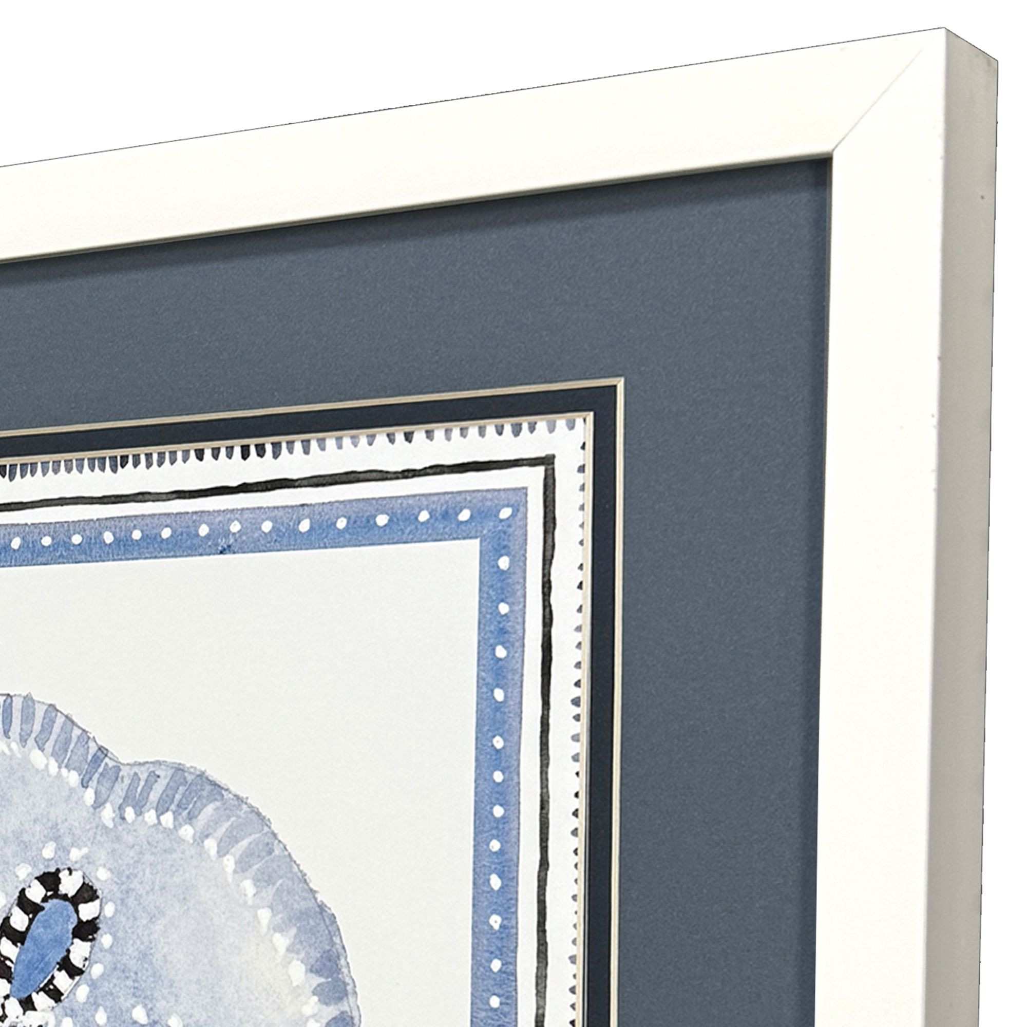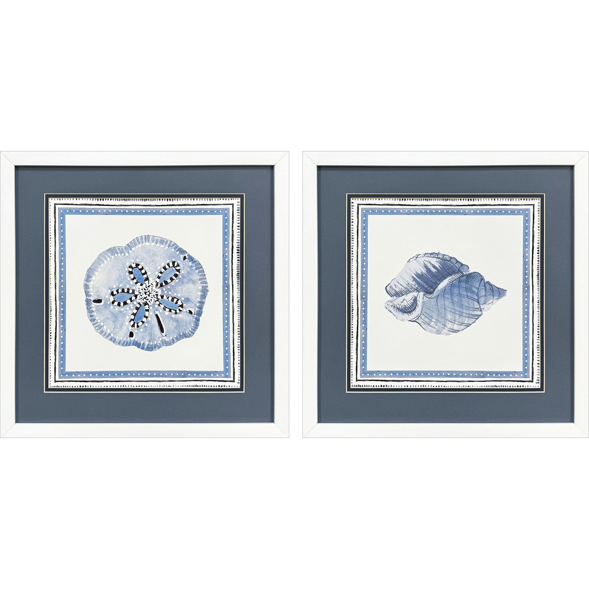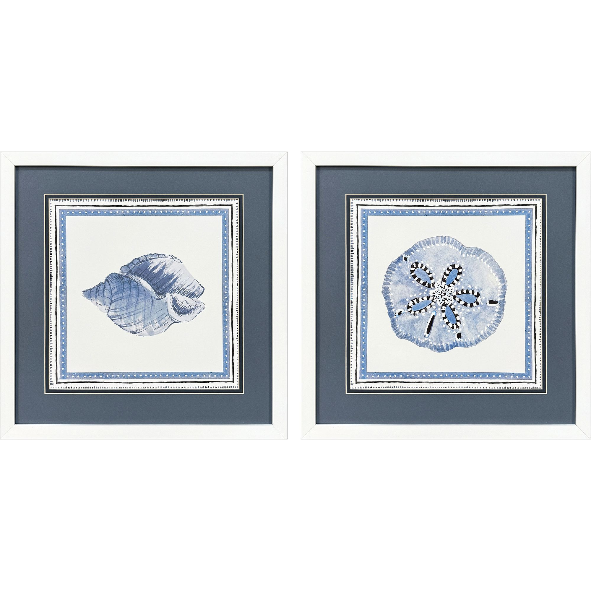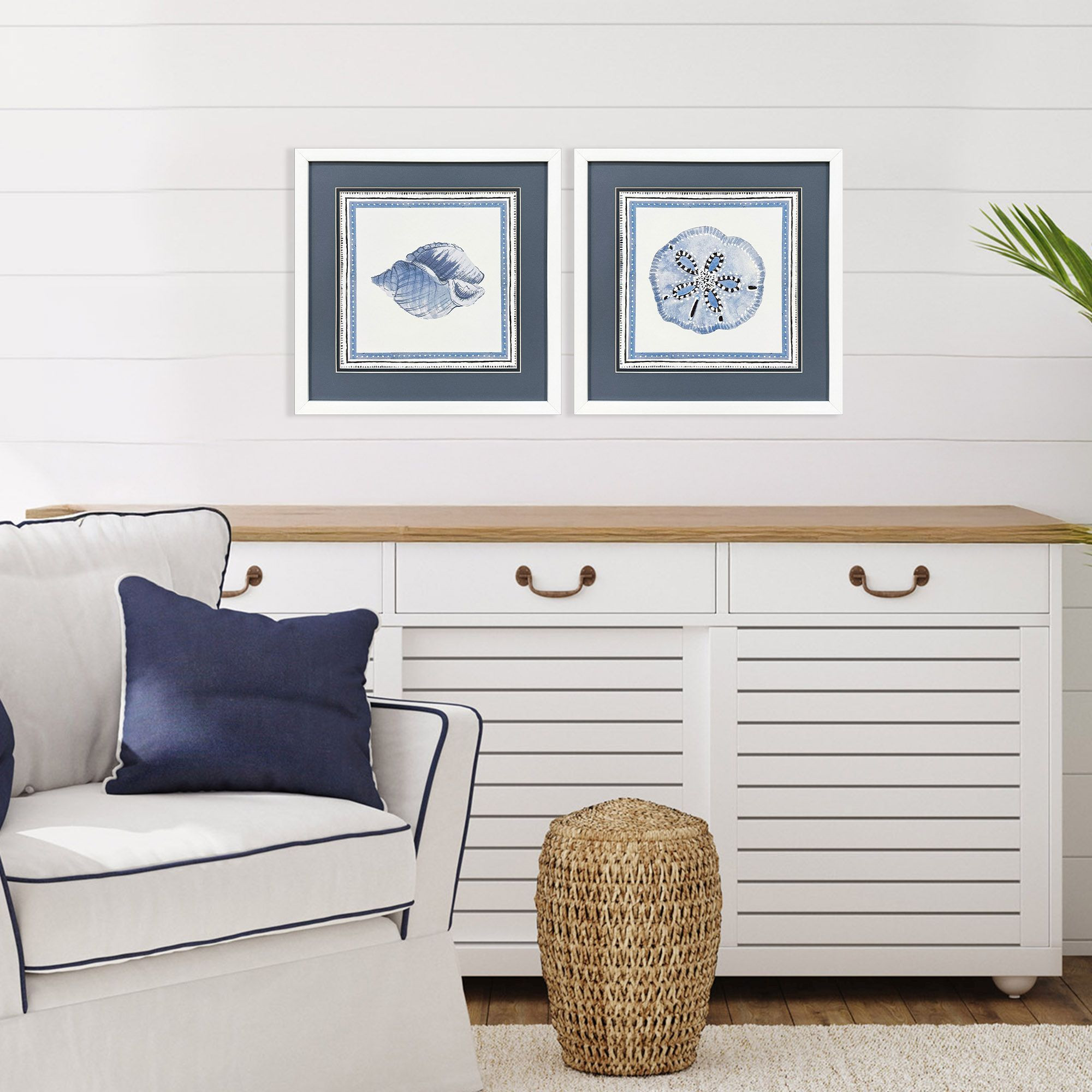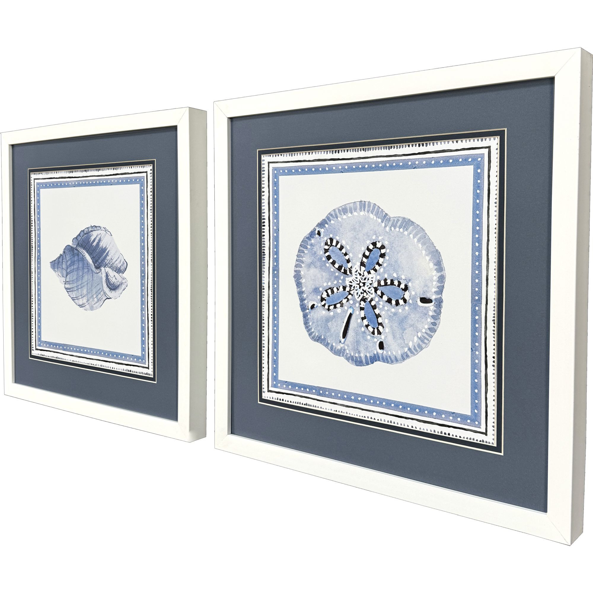 Unique and decorative, this set of two seaside blues i white framed wall art will leave a lasting impression. This block print is a way to express your artistic style and add some fashion to your walls. Reproduced for you on paper, this hanging decorative accent will be a trendy and fashionable way to dress your walls. Hang on your wall to add some up to date fashion and decoration. Instantly liven up your space with this art that brings color and dimension to your walls. 17.00-inch h x 17.00-inch w x 2.00-inch d.