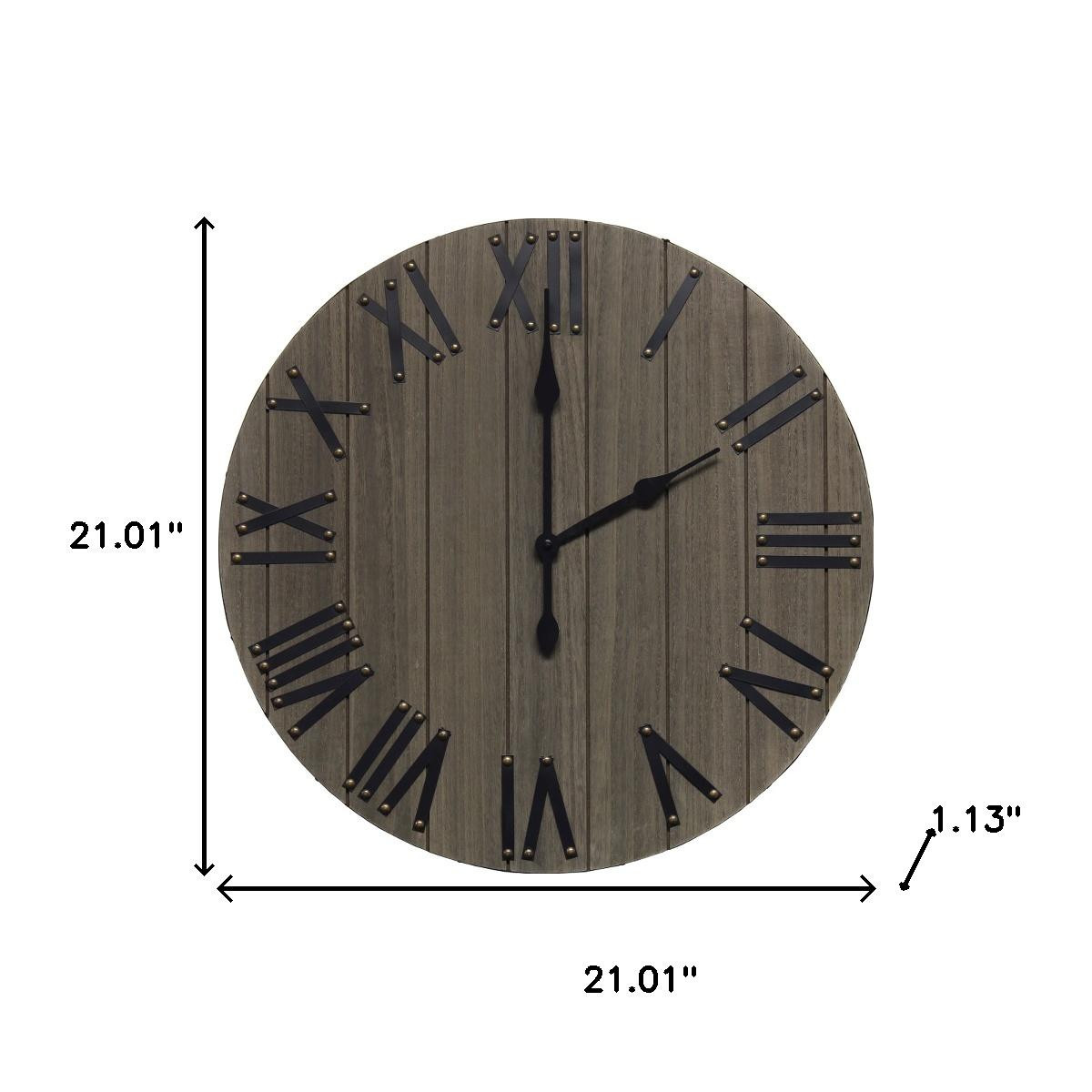 This 21-inch black and gray rustic wood silent analog round wall clock includes three moving hands on the face that move smoothly to indicate the hour, minute and seconds. Has a traditional circle shape, which brings an essence of wholeness to your home. The clock face not only looks good but is made from sturdy MDF in a modern farmhouse rustic finish that will stand the test of time. Elevate the decor of any room in your house. The eye-catching makeup of this clock will ensure that you never run late again. 21.01-inch h x 21.01-inch w x 1.13-inch d.