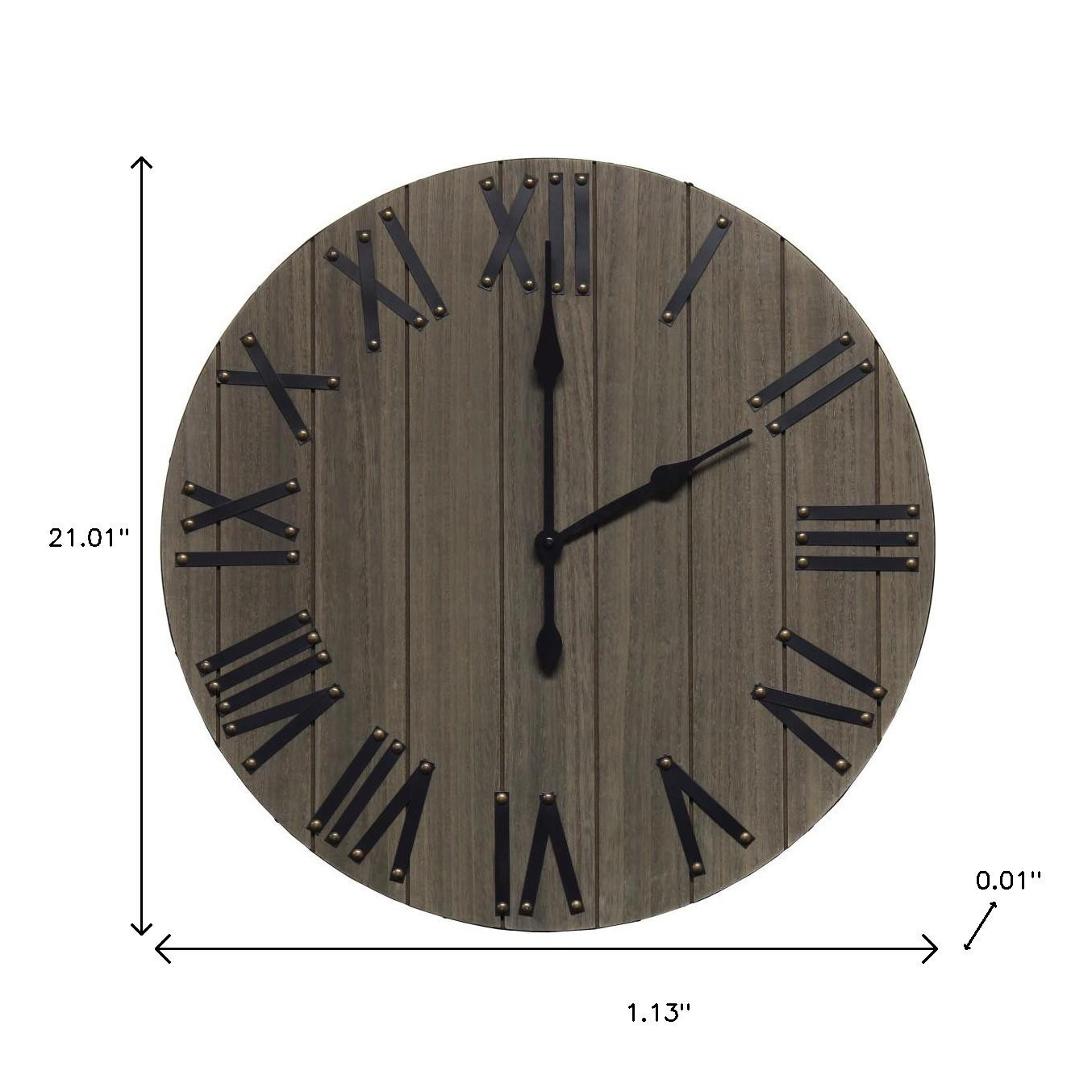 This 1-inch gray and black manufactured wood silent analog vintage style crackle round wall clock includes three moving hands on the face that move smoothly to indicate the hour, minute and seconds. The circle shape of this clock will bring a sense of wholeness to your home. The clock face not only looks good but is made from sturdy mdf that will stand the test of time. Stay on track with this elegant and efficient clock. With its unique design and practical purpose, this clock will add flair to your home while also acting as an essential tool. 21.01-inch h x 1.13-inch w x 0.01-inch d.