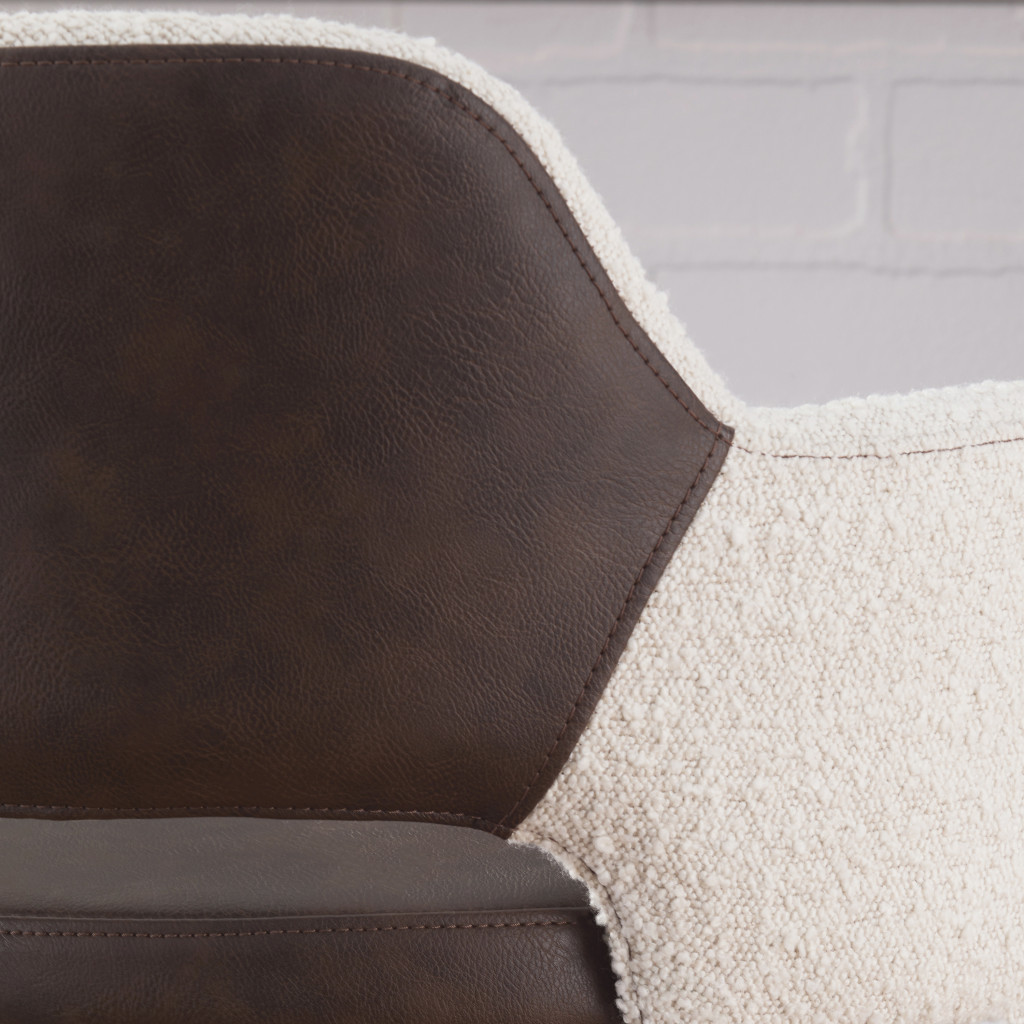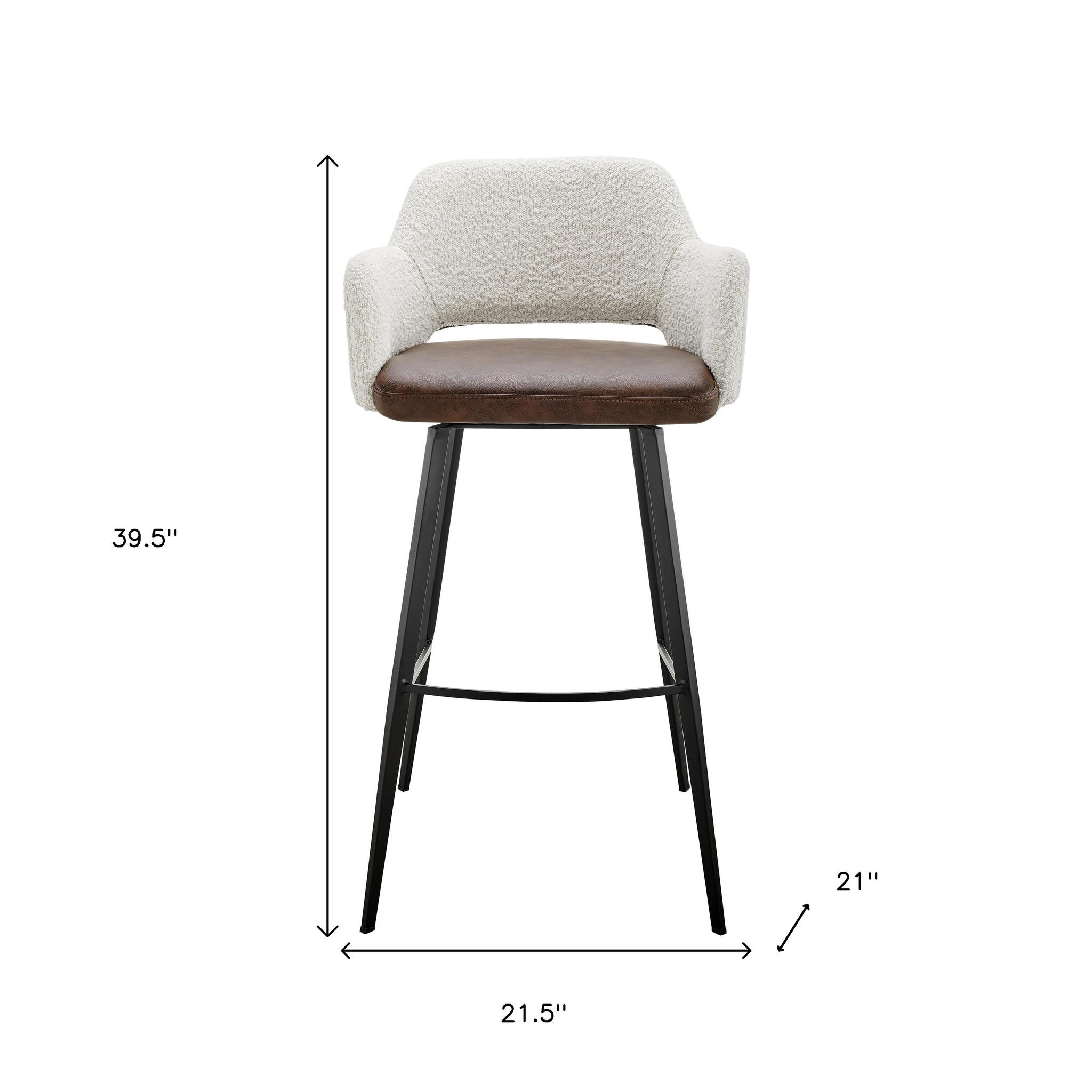 Bring a trendy bar vibe to your space, with this 30-inch ivory brown and black boucle faux leather and steel bar height swivel bar chair. The base of this stool is made from steel in a black color that is a nice contrast to the brown and ivory mixed materials of the seat. A full back mixed is upholstered with nubby textural boucle while the bucket shaped seat design is upholstered in a brown vintage style weathered faux leather. This chic chair is both comfortable and fashionable. 39.50-inch h x 21.50-inch w x 21.00-inch d.