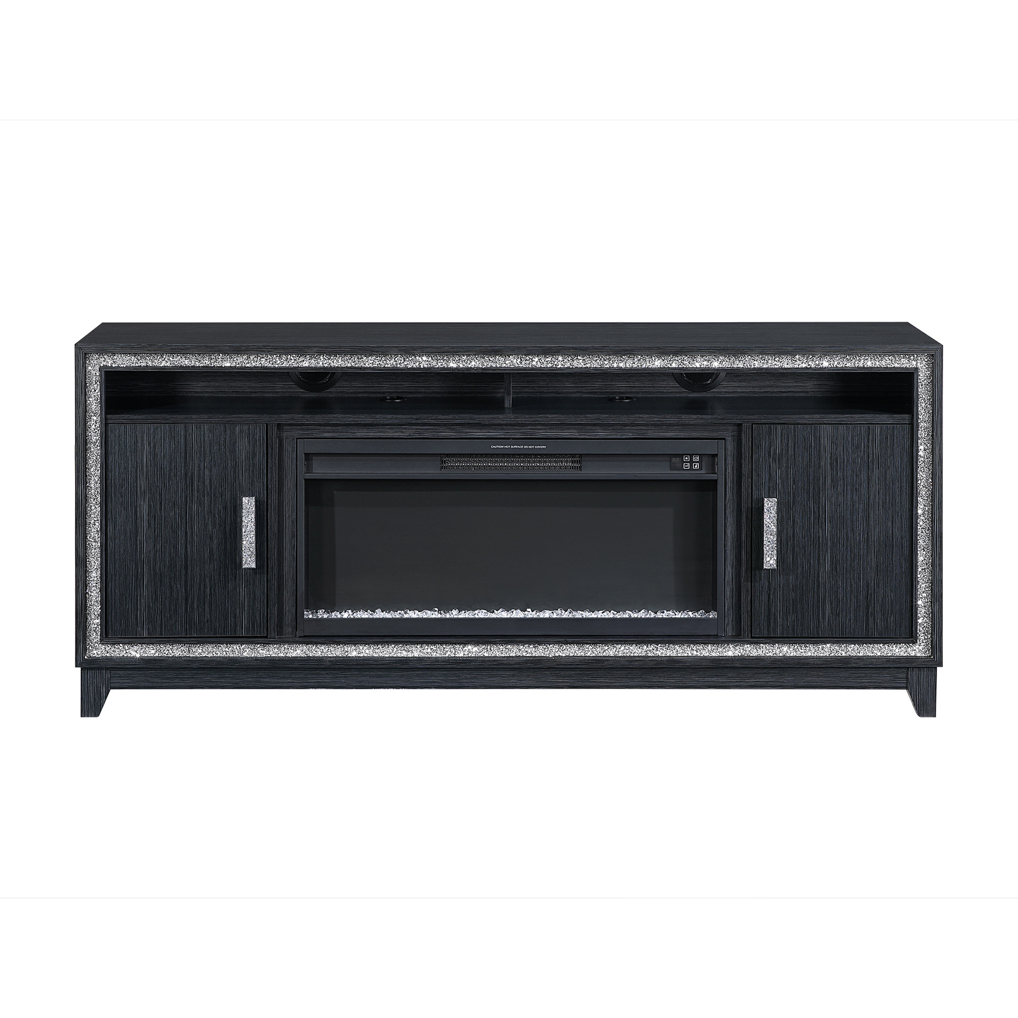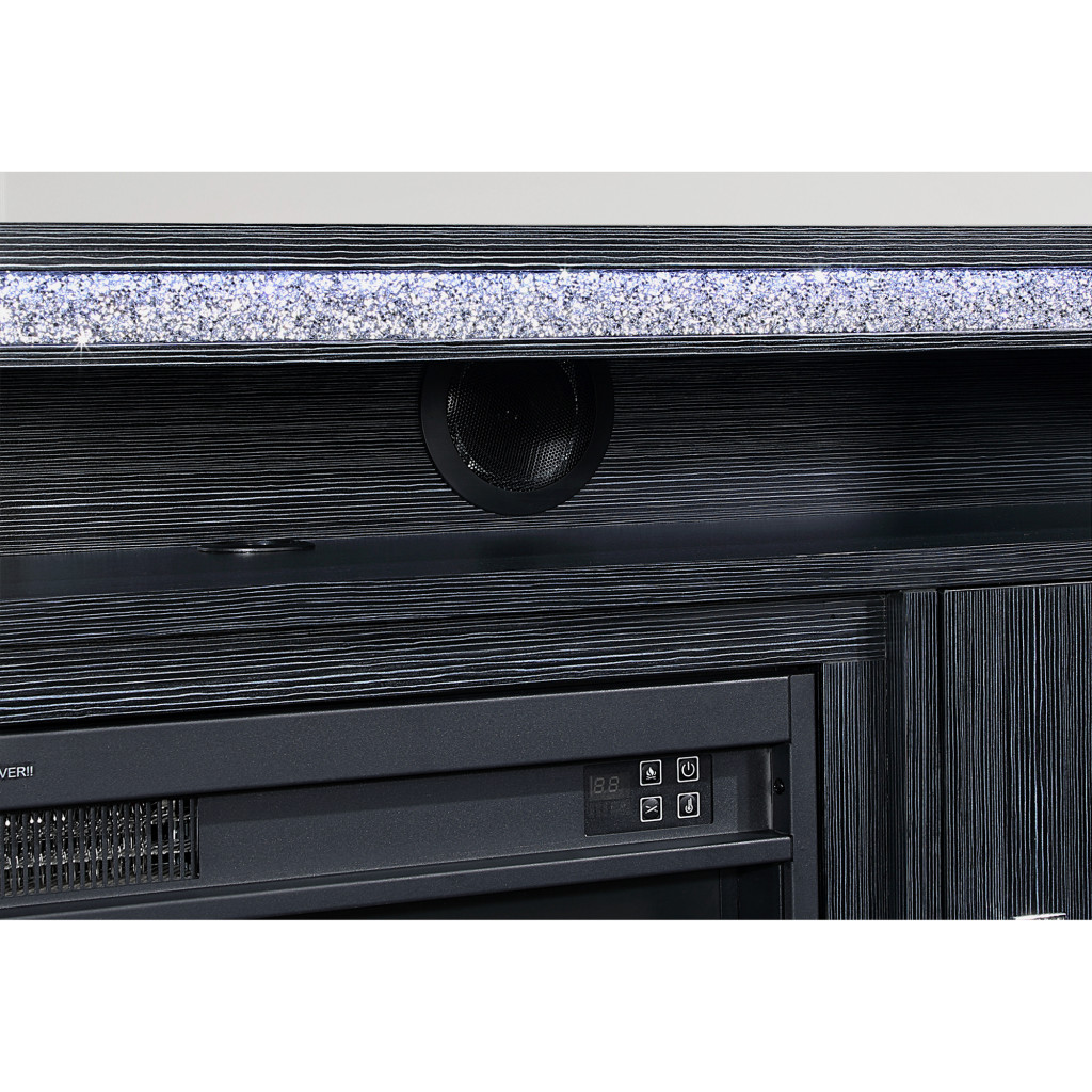 The 75-inch gray and silver faux crystal and wood storage cabinet electric fireplace with led and speaker combines elegance and functionality. This electric fireplace not only offers warmth but also features a stunning design that enhances any living space. Equipped with a remote control, LED lighting, both open and concealed storage, and built-in speakers, this piece is all set to create a gentle glow, beautiful ambiance, and cozy experience. This versatile piece serves as both a decorative accent and a practical storage solution, making it an ideal addition to your home decor. Experience comfort and style all in one sophisticated unit. 32.25-inch h x 75.00-inch w x 18.00-inch d.
