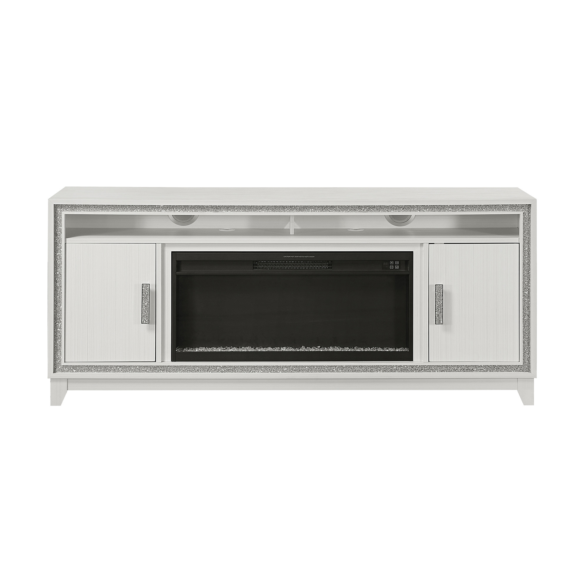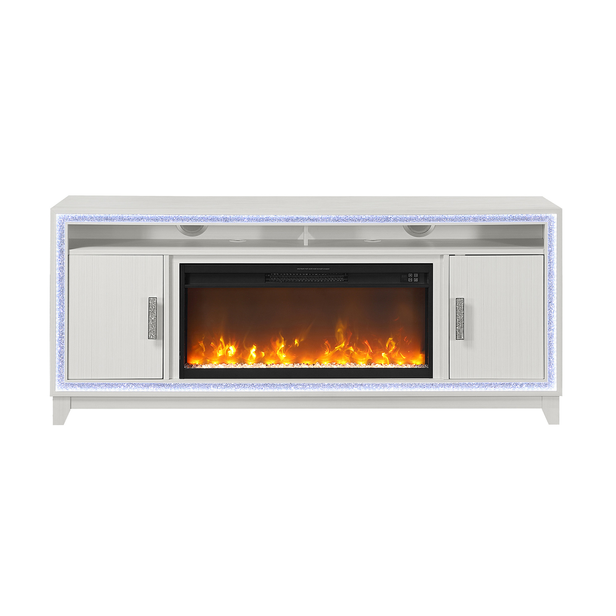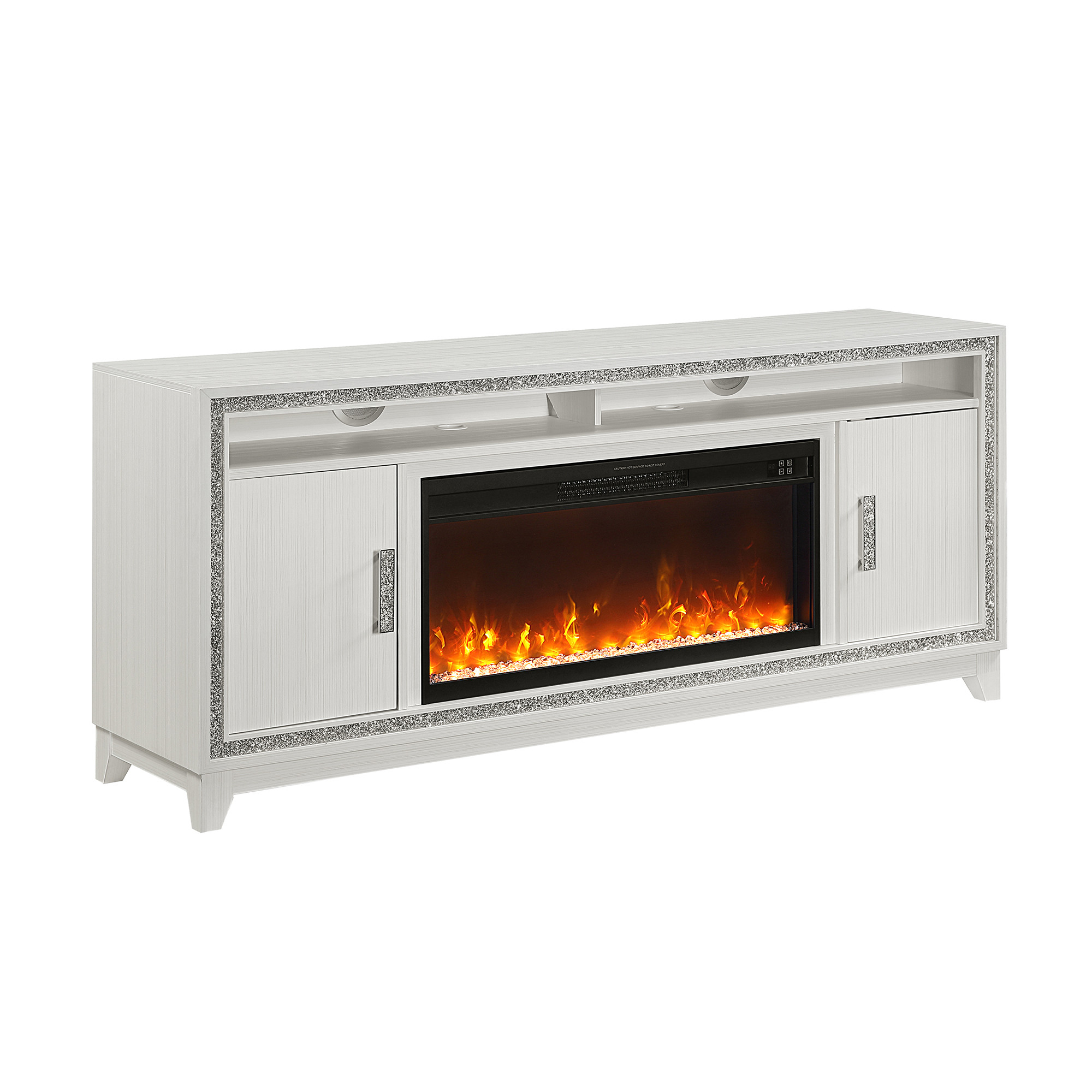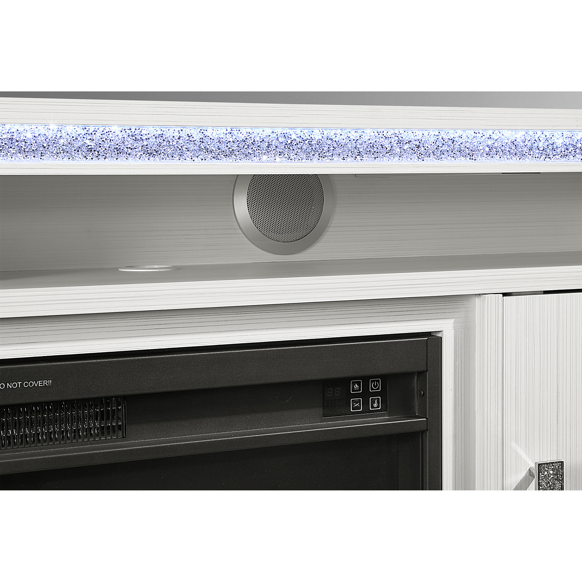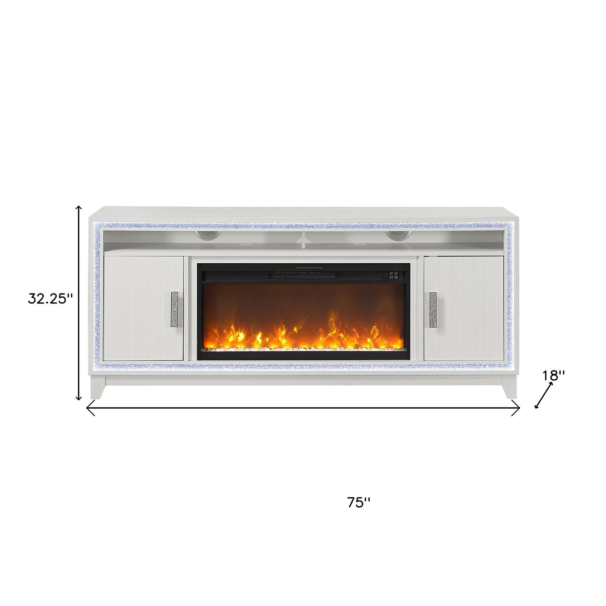 The 75-inch White and silver faux crystal and wood storage cabinet electric fireplace with led and speaker combines elegance and functionality. This electric fireplace not only offers warmth but also features a stunning design that enhances any living space. Equipped with a remote control, LED lighting, both open and concealed storage, and built-in speakers, this piece is all set to create a gentle glow, beautiful ambiance, and cozy experience. This versatile piece serves as both a decorative accent and a practical storage solution, making it an ideal addition to your home decor. Experience comfort and style all in one sophisticated unit. 32.25-inch h x 75.00-inch w x 18.00-inch d.