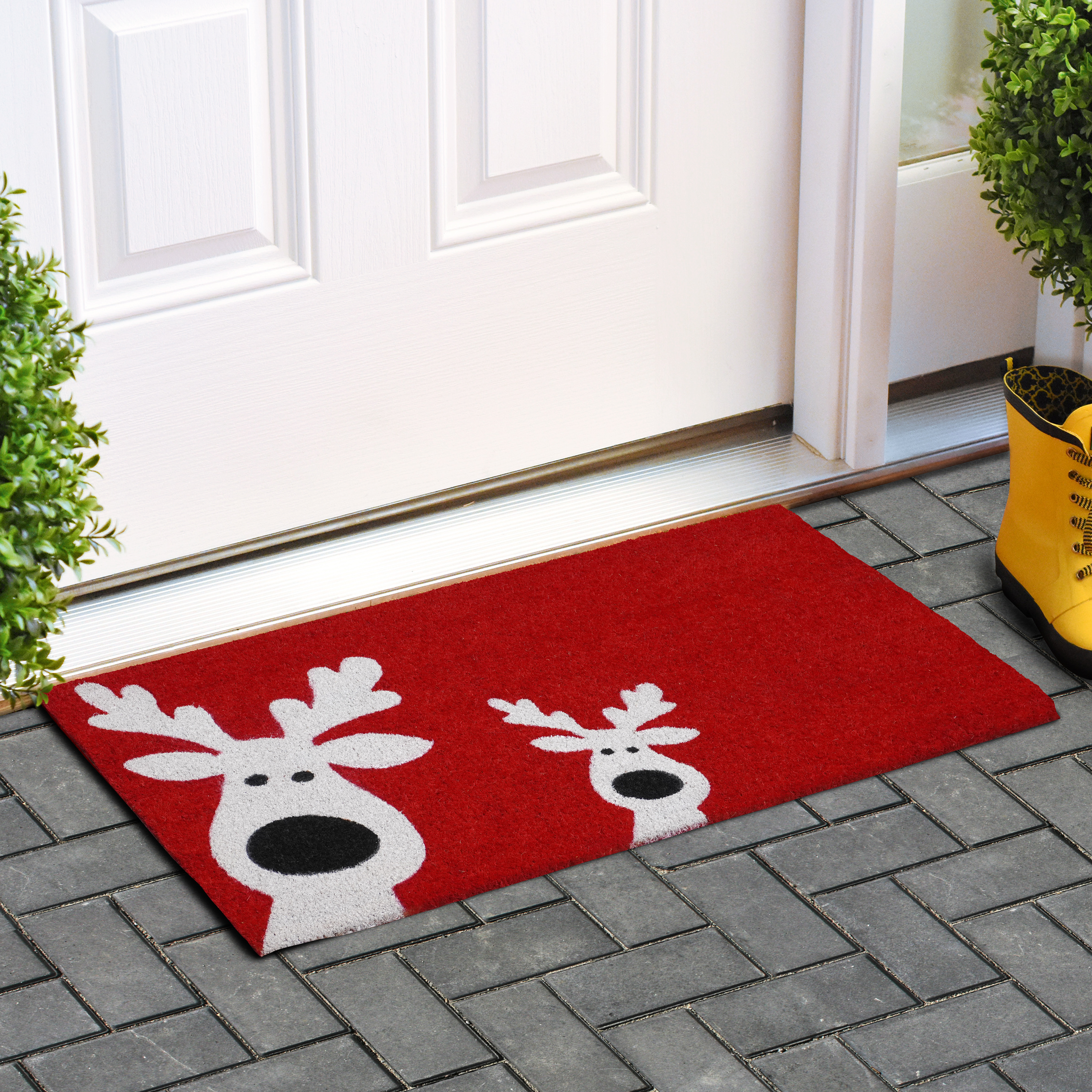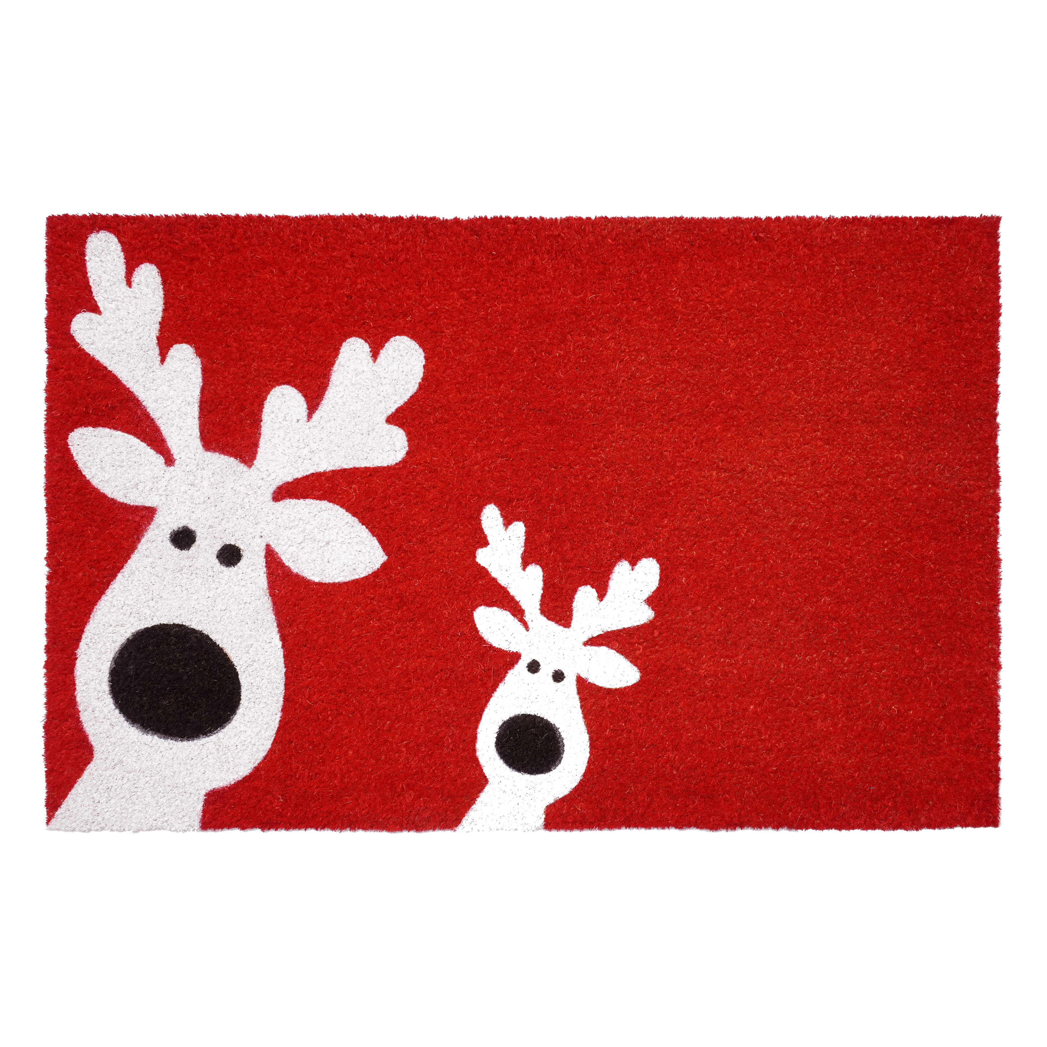 Known for it's extreme durability and ability to withstand heavy foot traffic, this 24-inch x 36-inch red white and black christmas reindeer outdoor coir door mat is an ideal option for the front door or entrance way of your home or business. Crafted from coconut husks, this mat is not only functional but is an an eco-friendly and visually appealing accessory. The naturally bristled texture of coir is an efficient way to clean dirt and mud from shoes and is easy to clean and maintain. Add this festive and decorative christmas mat to create a practical yet inviting welcome to all who enter. 24.00-inch h x 36.00-inch w x 0.60-inch d.