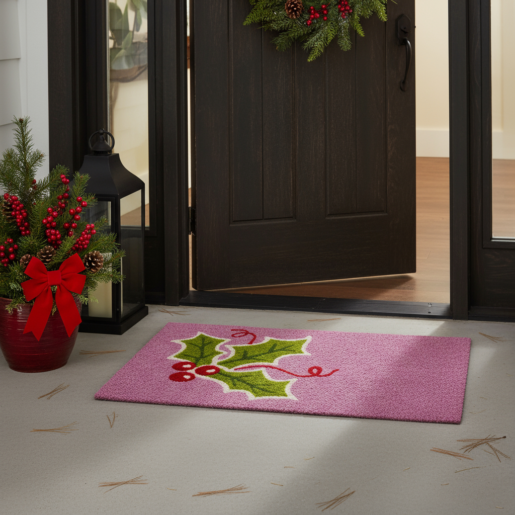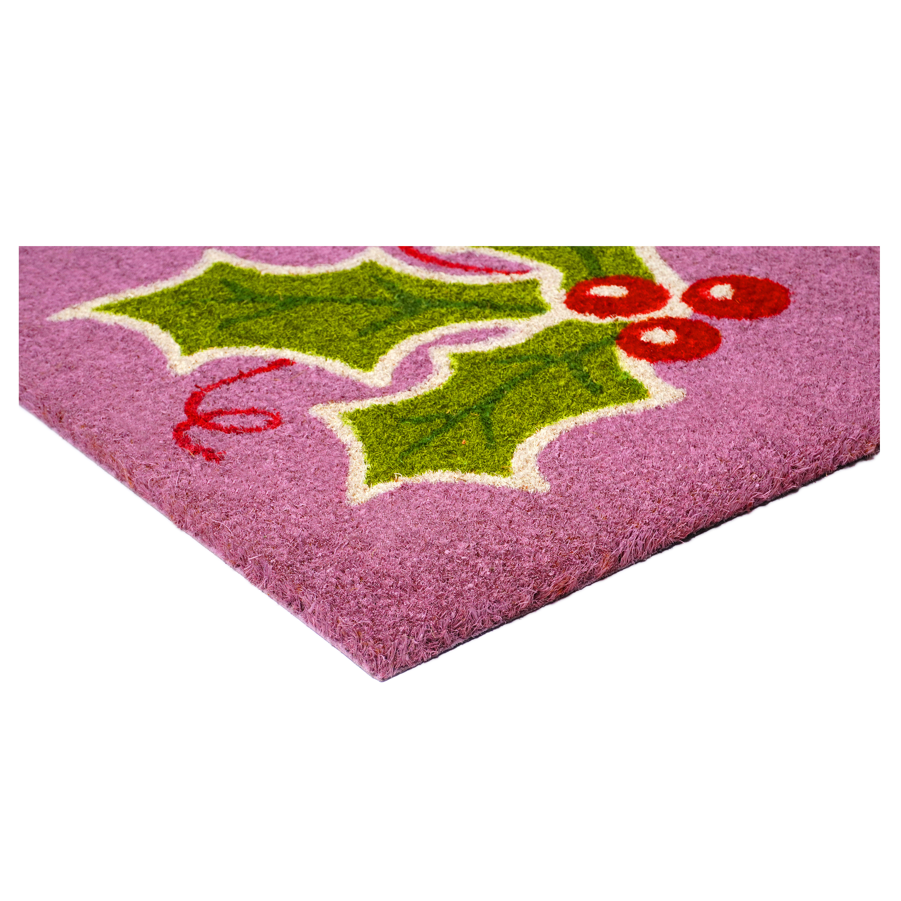 Known for it's extreme durability and ability to withstand heavy foot traffic, this 17-inch x 29-inch pink green and red christmas outdoor coir door mat is an ideal option for the front door or entrance way of your home or business. Crafted from coconut husks, this mat is not only functional but is an an eco-friendly and visually appealing accessory. The naturally bristled texture of coir is an efficient way to clean dirt and mud from shoes and is easy to clean and maintain. Add this festive and decorative christmas mat to create a practical yet inviting welcome to all who enter. 17.00-inch h x 29.00-inch w x 0.60-inch d.