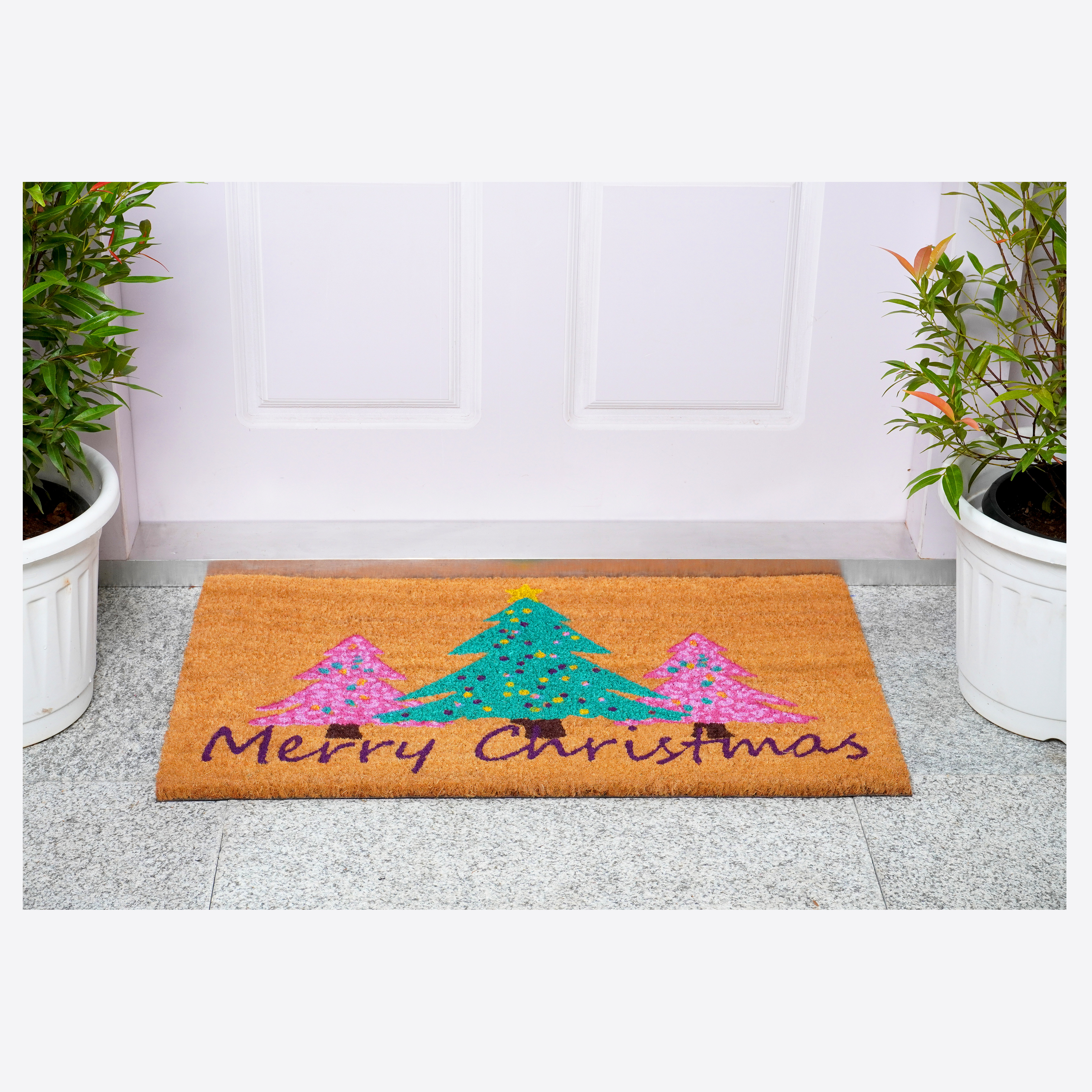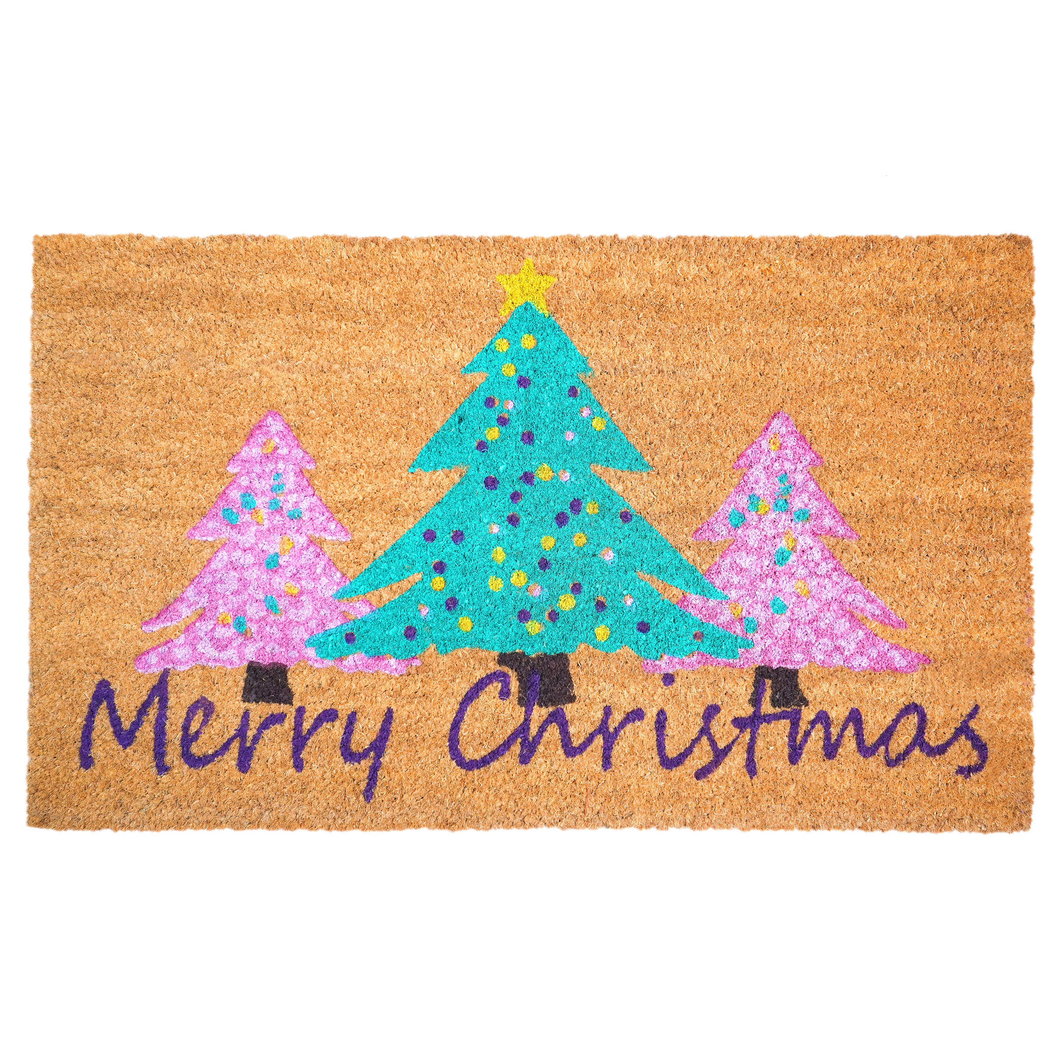 christmas outdoor coir door mat, brown green pink christmas trees, green pink christmas trees, trees merry christmas outdoor coir, 24" X 36" brown green pink christmas |