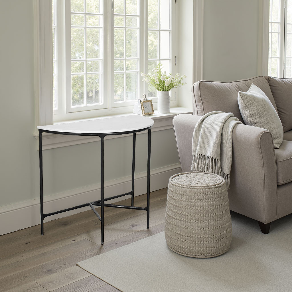 Transform your home with our elegant and versatile 36-inch white and black genuine marble and iron half moon console table. Don't miss out on the perfect finishing touch for your home. With this half moon table, you can get the length of a rectangular table without the harsh corners and you get a little more floor space back. This console table features a secure and solid white, genuine marble top. In addition to a great top, our console table has a iron four leg base, meaning that it is well-built and secure. Ideal for living rooms, bedrooms, home offices, and lounge areas, this console table is not only good looking but multi-functional and practical addition to your space. 30.00-inch h x 36.00-inch w x 18.00-inch d.