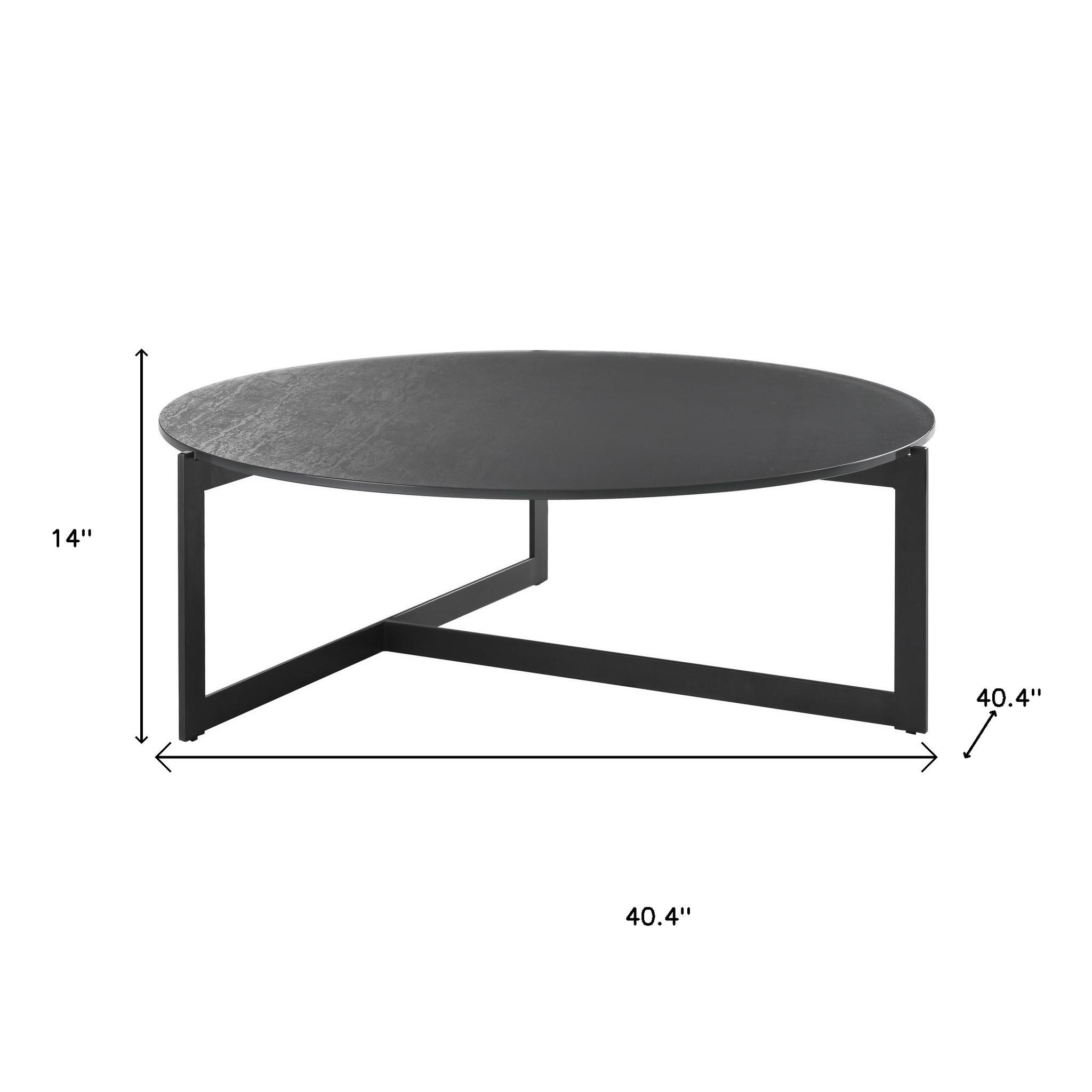 This stylish 40-inch gray and black glass and iron round frame coffee table is not only practical, but good looking and built to last. A black iron frame is finished off with a gray glass top that is the epitome of quality construction and design. If you're looking for something that can fit into a living area, bedroom, or office, this coffee table is for you. 14.00-inch h x 40.40-inch w x 40.40-inch d.