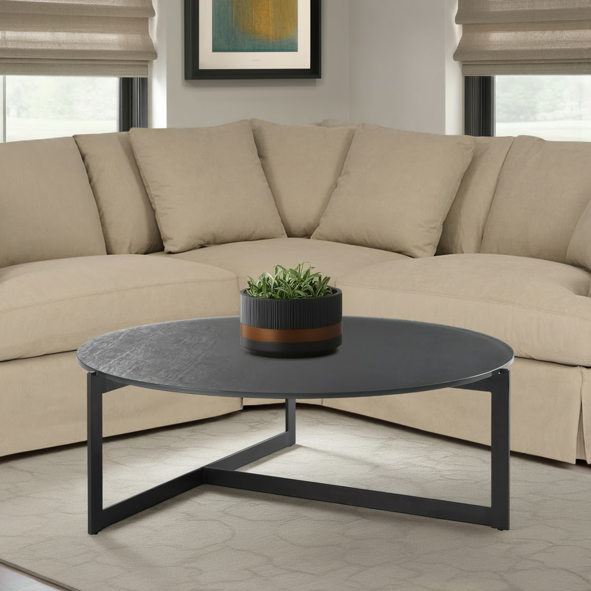 iron round frame coffee table, frame coffee table, 40" gray black glass, 40" gray black glass iron, black glass iron round frame |